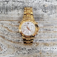 This is a luxurious 45mm Versace Greca Chrono watch, boasting a sleek stainless-steel and gold-tone design with a black bezel. The timepiece features a clean white dial, weighs 122.00dwt, and shows minimal signs of use. See photos for details!