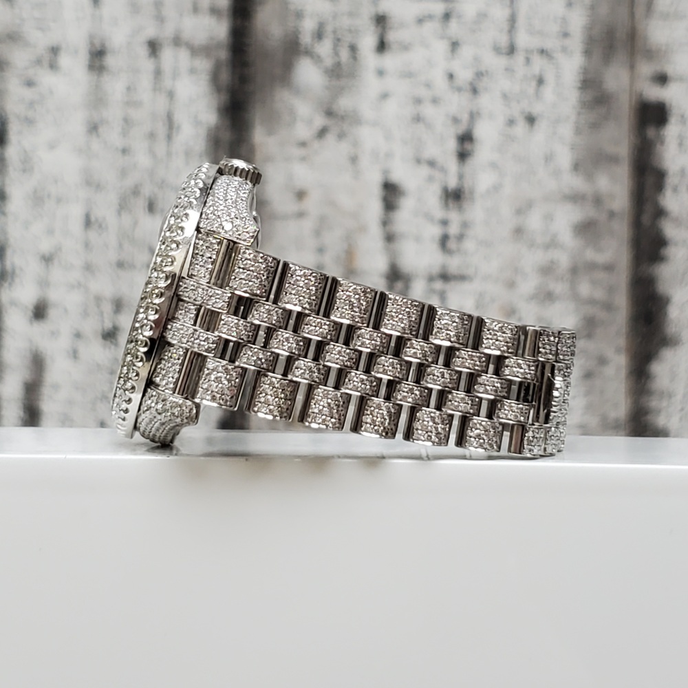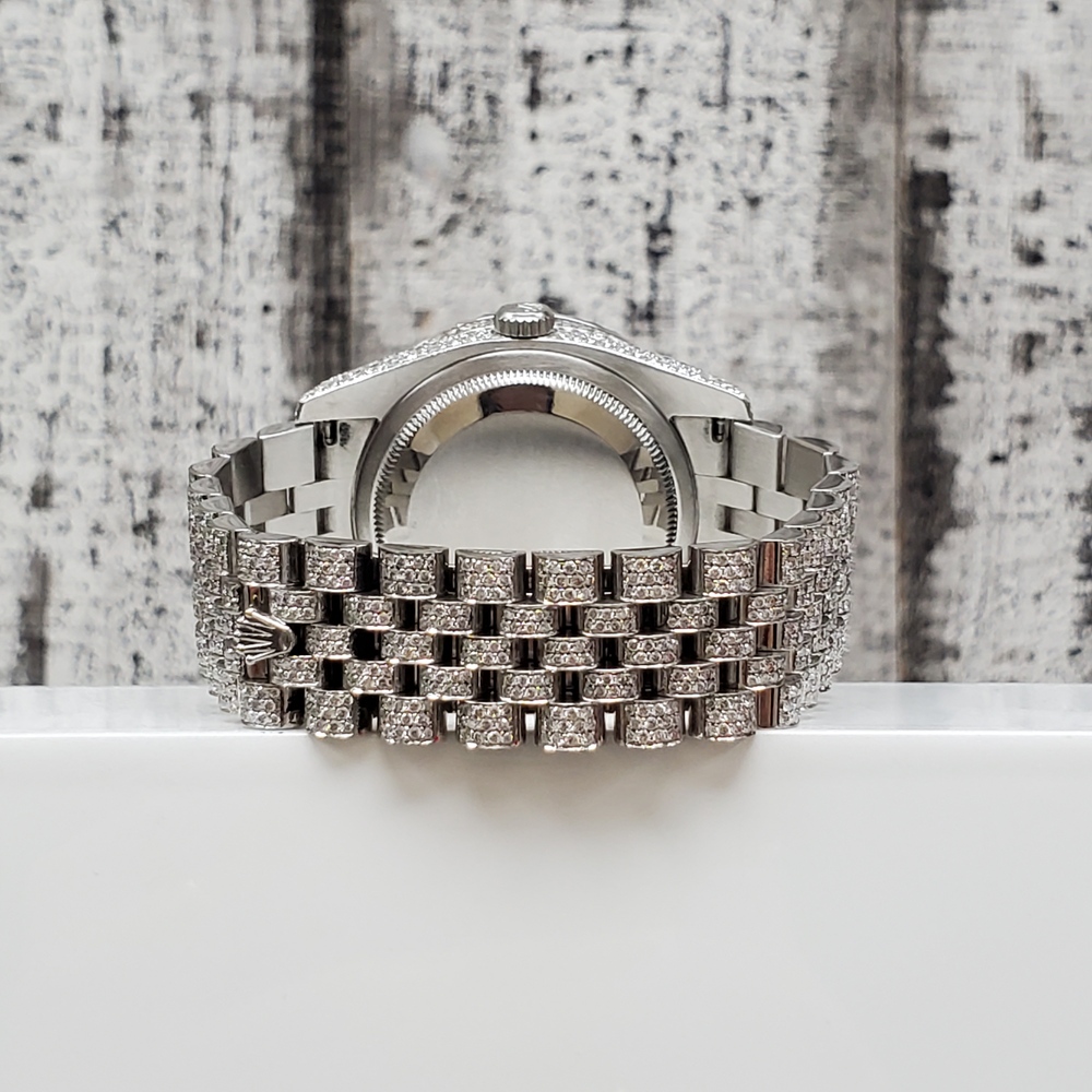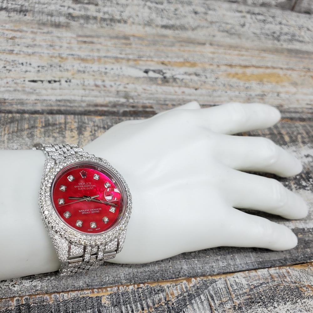 This is a 2008-2009 Rolex DJ 36 116200 model that's elegantly customized with an estimated 13ctw diamond encrusting. Features include a silver dial with red accented diamond markers. However, it falls short on links and due to the aftermarket modifications, the waterproof guarantee is not assured.
