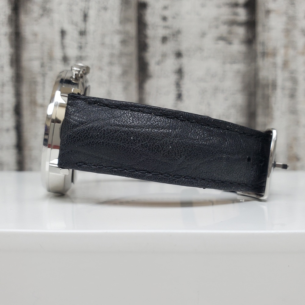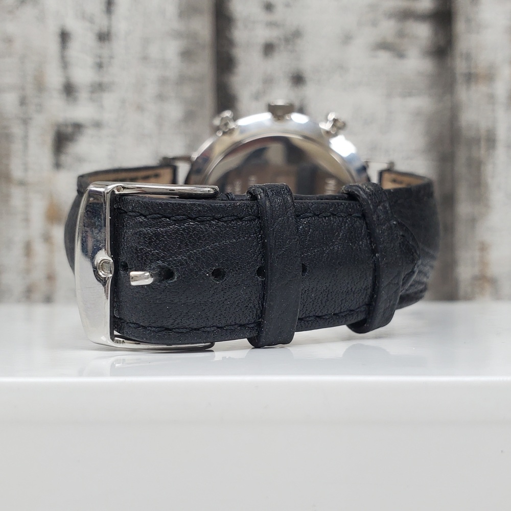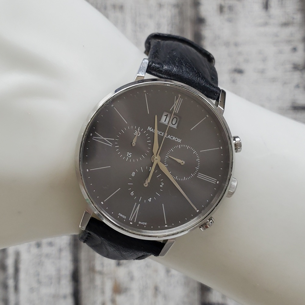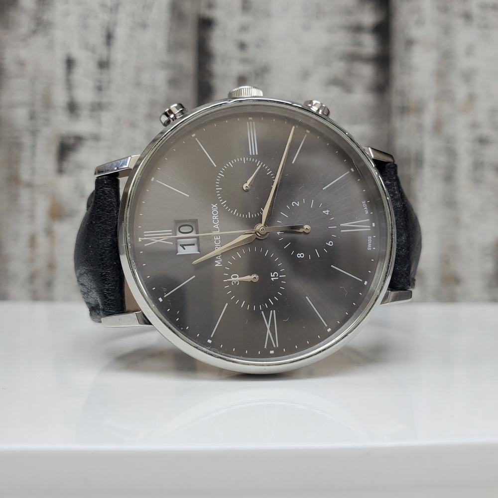 A stainless steel Maurice Lacroix Eliros Chronograph 40mm watch with elegant black leather strap, slightly used with minor signs of wear.