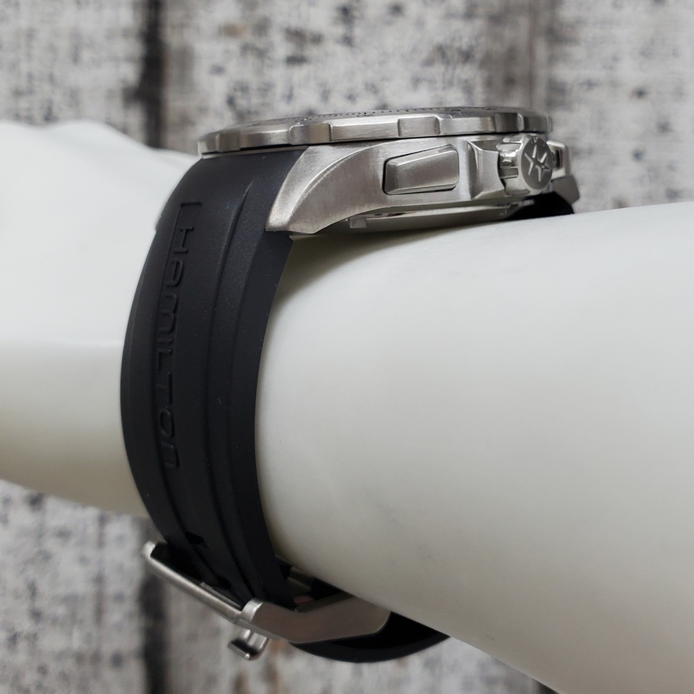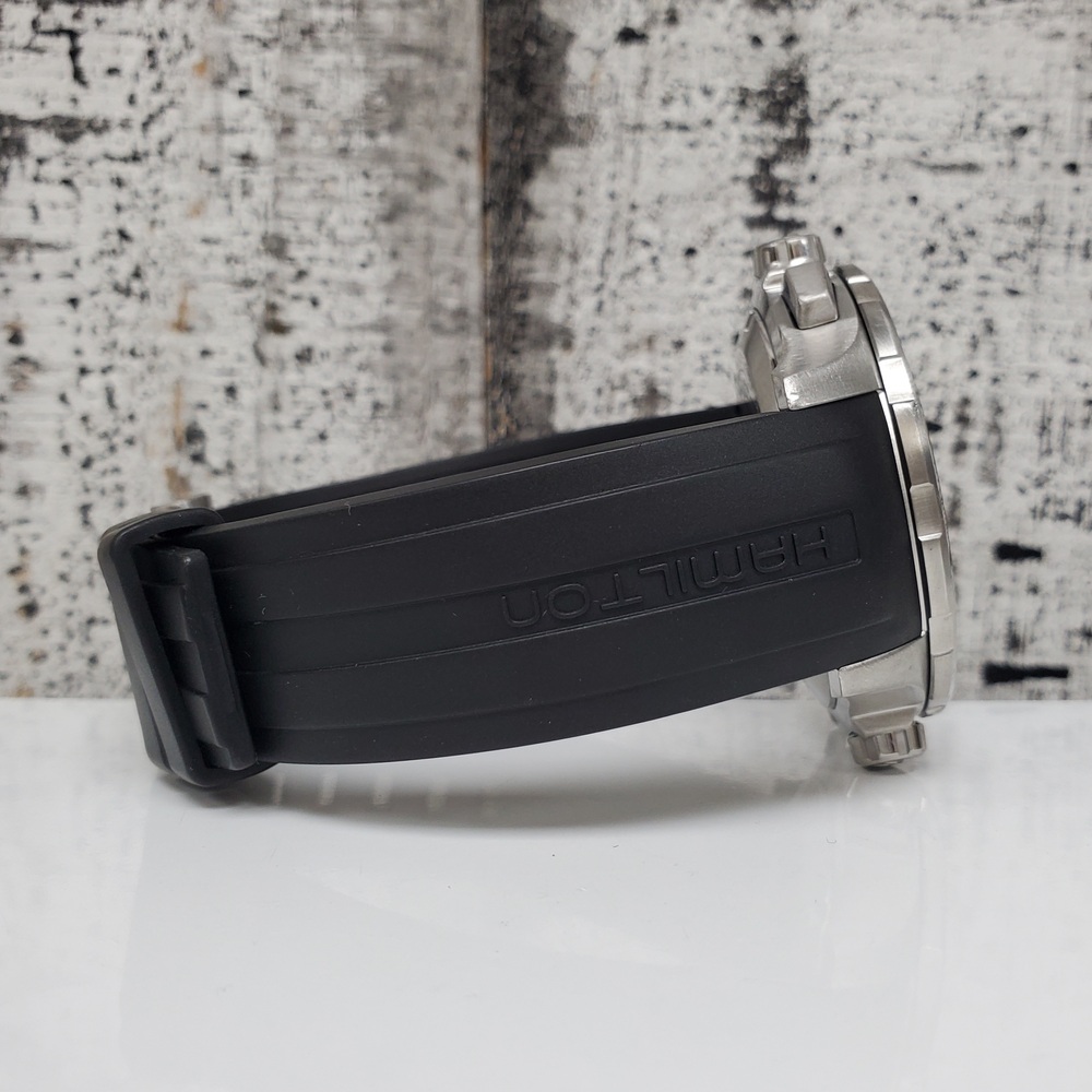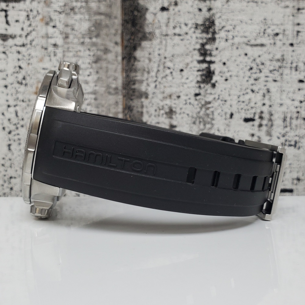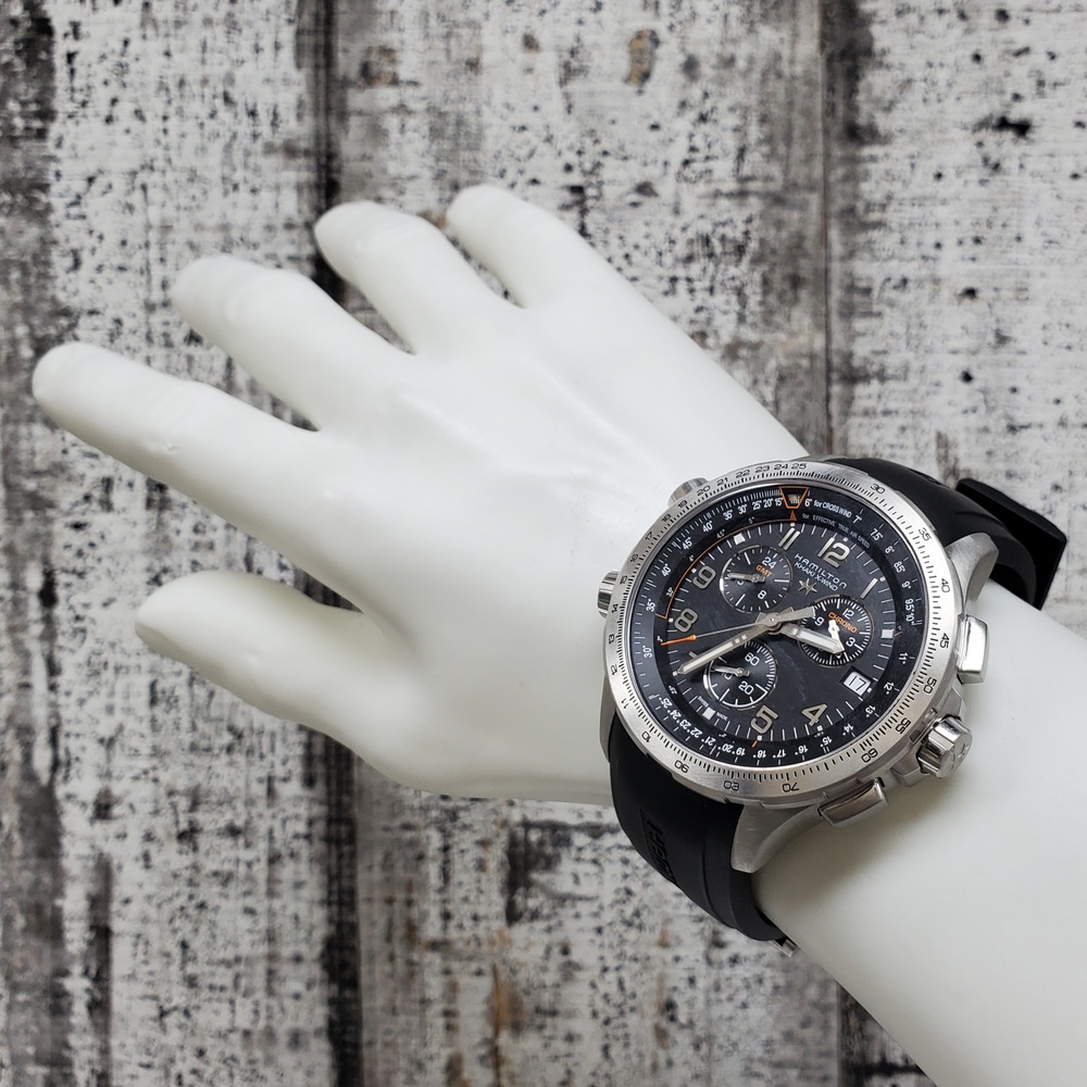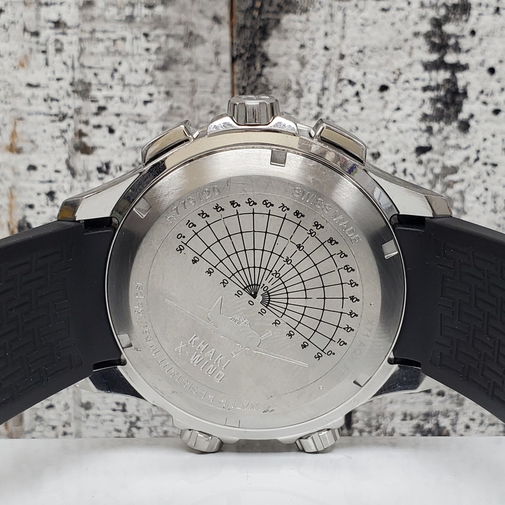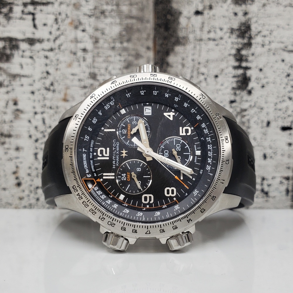 This sophisticated Hamilton Khaki X-Wind GMT Men's Watch features a striking black dial, chronograph, and fashionable black rubber strap. Displaying normal signs of wear, it weighs 84.9dwt. Its H779120 model number denotes its unique style and quality. Ideal for the modern man.