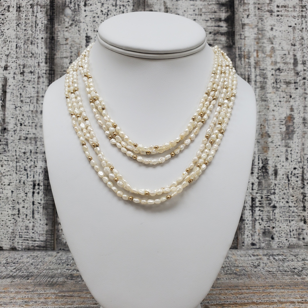 We have this stunning 14K 3-Strands of Seed Pearls w/ Gold Beads Necklaces For sale!