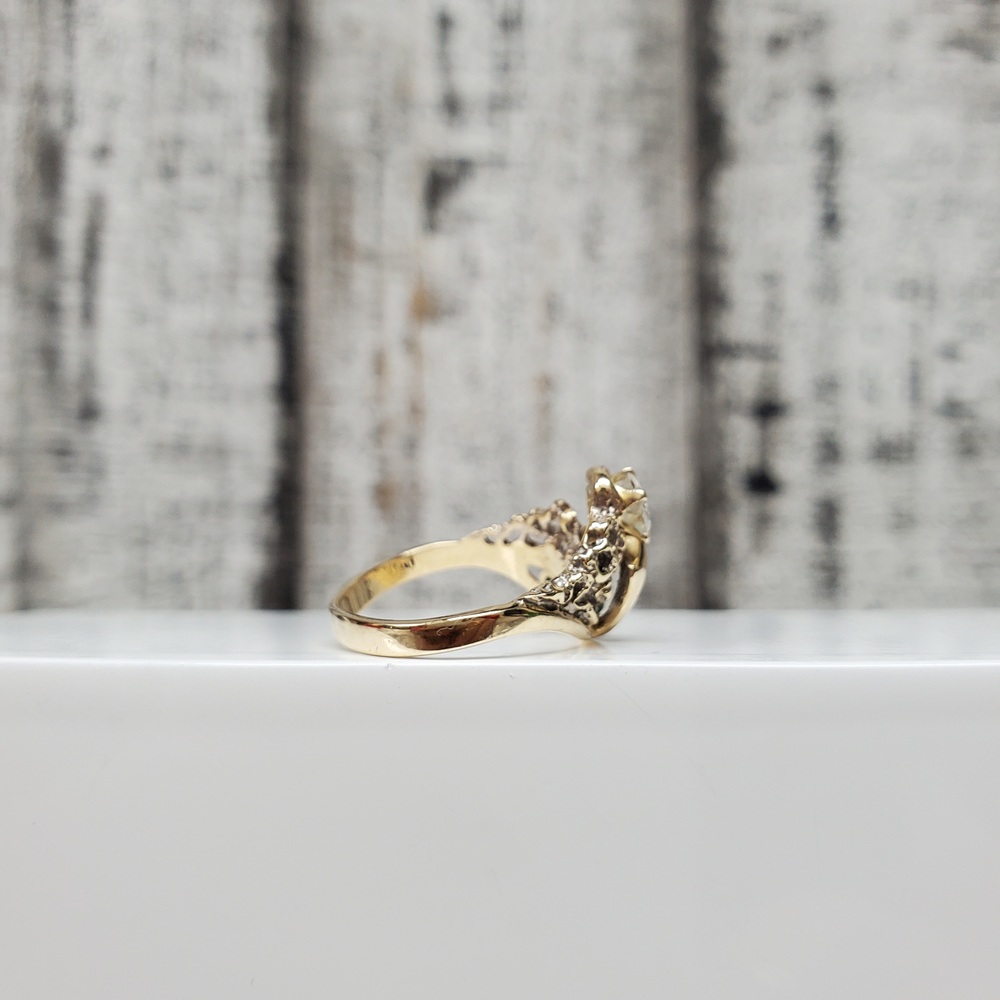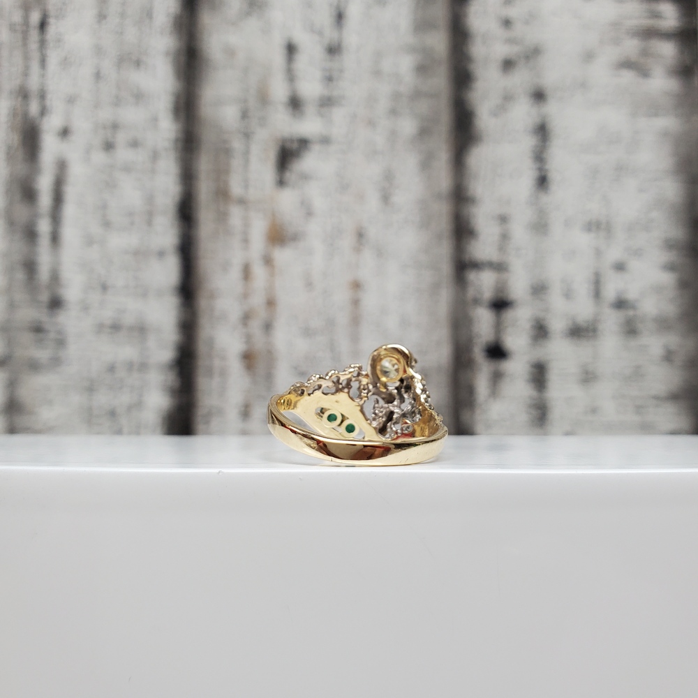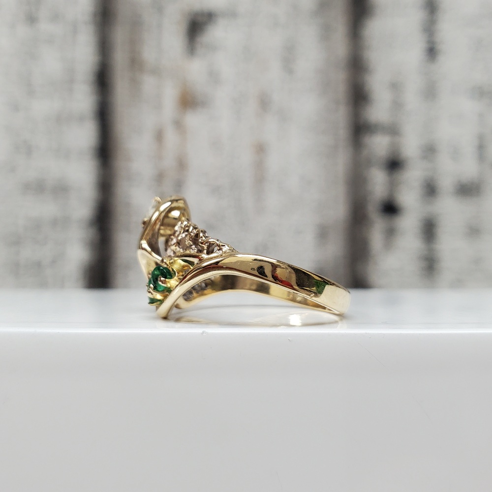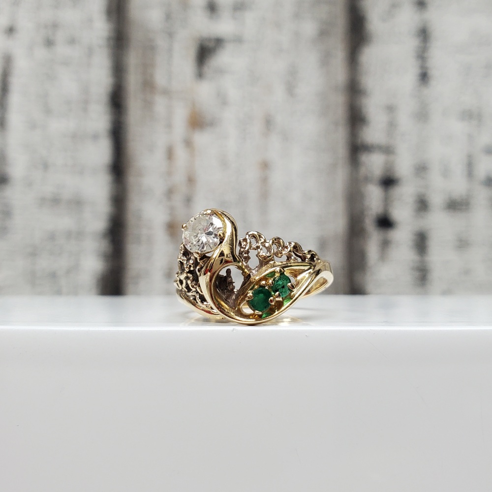 We have this stunning 14K Diamond + Emeralds Fancy Ring for sale!
