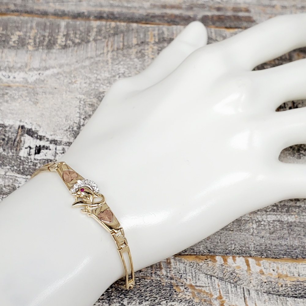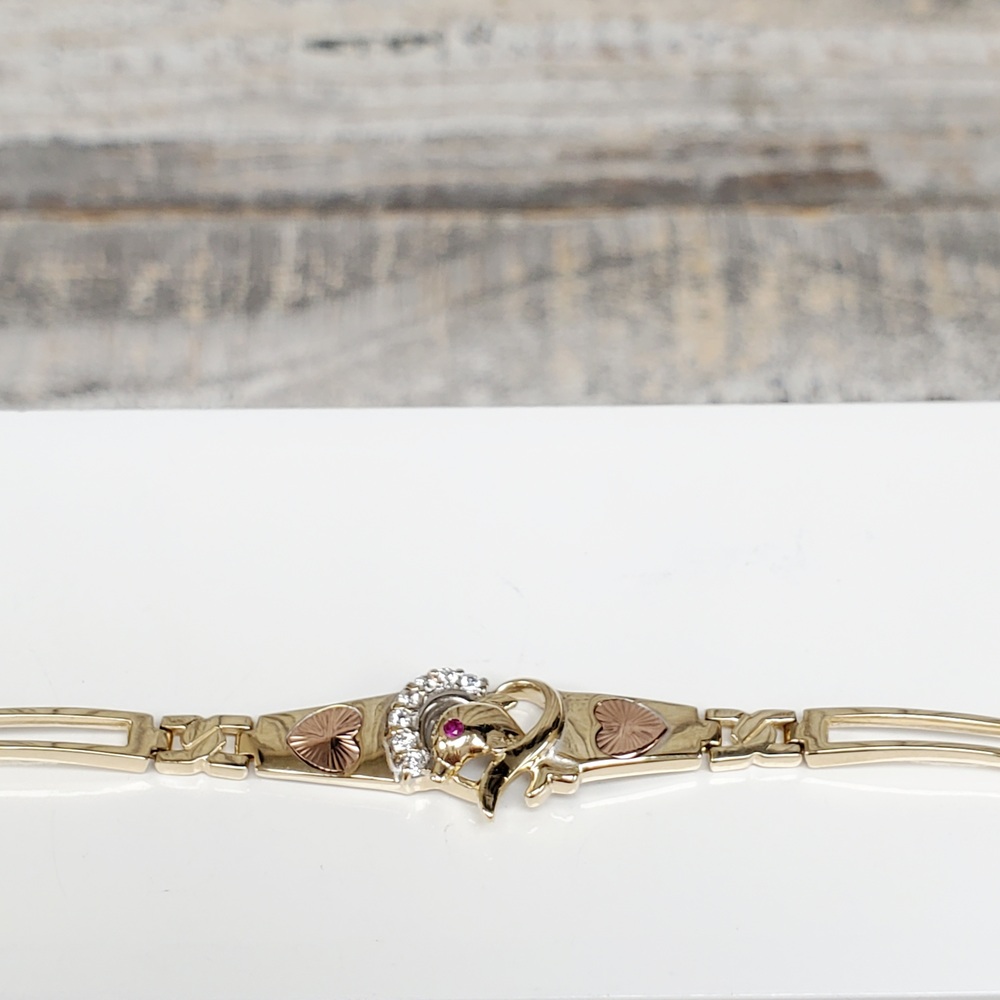 We have this stunning 14K Dolphin + Heart + CZ + Synth Ruby Bracelet for sale!