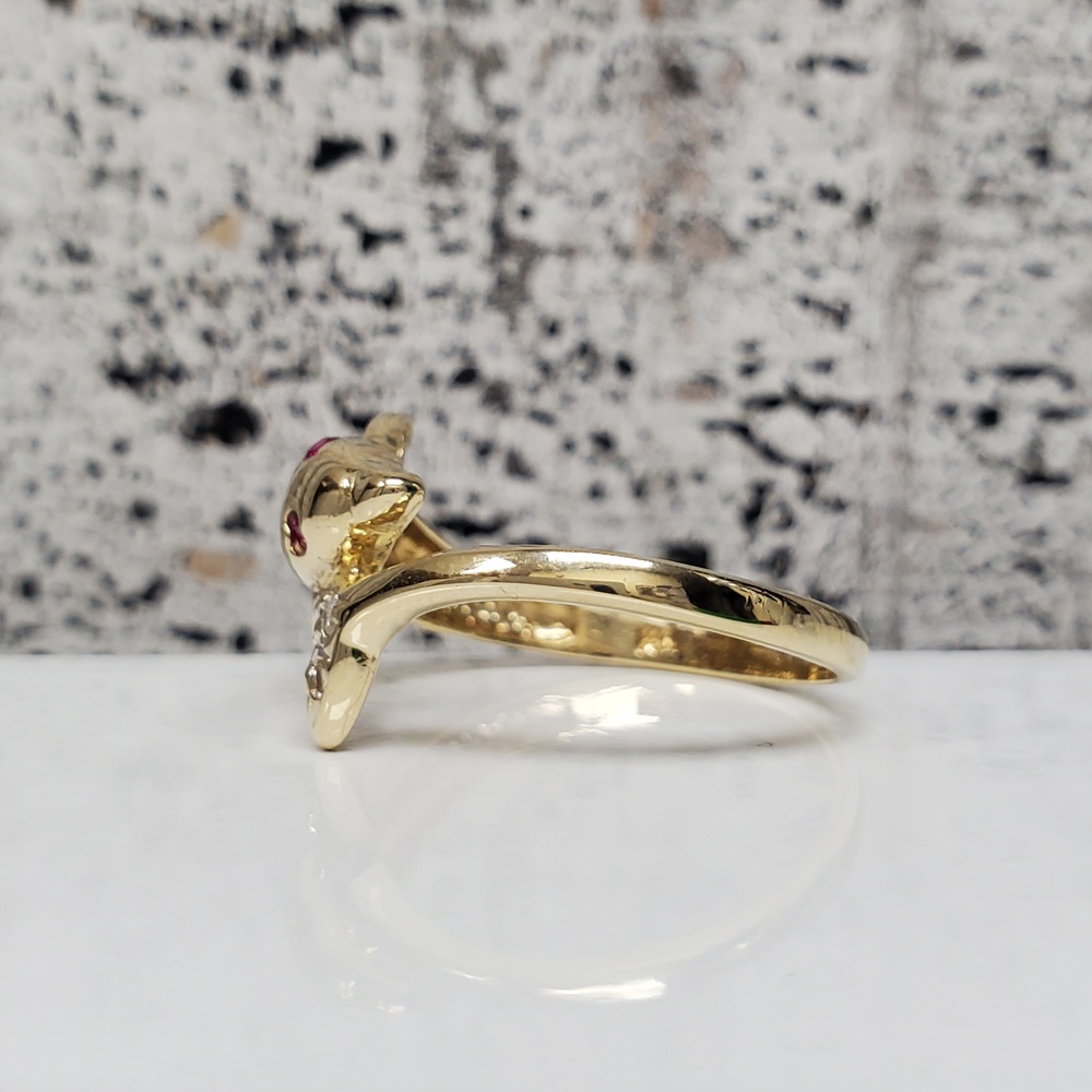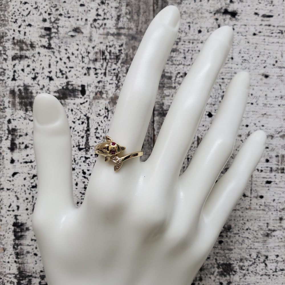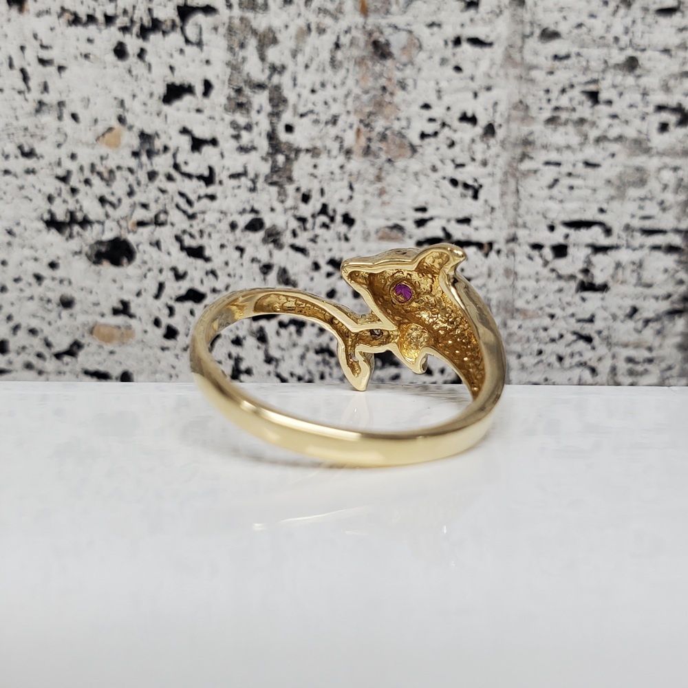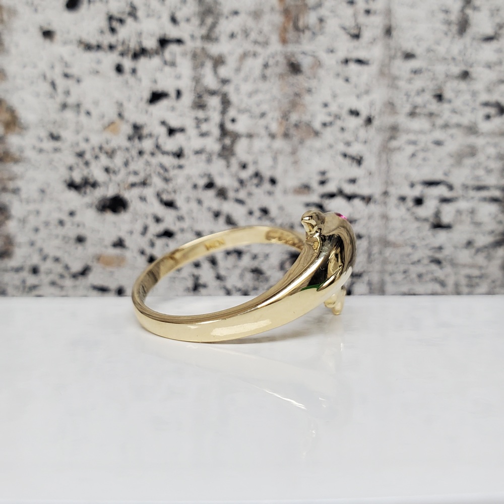 We have this stunning 14K Dolphin Ring w/ Synth Ruby Eyes + CZ For sale!