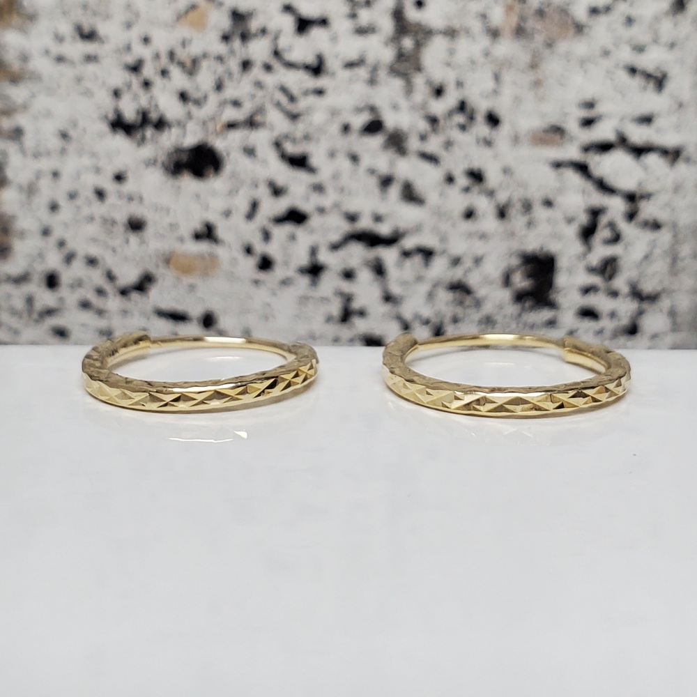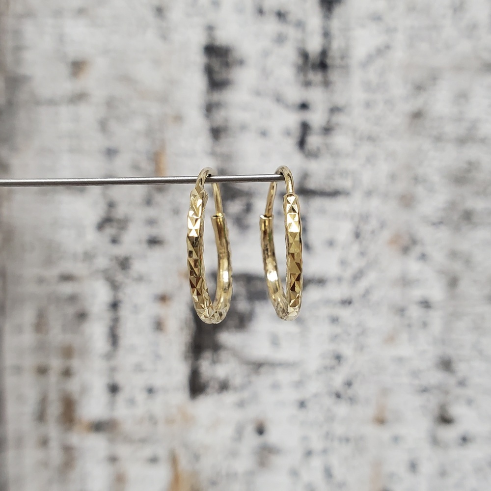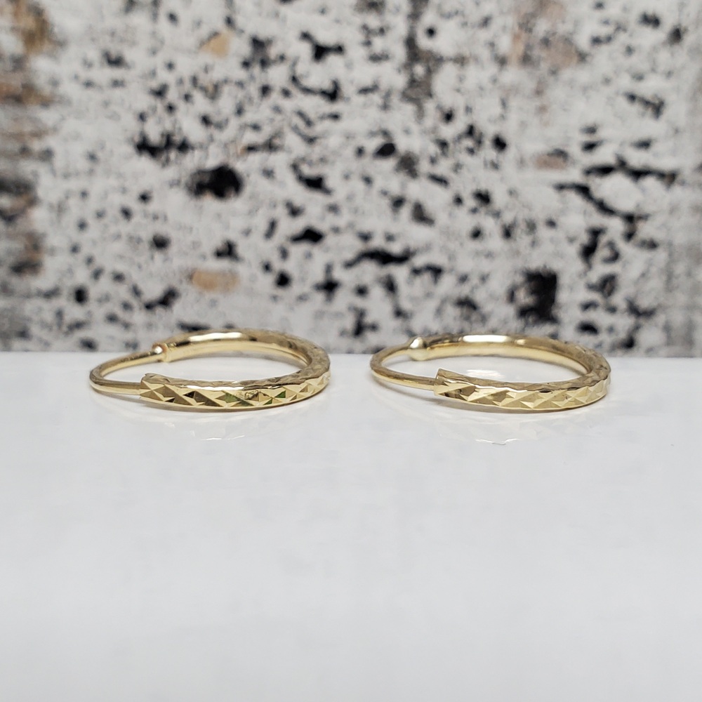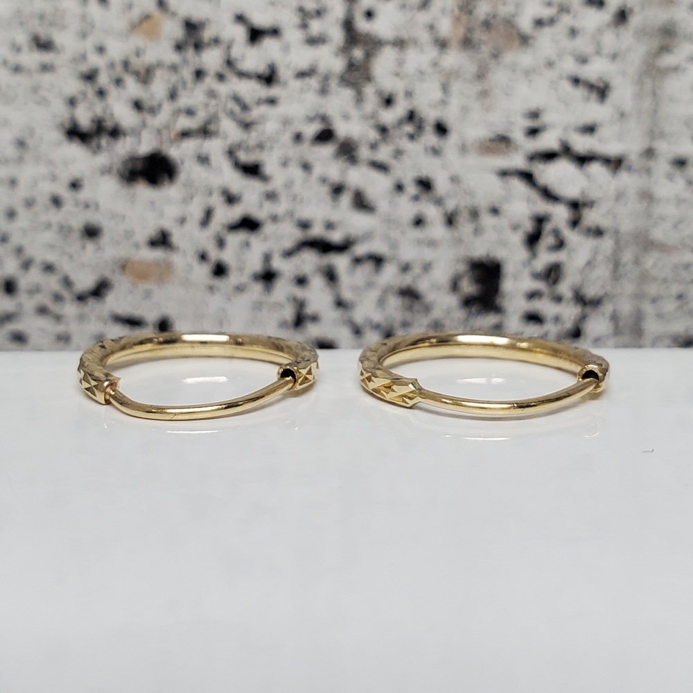 We have this stunning 14K Fancy Cut Small Hoop Earrings For sale!
