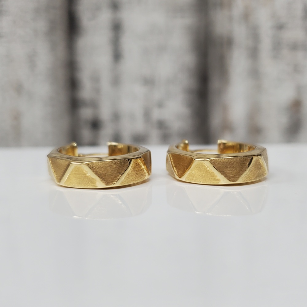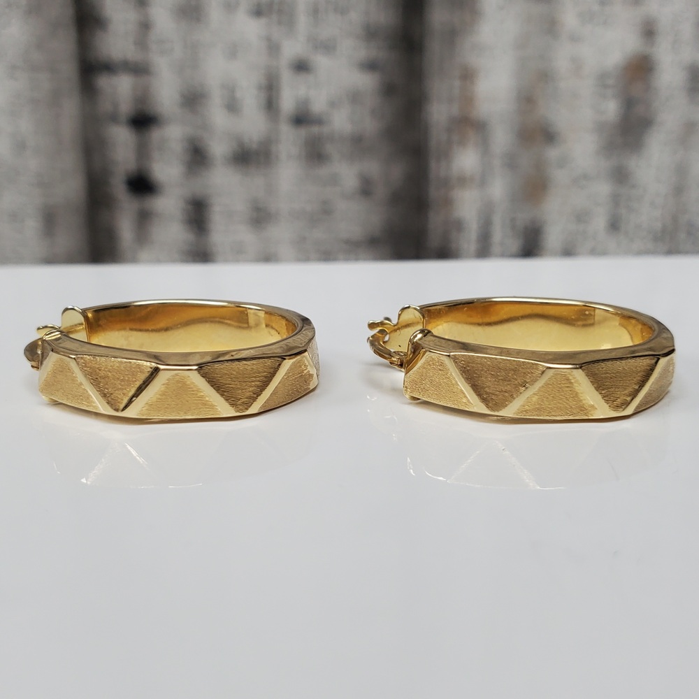 We have this stunning 14K Fancy Design Hollow Hoop Earrings for sale!