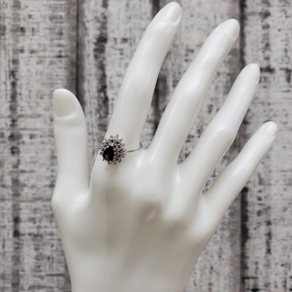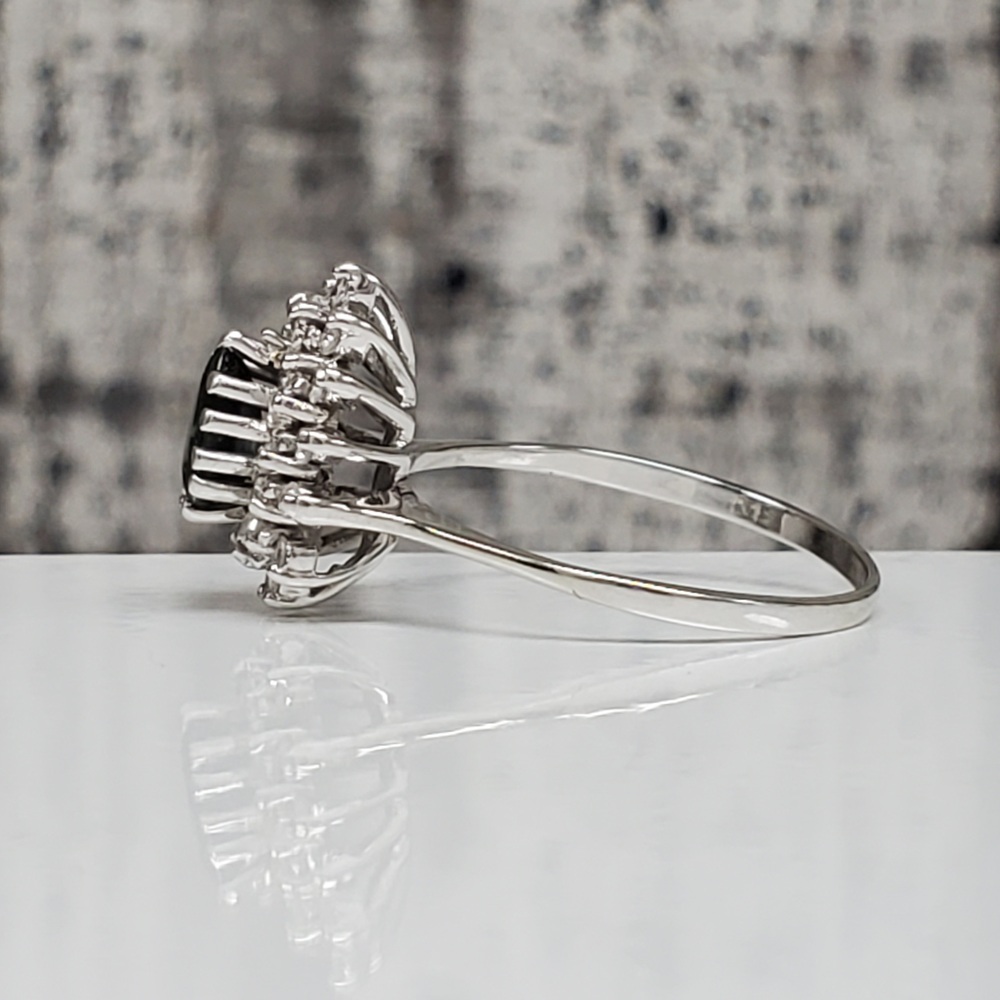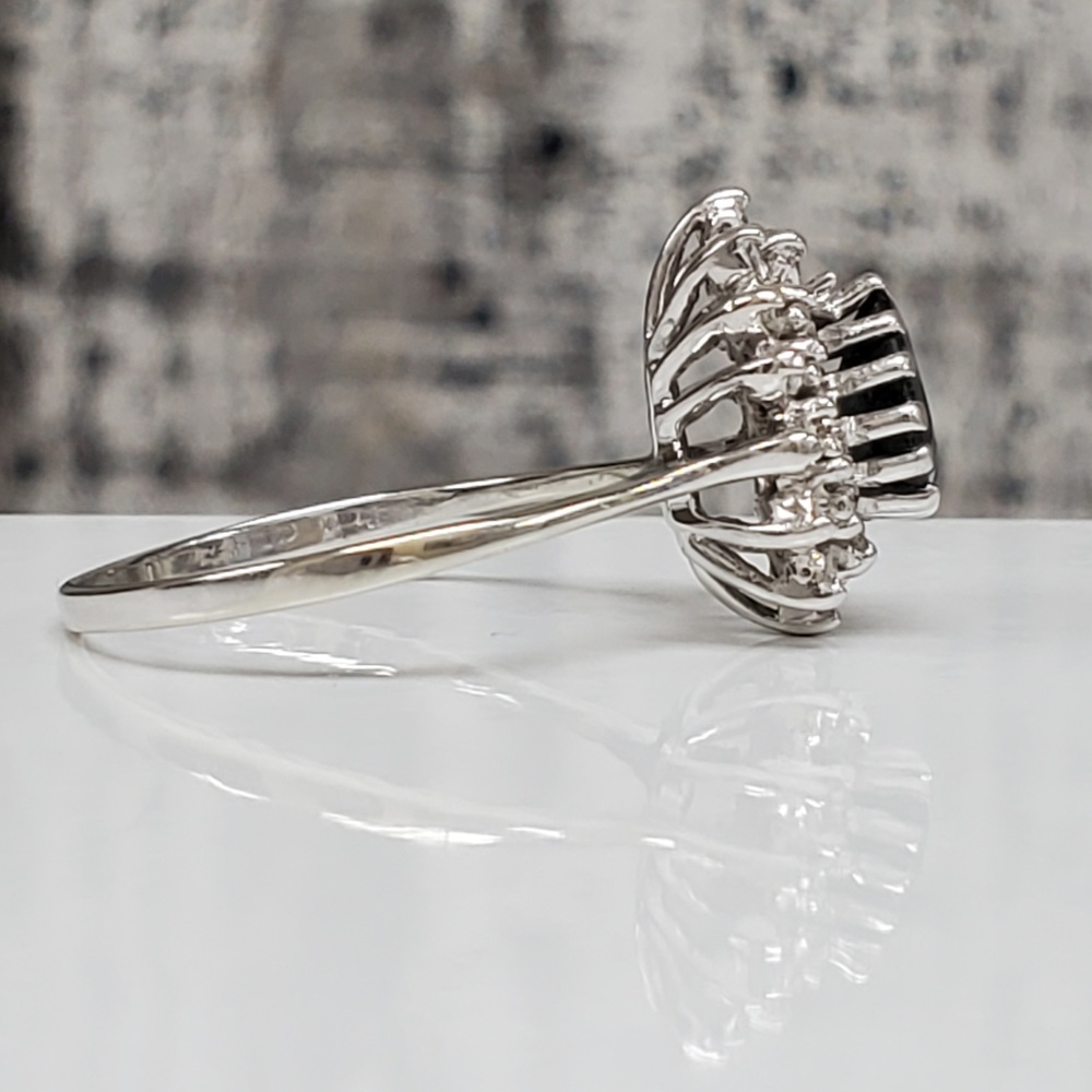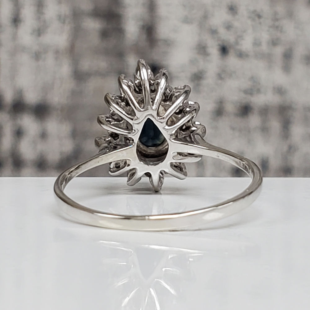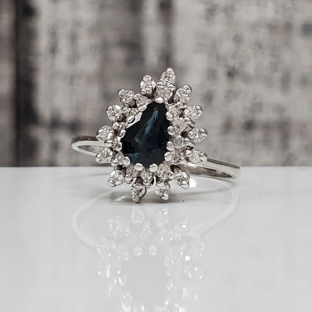 We have this stunning 14K Pear Sapphire + Diamond Ring For sale!