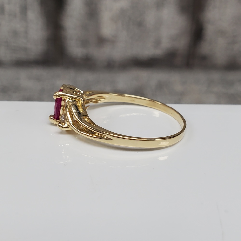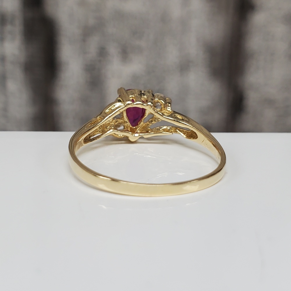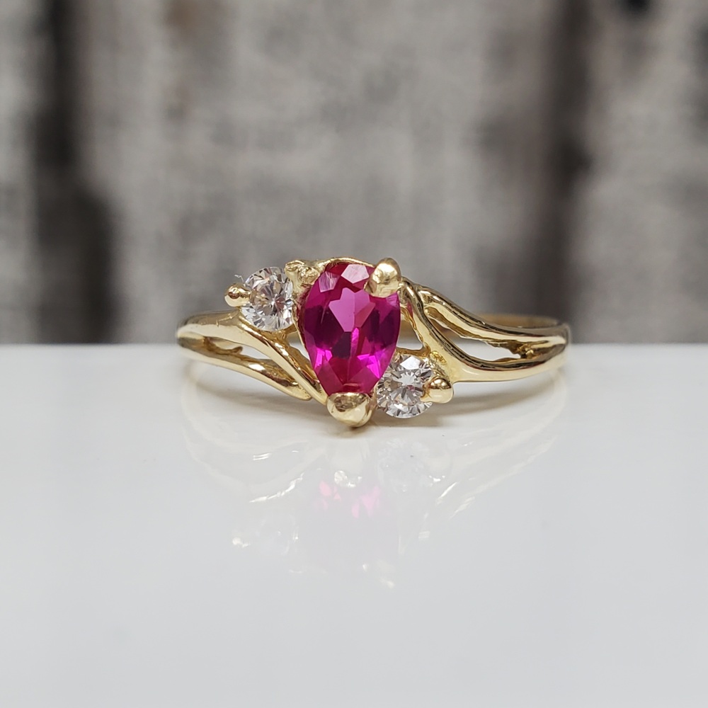 We have this stunning 14K Pear Synth Ruby + CZ Ring For sale!