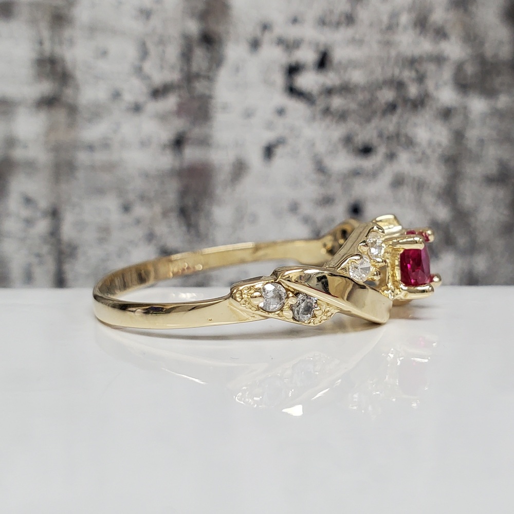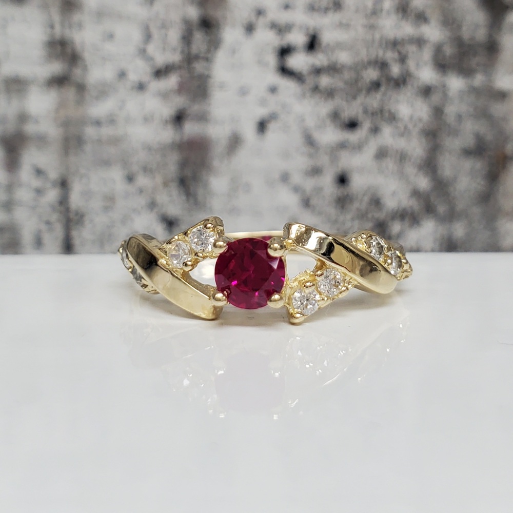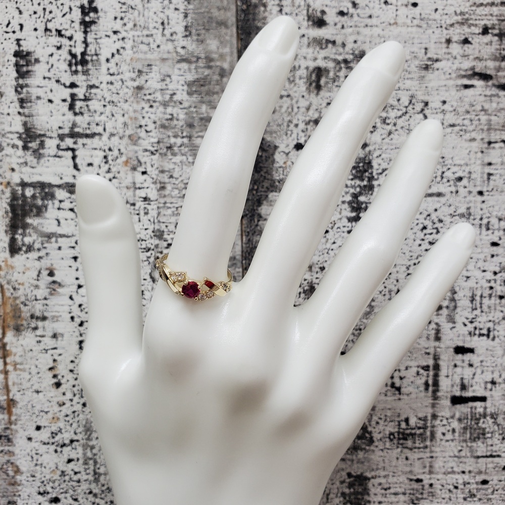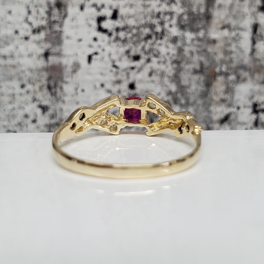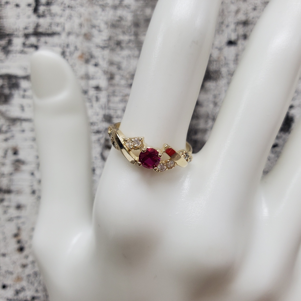 We have this stunning 14K Synth Ruby + CZ Fancy Design Ring For sale!