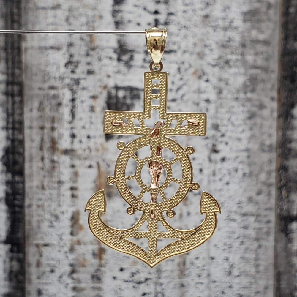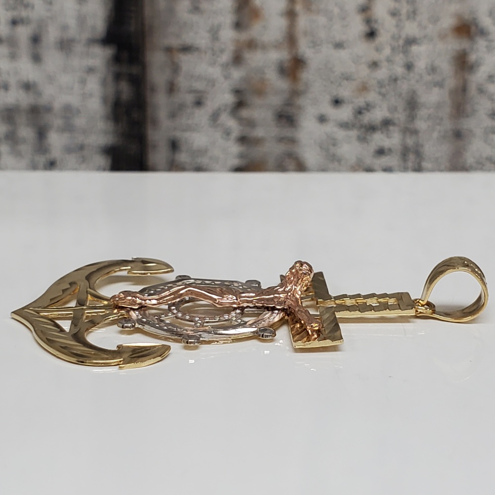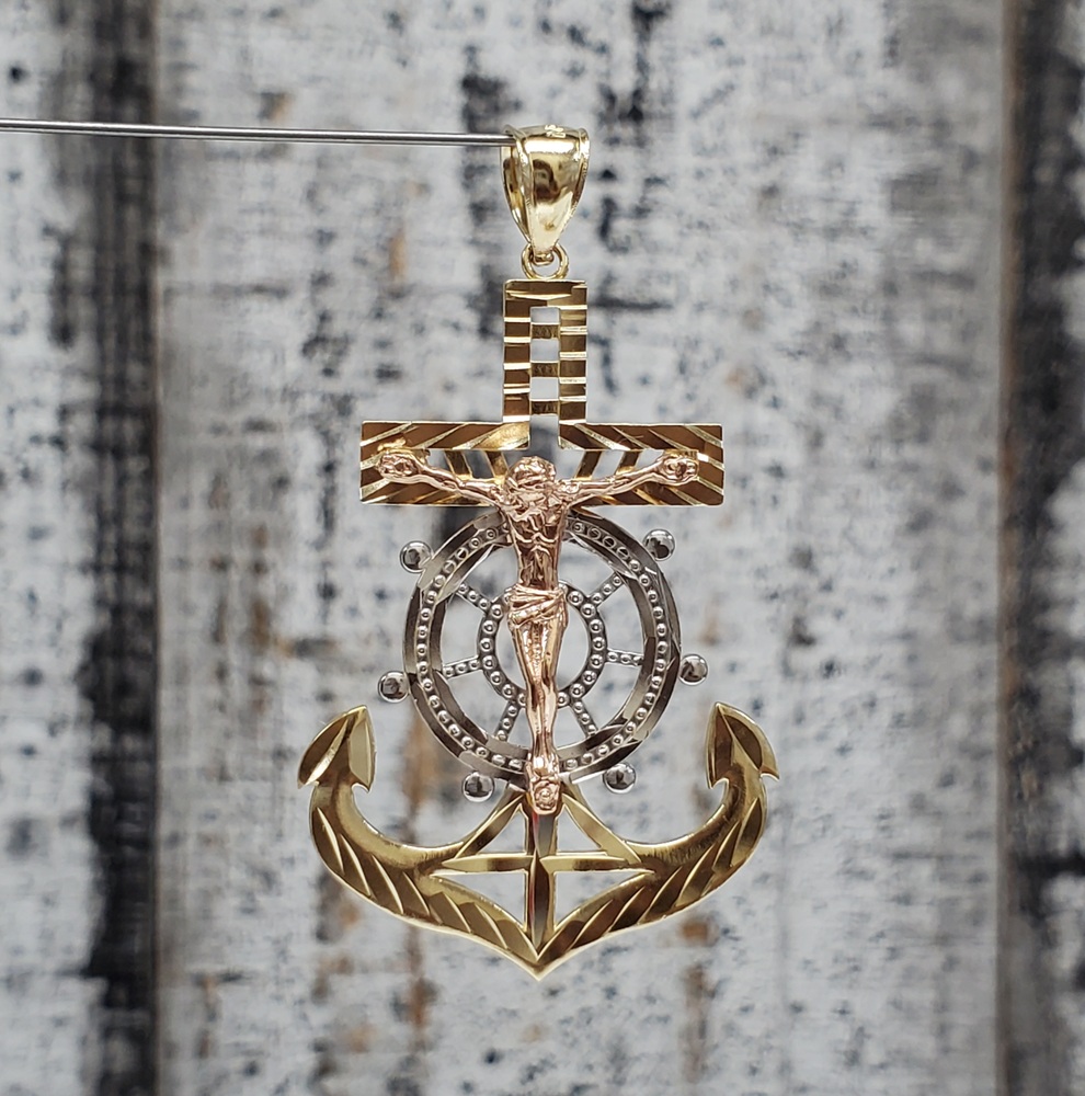 We have this stunning 14K TriColor Crucifix Anchor Cross Jesus Religious Pendant For sale!