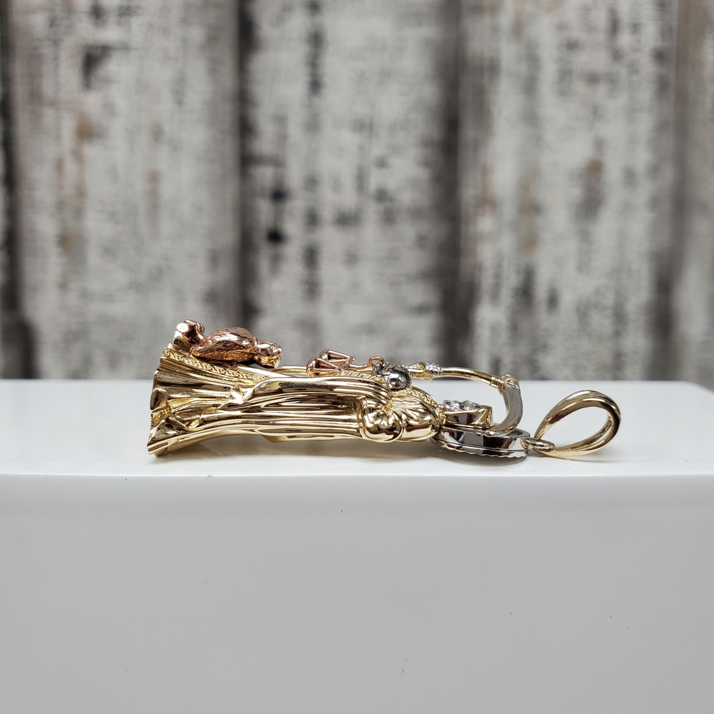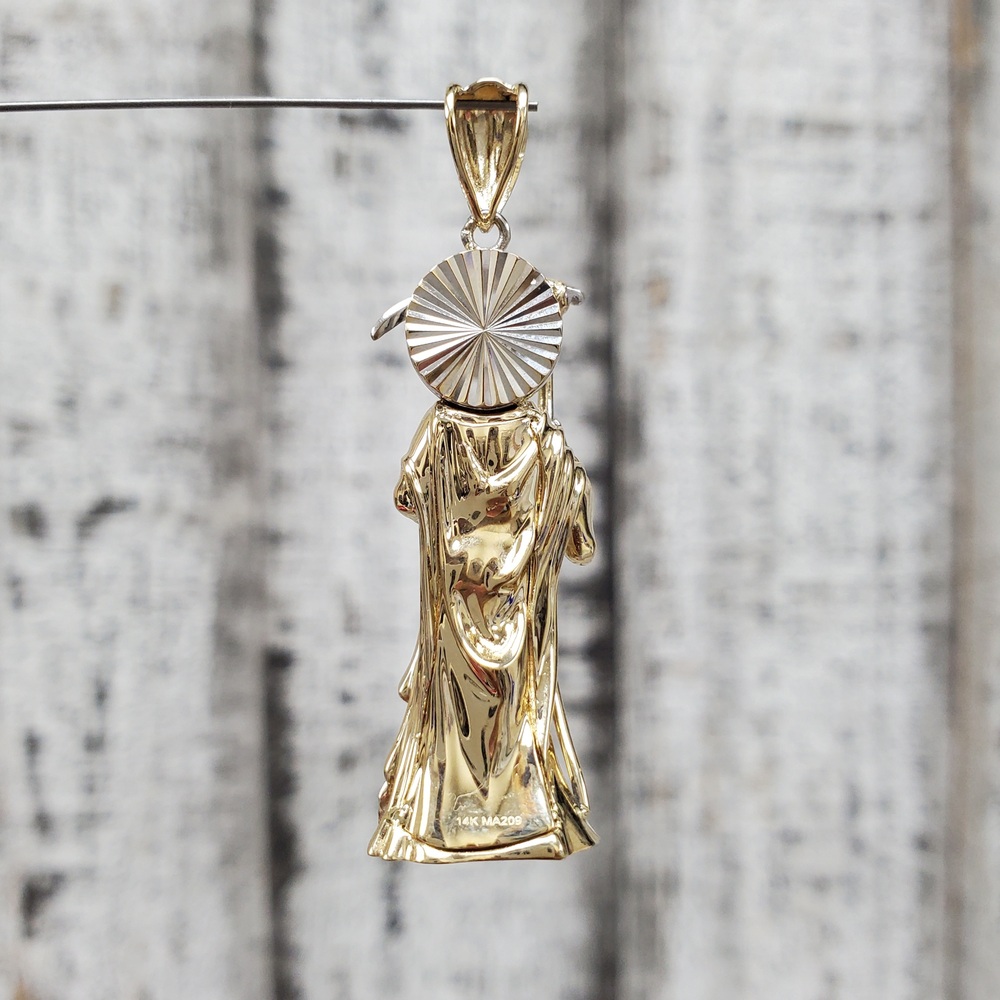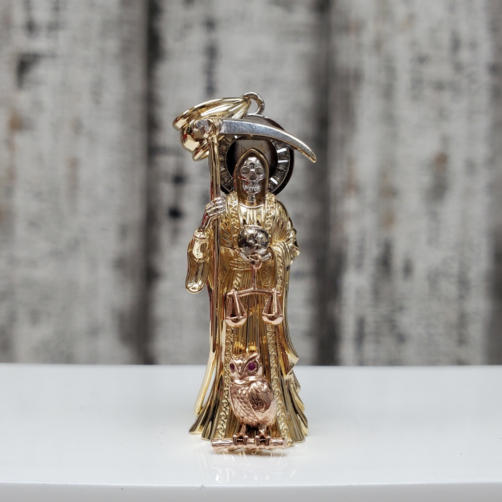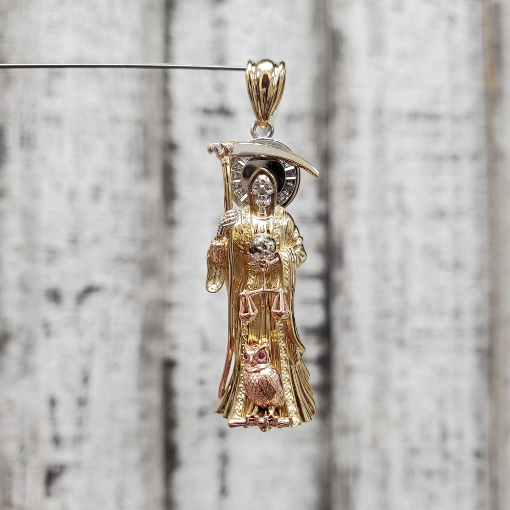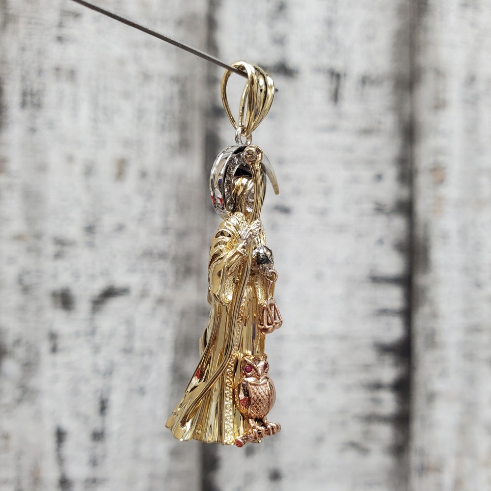 We have this stunning 14K TriColor Santa Muerte / Grim Reaper Religious Pendant w/ CZ + Synth Rubies on Owls Eyes for sale!