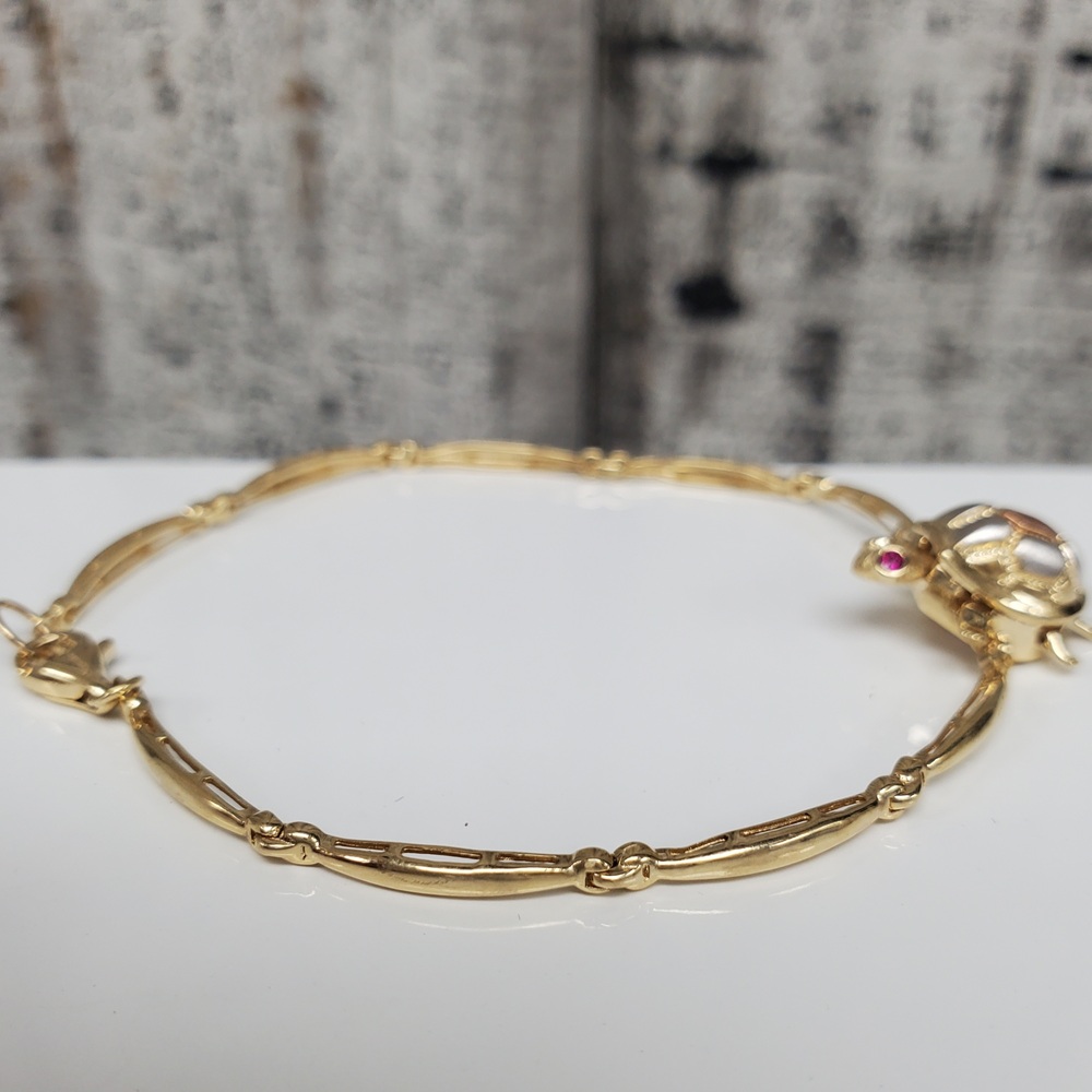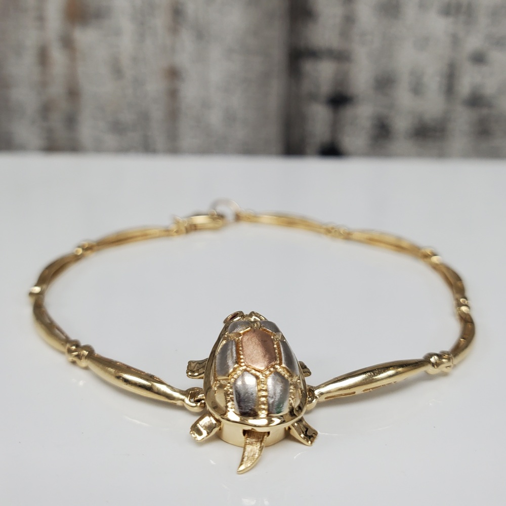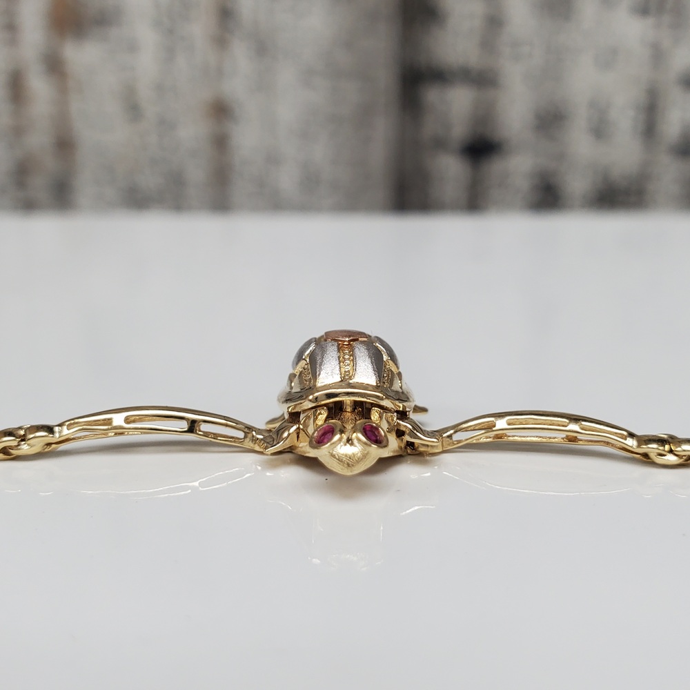 We have this stunning 14K TriColor Turtle Bracelet w/ Synth Ruby Eyes For sale!