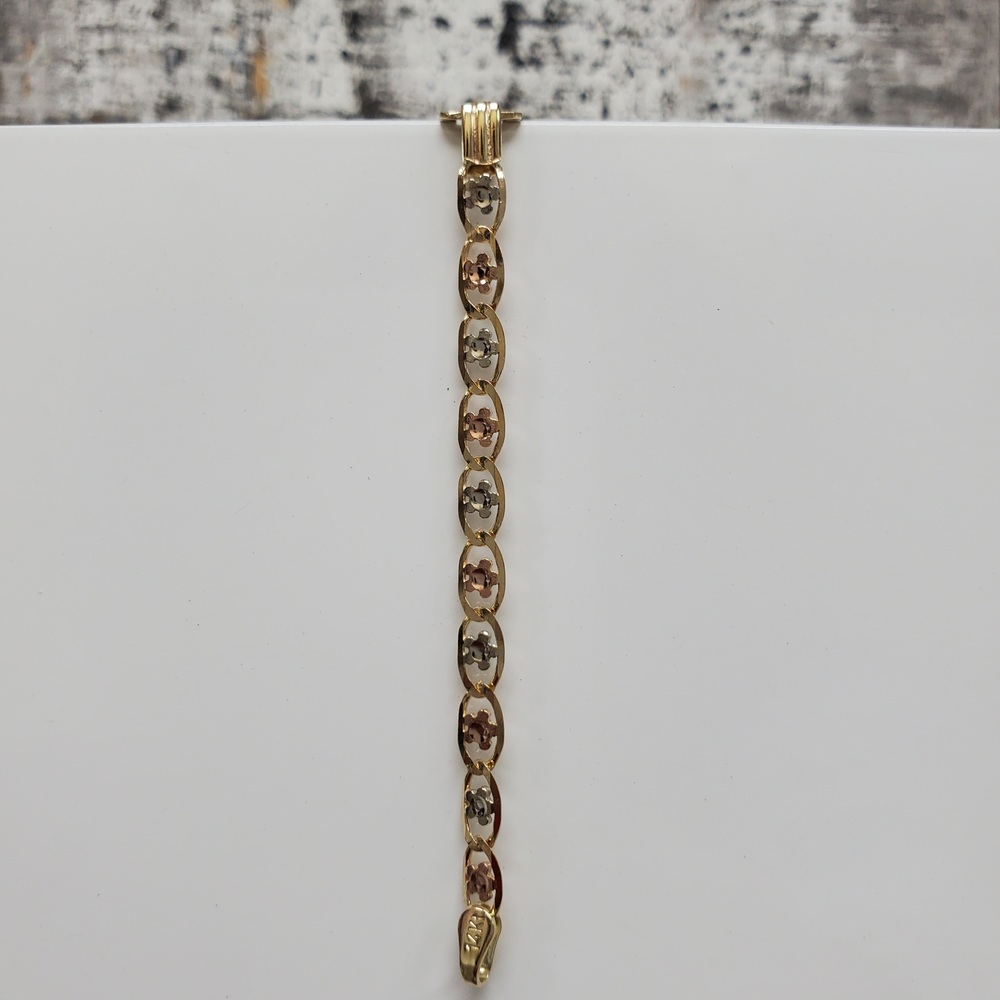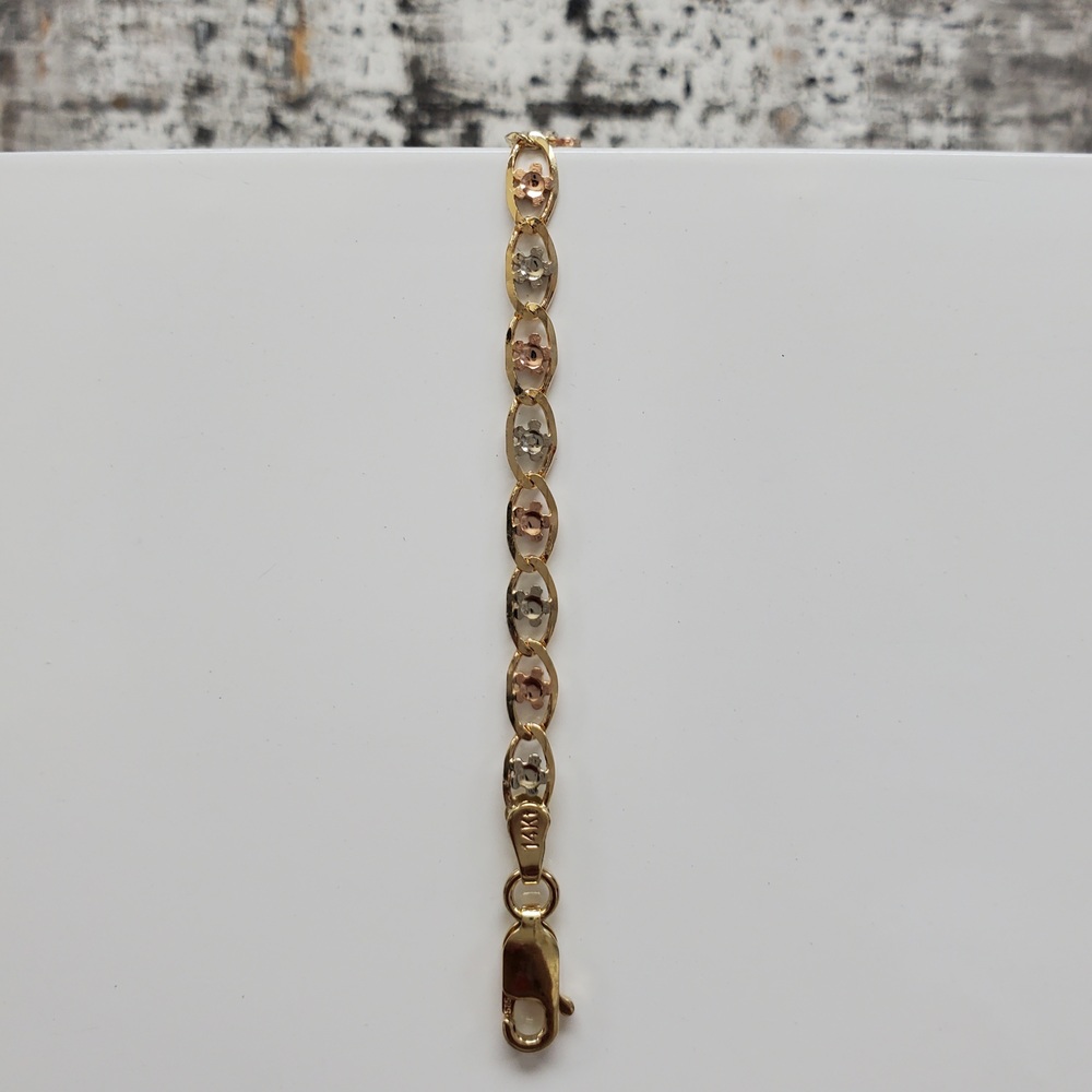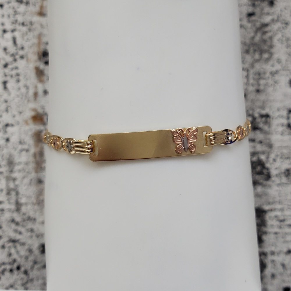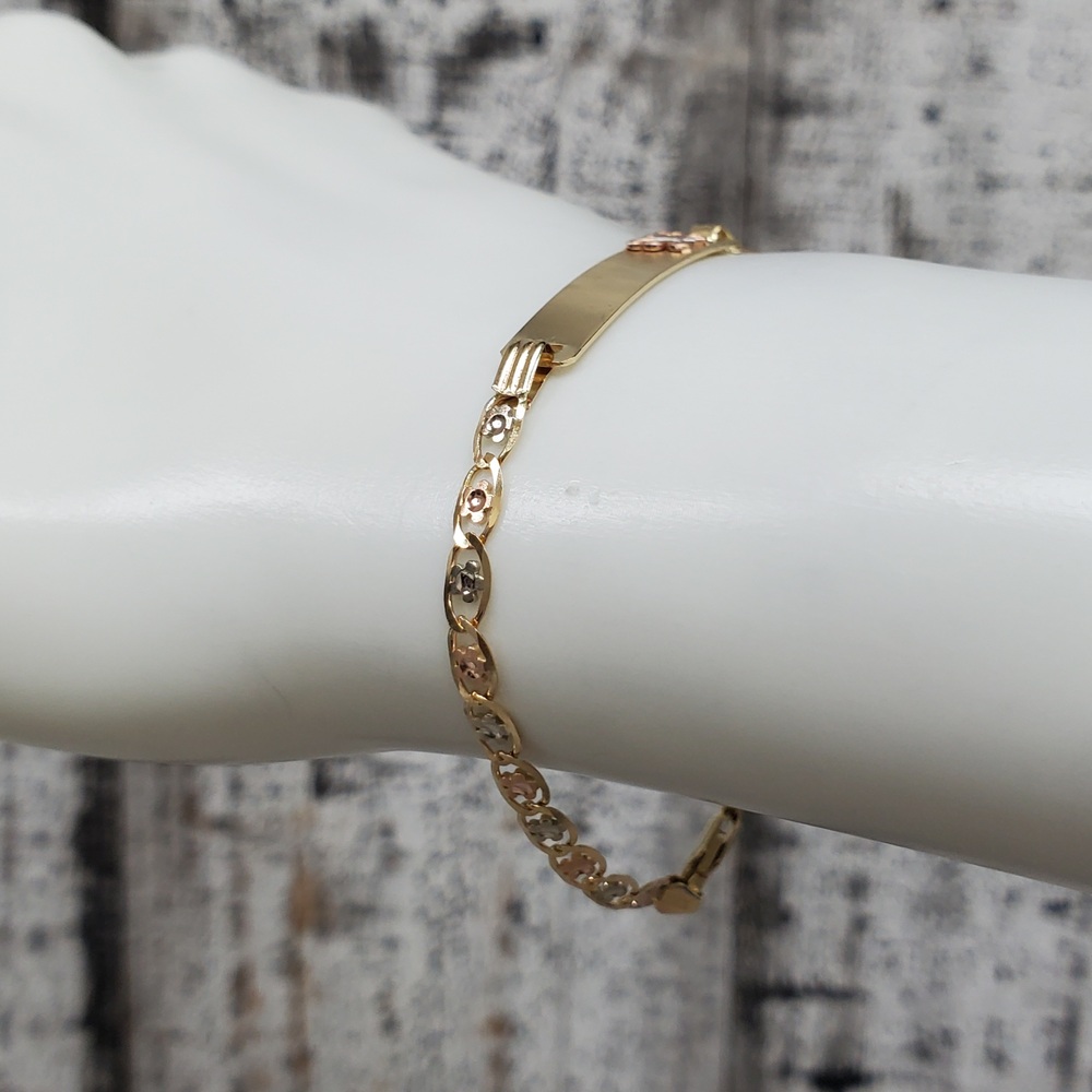 We have this stunning 14K TriColor Valentino Flower Style Link ID Bracelet w/ Butterfly For sale!