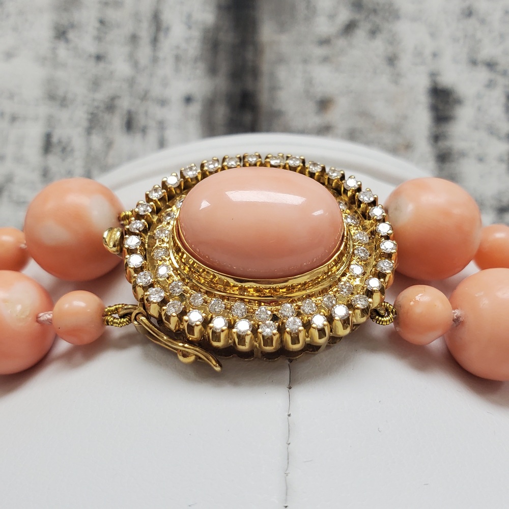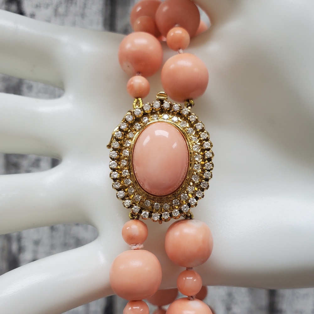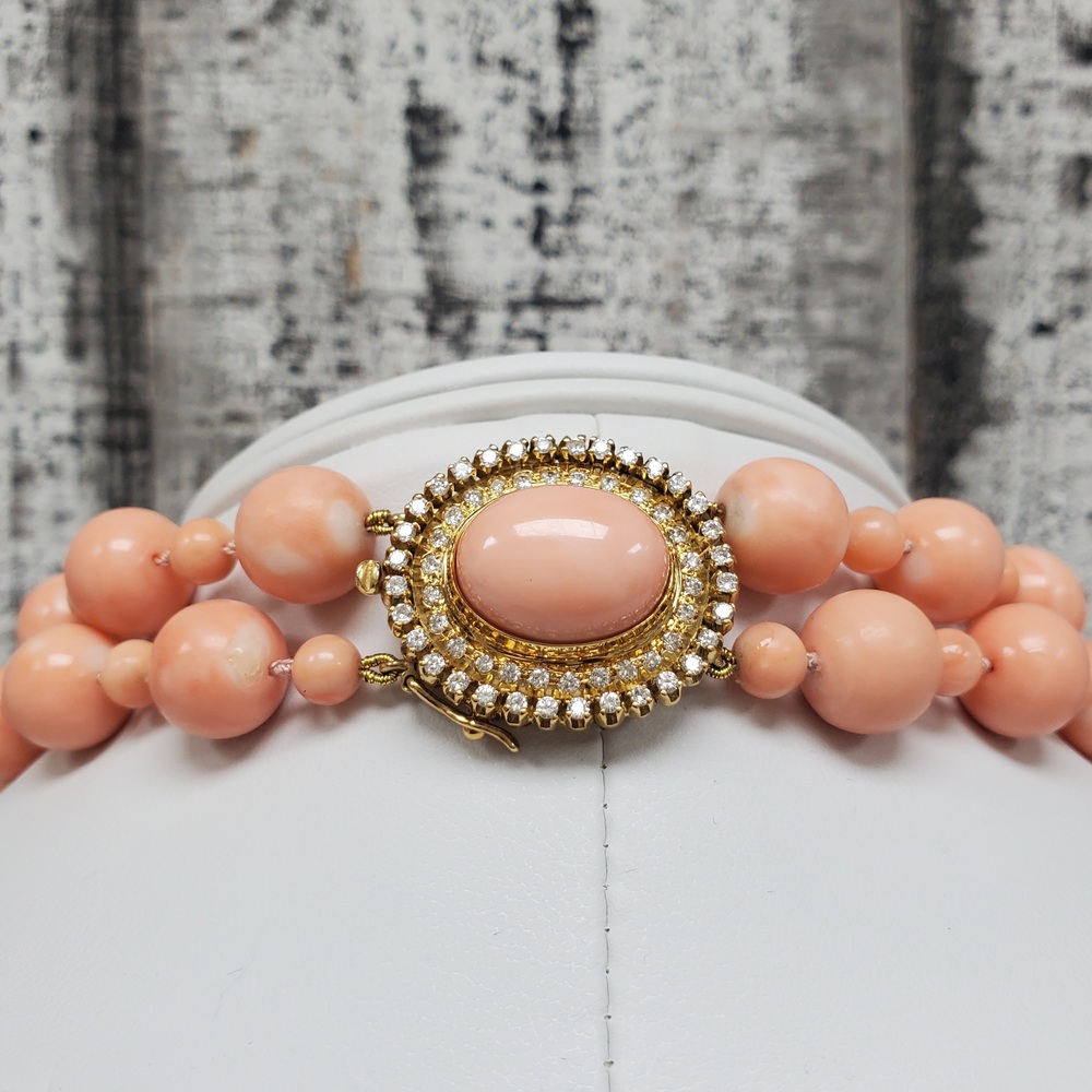 We have this stunning 18K Double Strand Coral + Diamond Necklace For sale!
