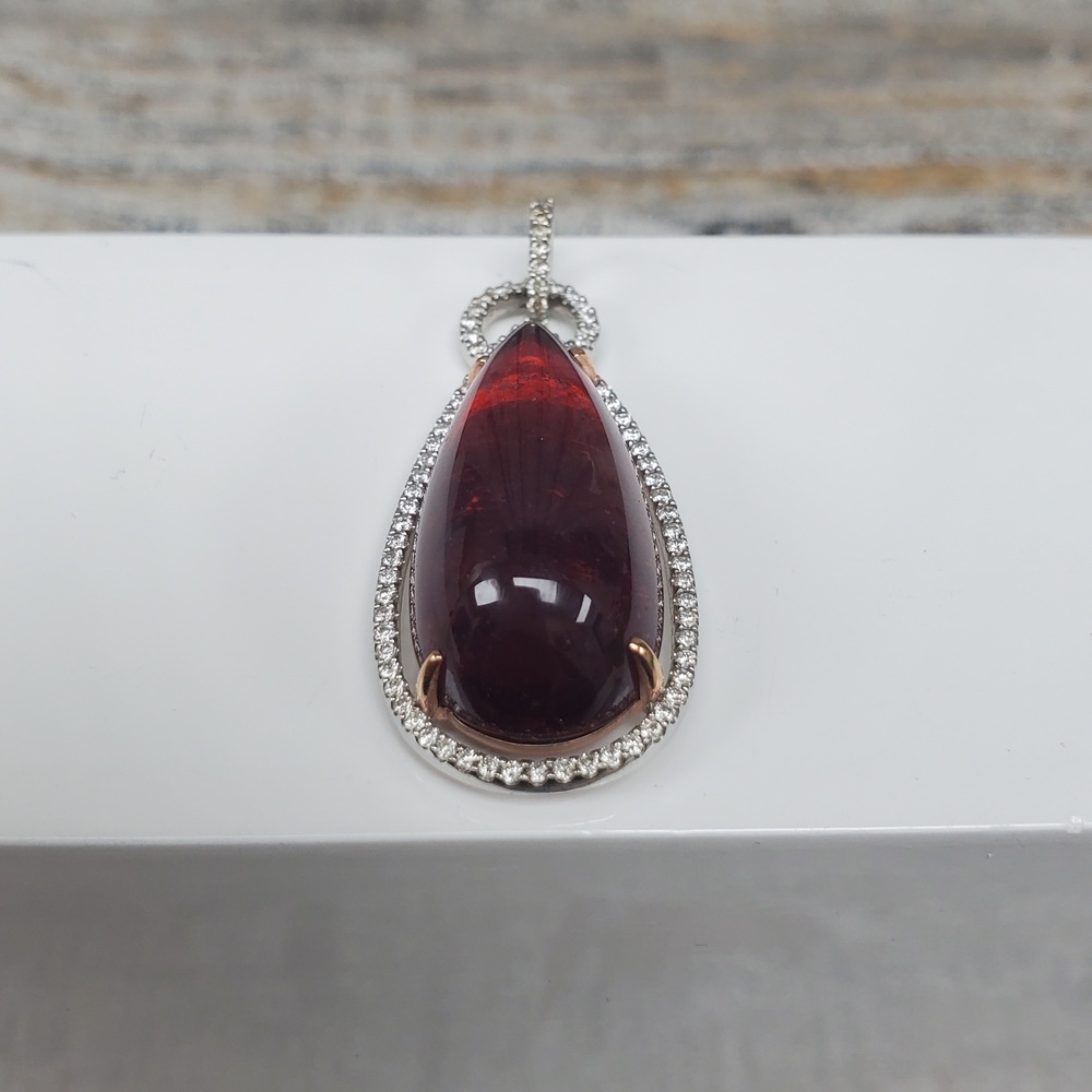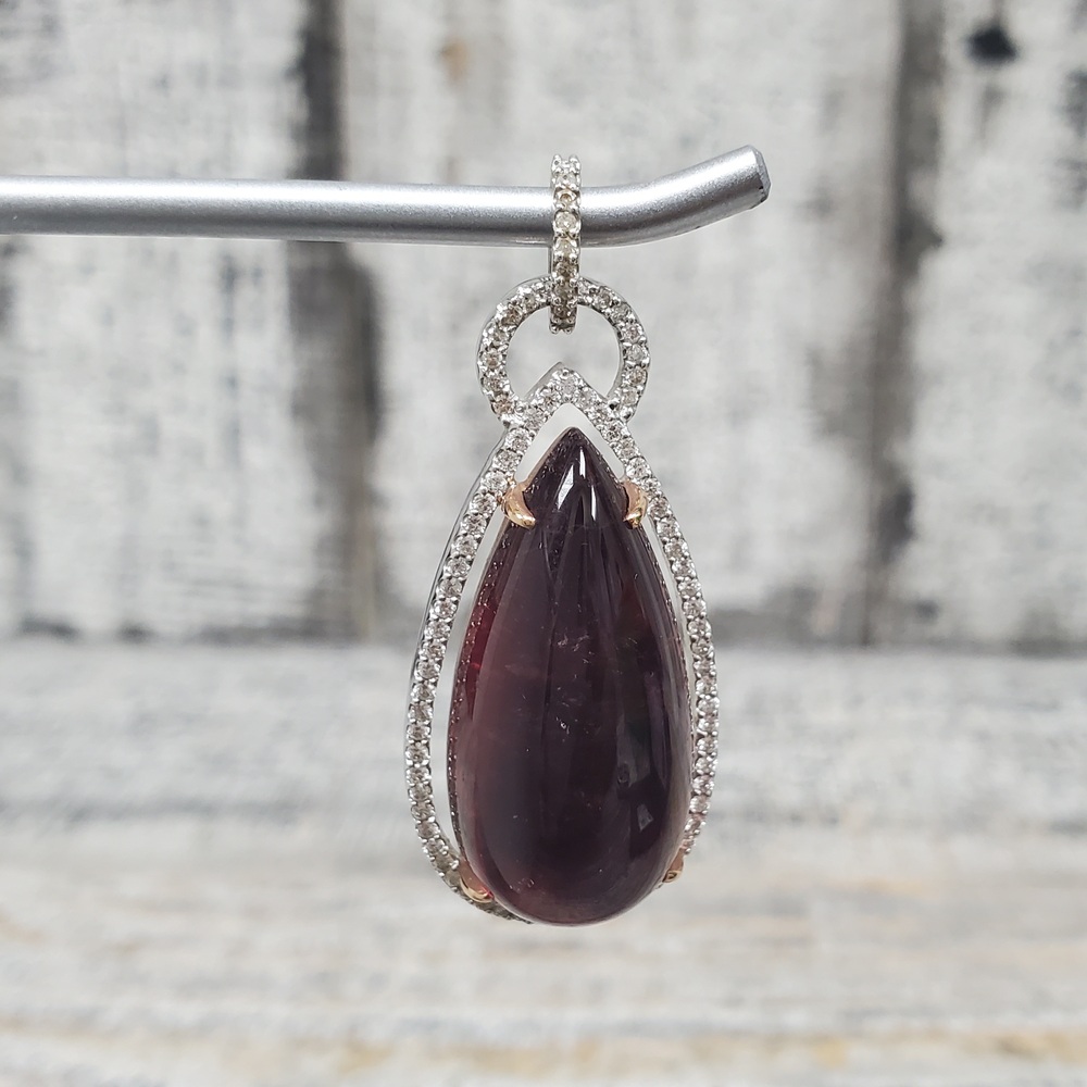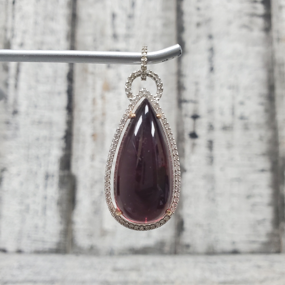 We have this stunning 18K Pear Cabachon Pink Tourmaline + Diamond Pendant for sale!
