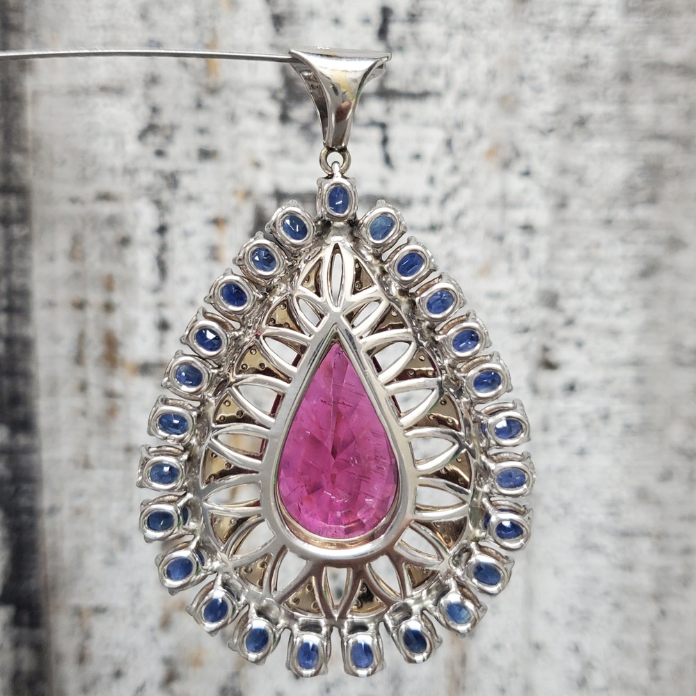 Carat Total Weight: Est. 1ctw Round Brilliant Diamonds + 25 5x4mm Sapphires (Heated) + 18.79ct Red Tourmaline (25.68mm x 16.45mm)