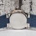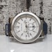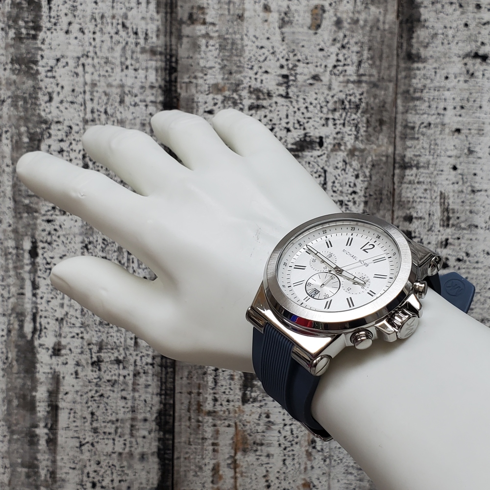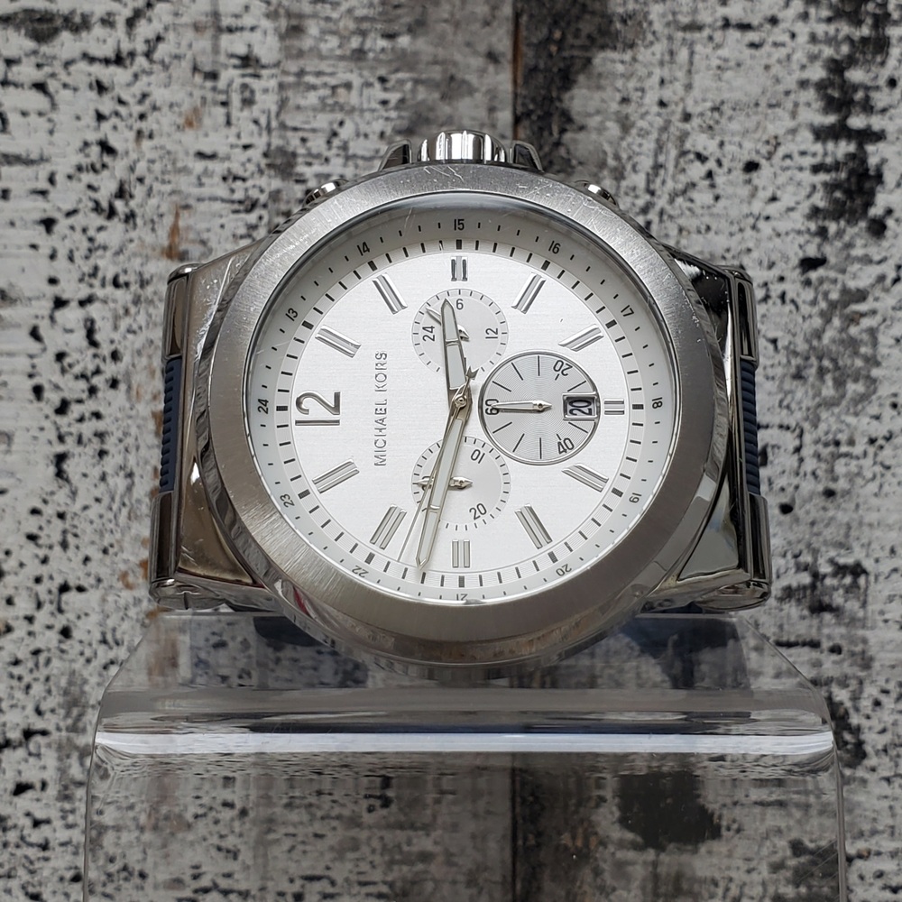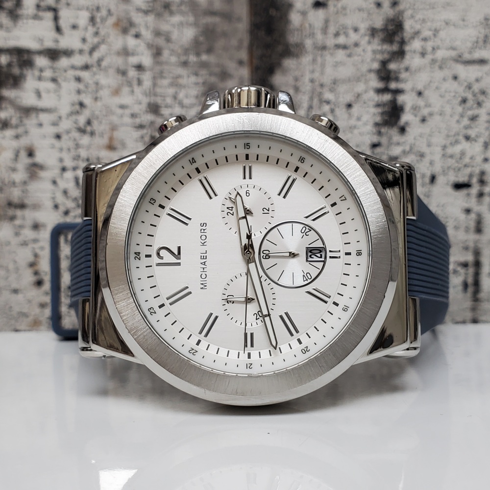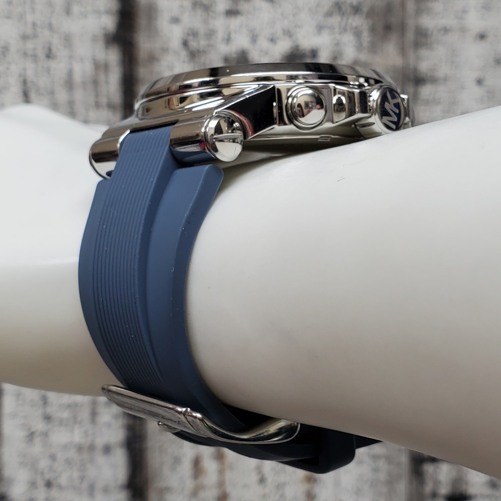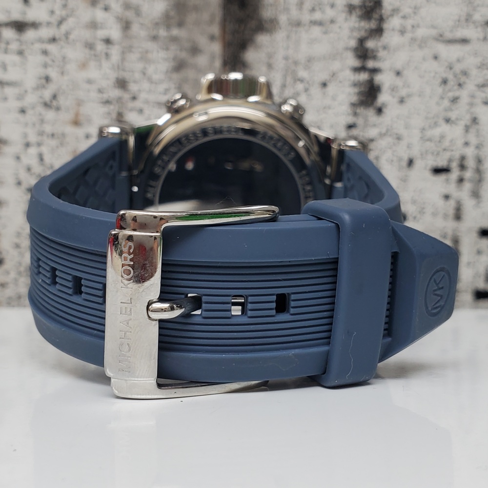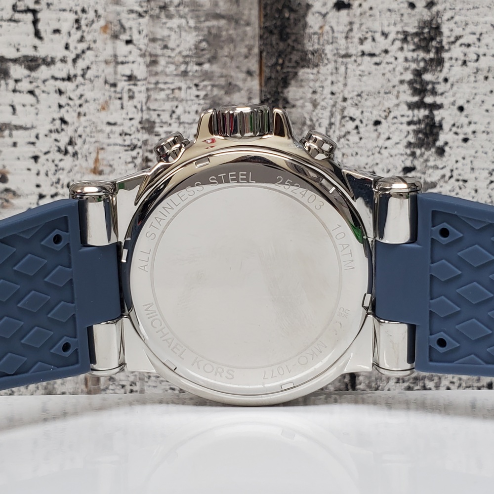 This is a Michael Kors MK-1077 Oversized Dylan watch. Features include a silver-tone stainless steel body, complemented by a mid-tone blue rubber strap. The piece has been gently used, exhibiting minor signs of usual wear.
