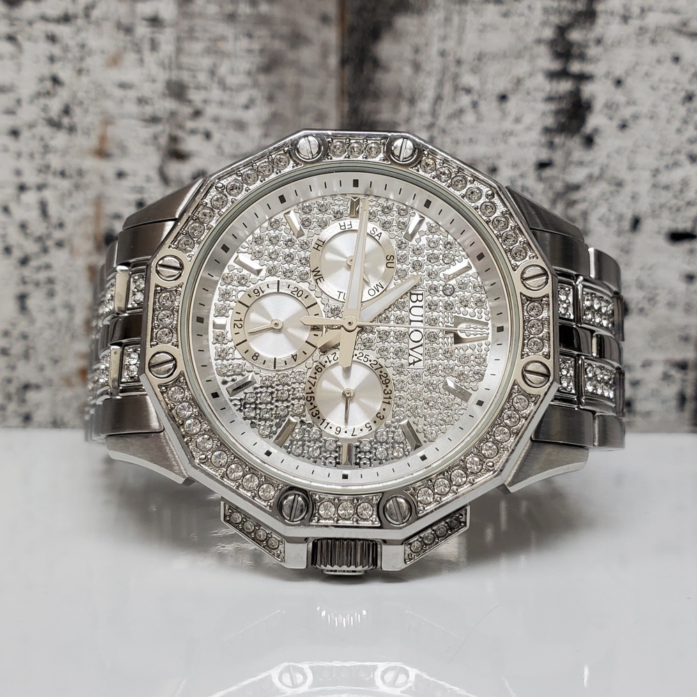 A 41.5mm Bulova Octava Crystal Watch 96C134, valued at $650, exhibits light normal signs of wear. An elegant balance of style and functionality.
