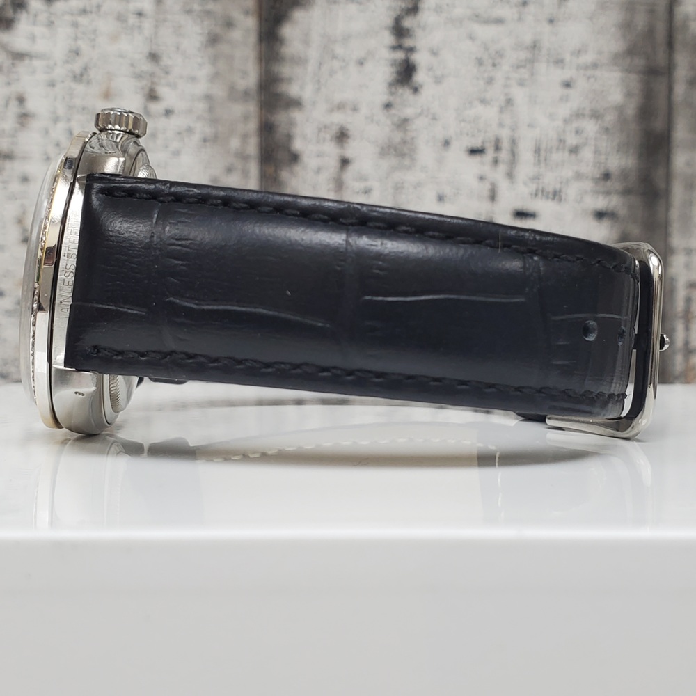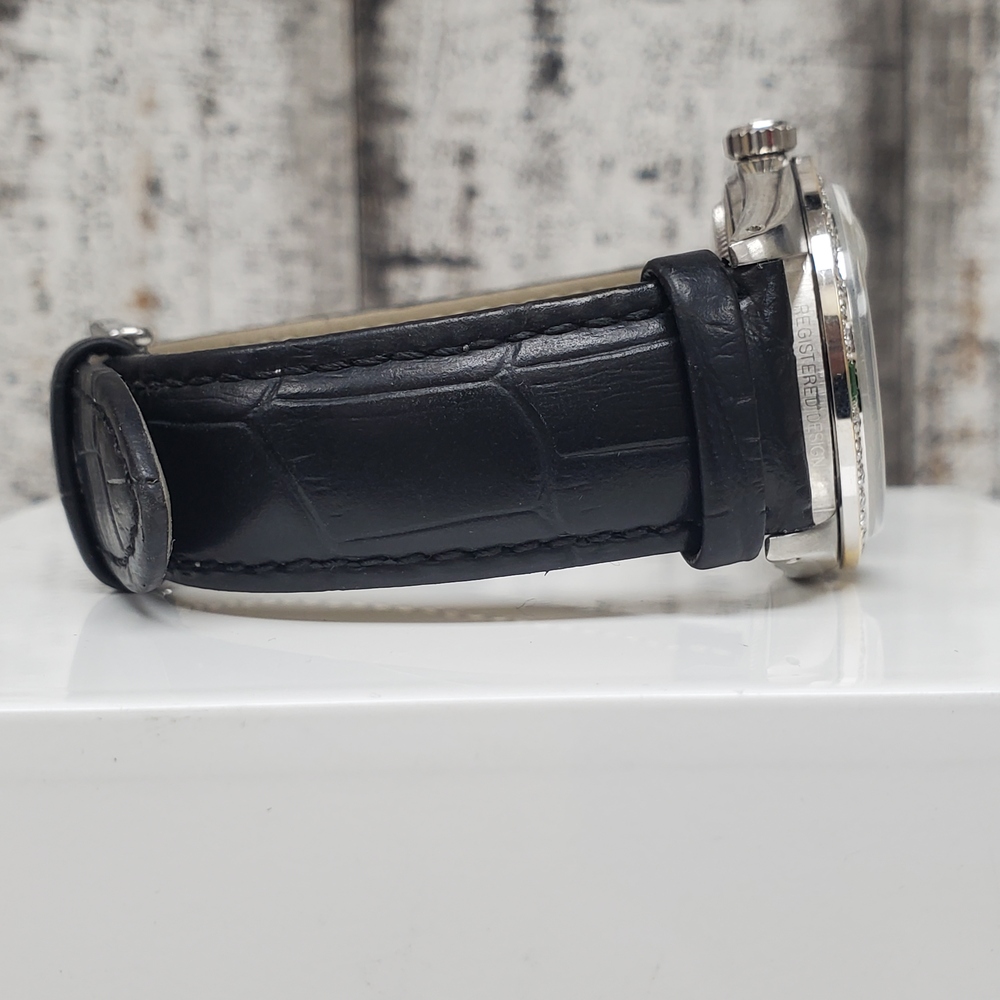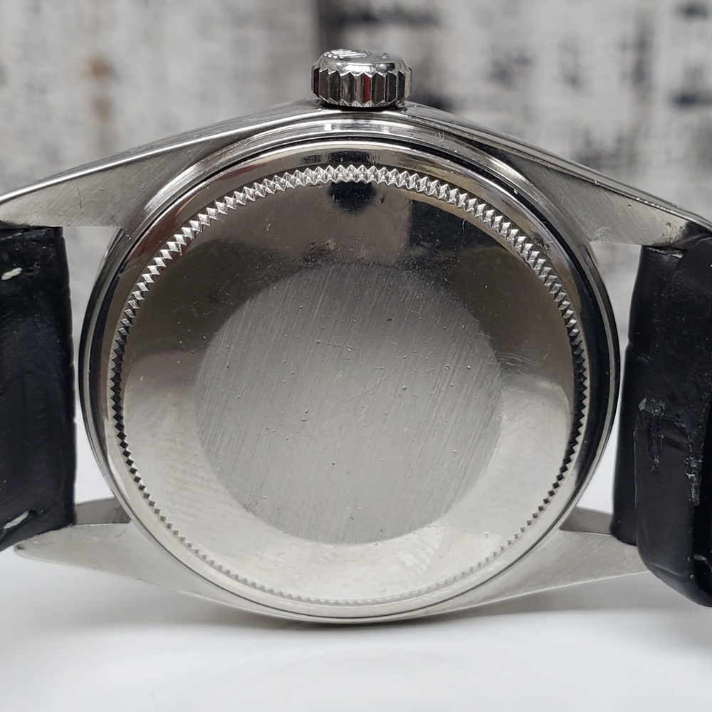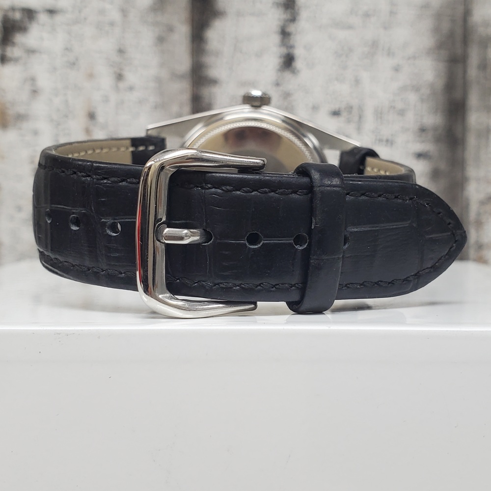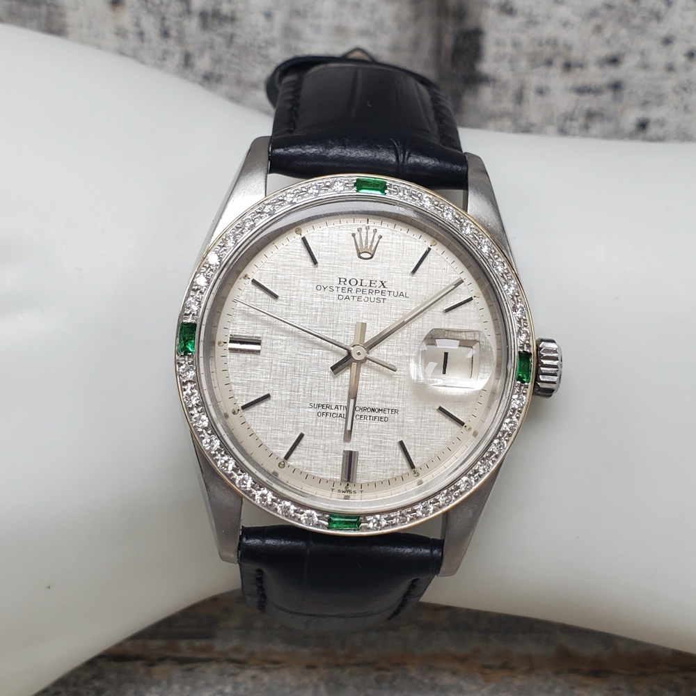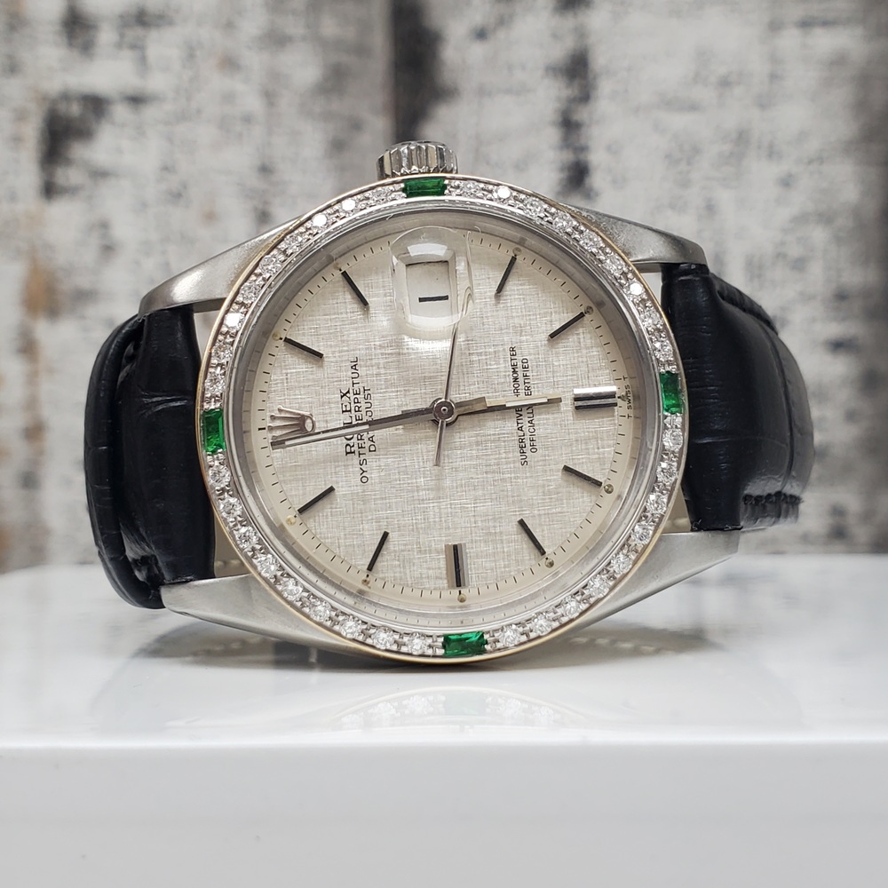 A vintage '78 Rolex 1601, 36mm in size, features an estimated .90ctw Round Brilliant Diamonds on a coveted Emerald Dial. Crafted from stainless steel and paired with a sleek aftermarket black leather strap/clasp for a sophisticated finish.