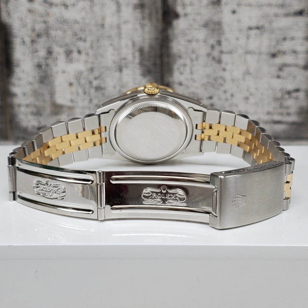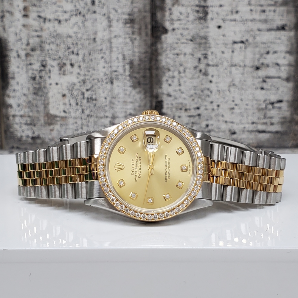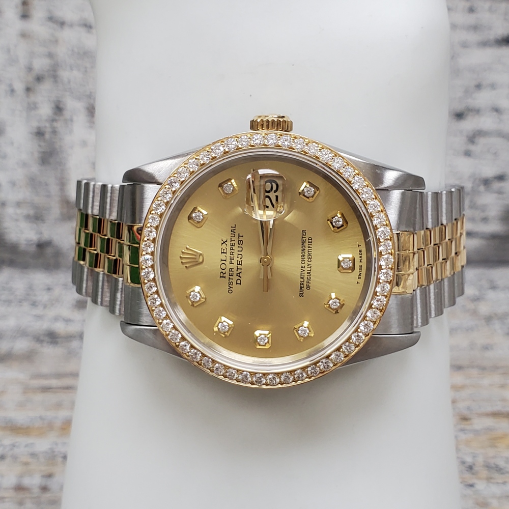 This is a luxurious 1990 Rolex Datejust, 36mm, model 16233. It features an estimated 1.33 carat aftermarket diamond bezel and dial. Crafted with 18K gold and stainless steel, it possesses a Jubilee band and weighs around 64.1dwt.