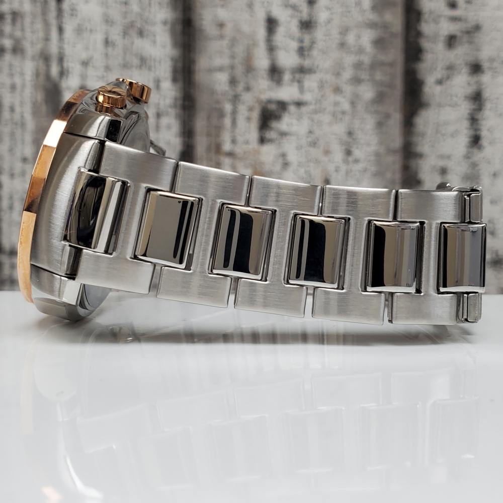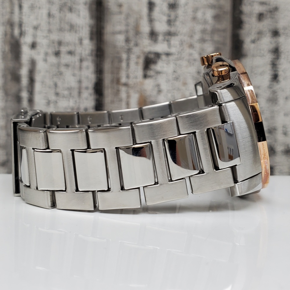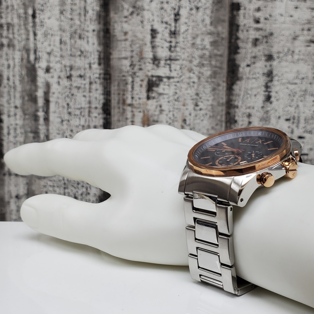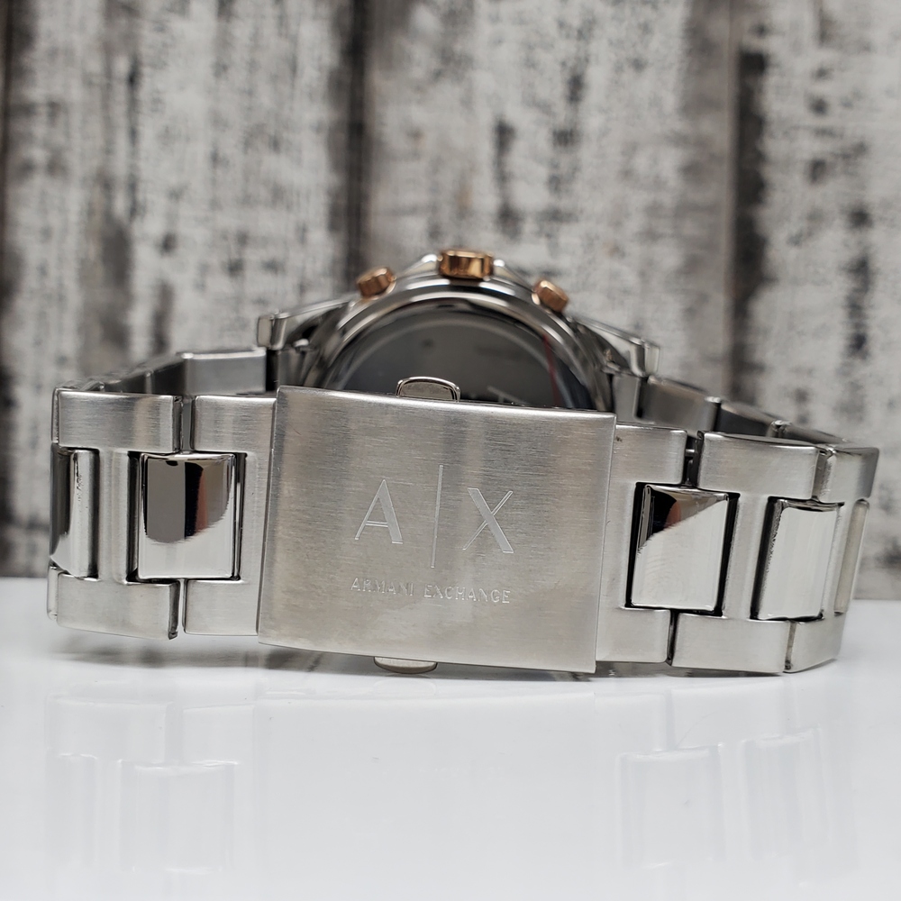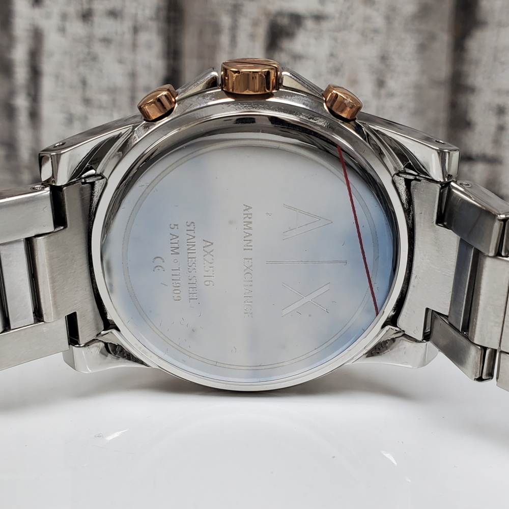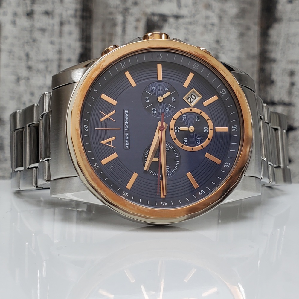 A sophisticated 44mm Armani Exchange AX2516 watch featuring a durable stainless steel body, rose gold tone, and a striking blue dial, in excellent condition.