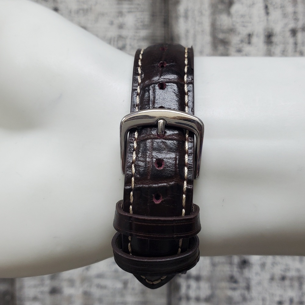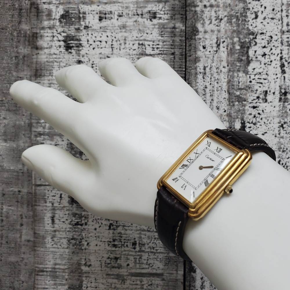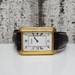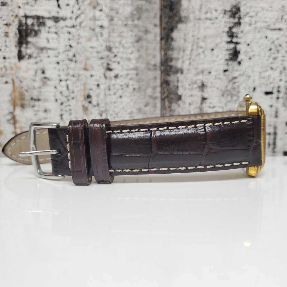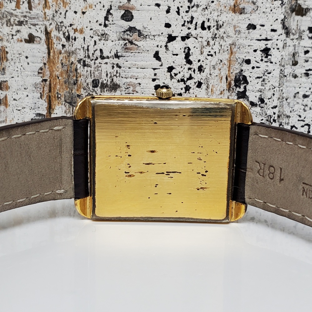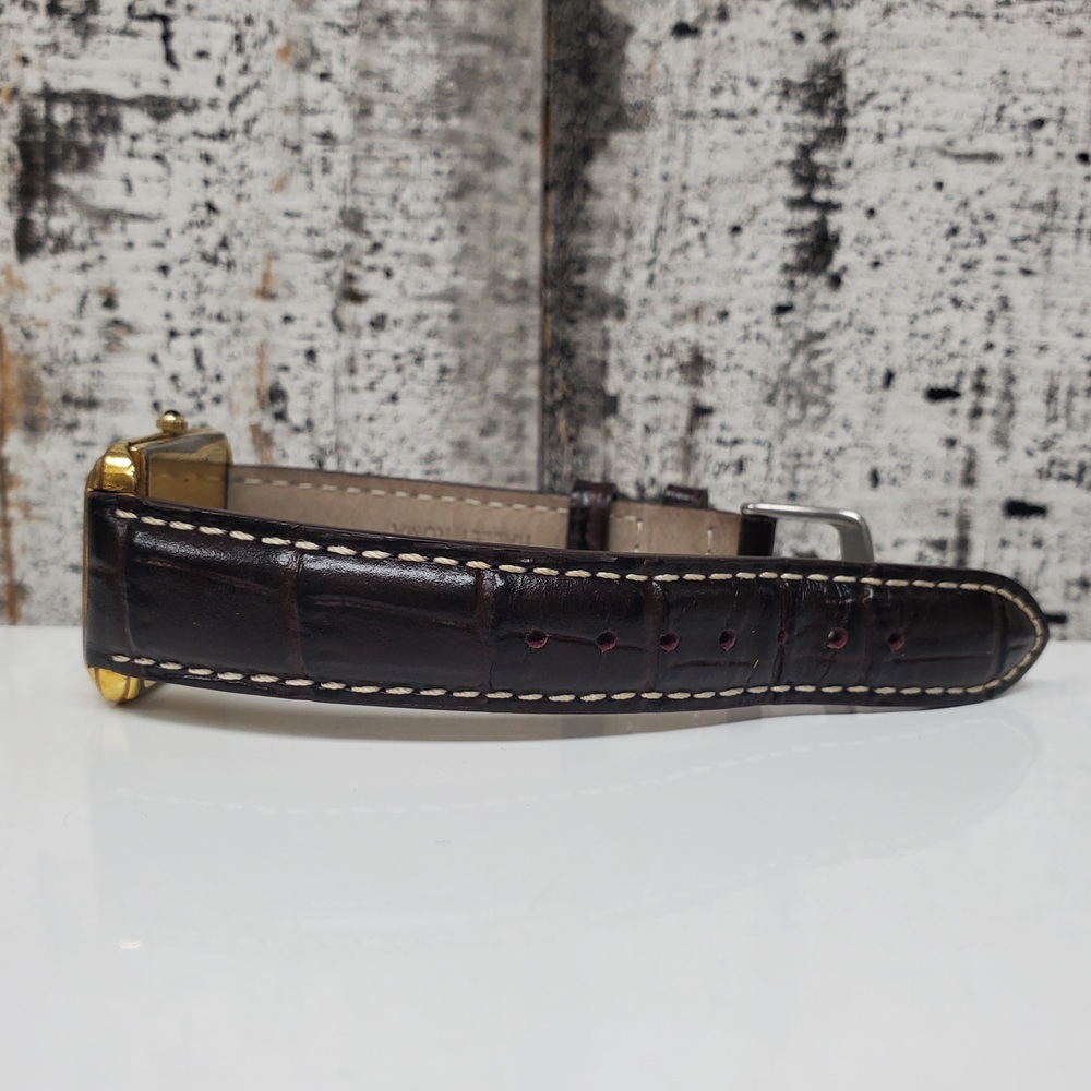This is an ASIS Vintage Cartier 18K Gold Electroplated Watch, with a unique stepped case design, measuring 37mm tall and 27.3mm wide. Features an aftermarket brown leather band. Please note, the gold plating is worn in several areas and the second hand is missing.