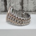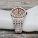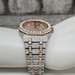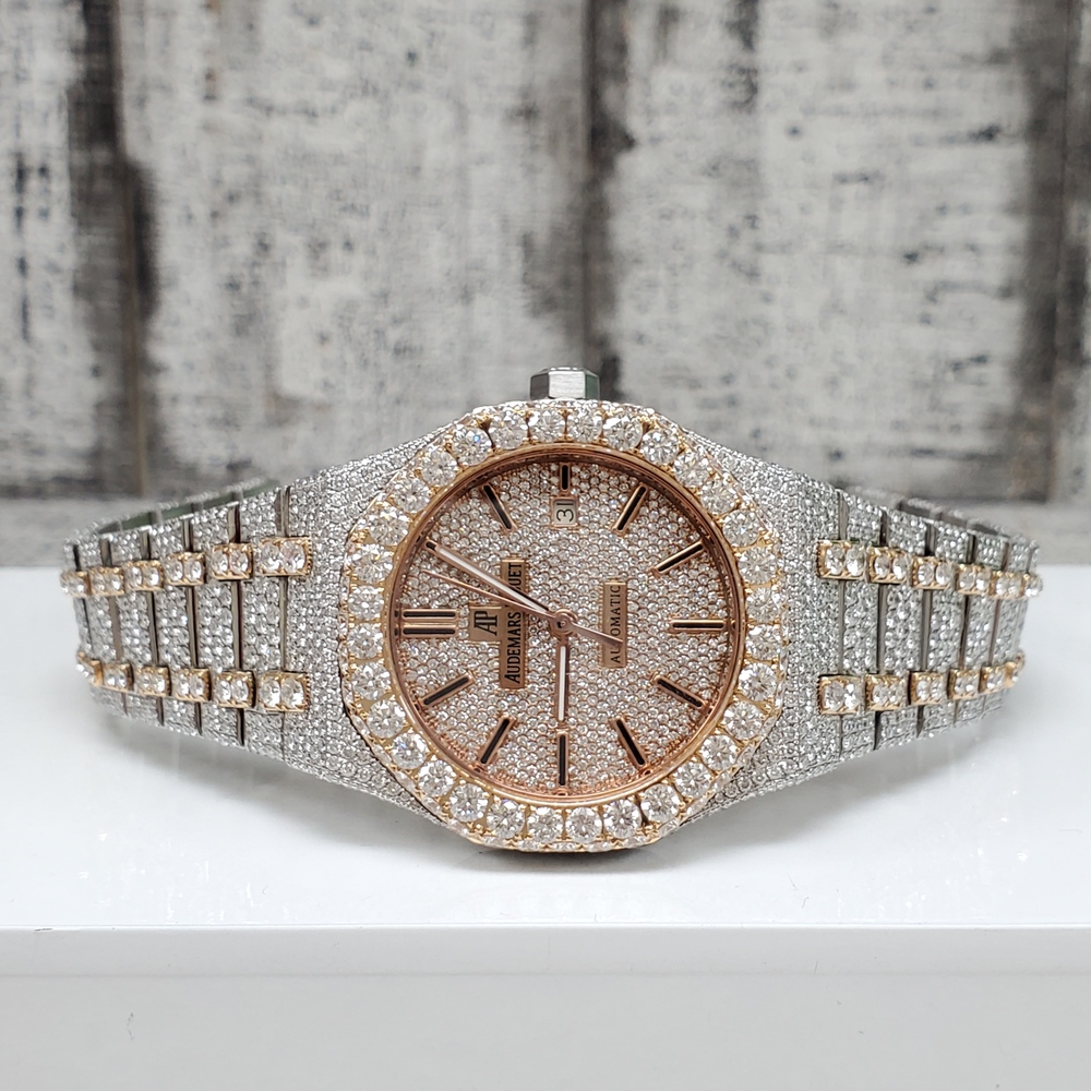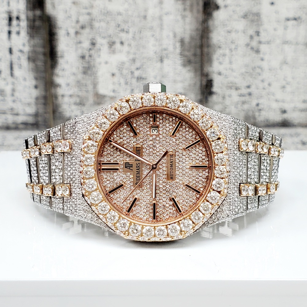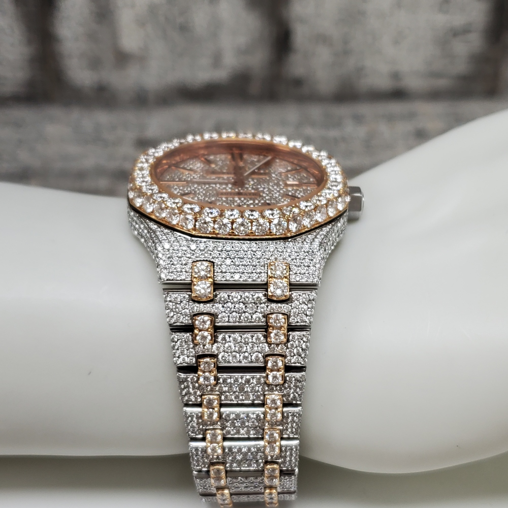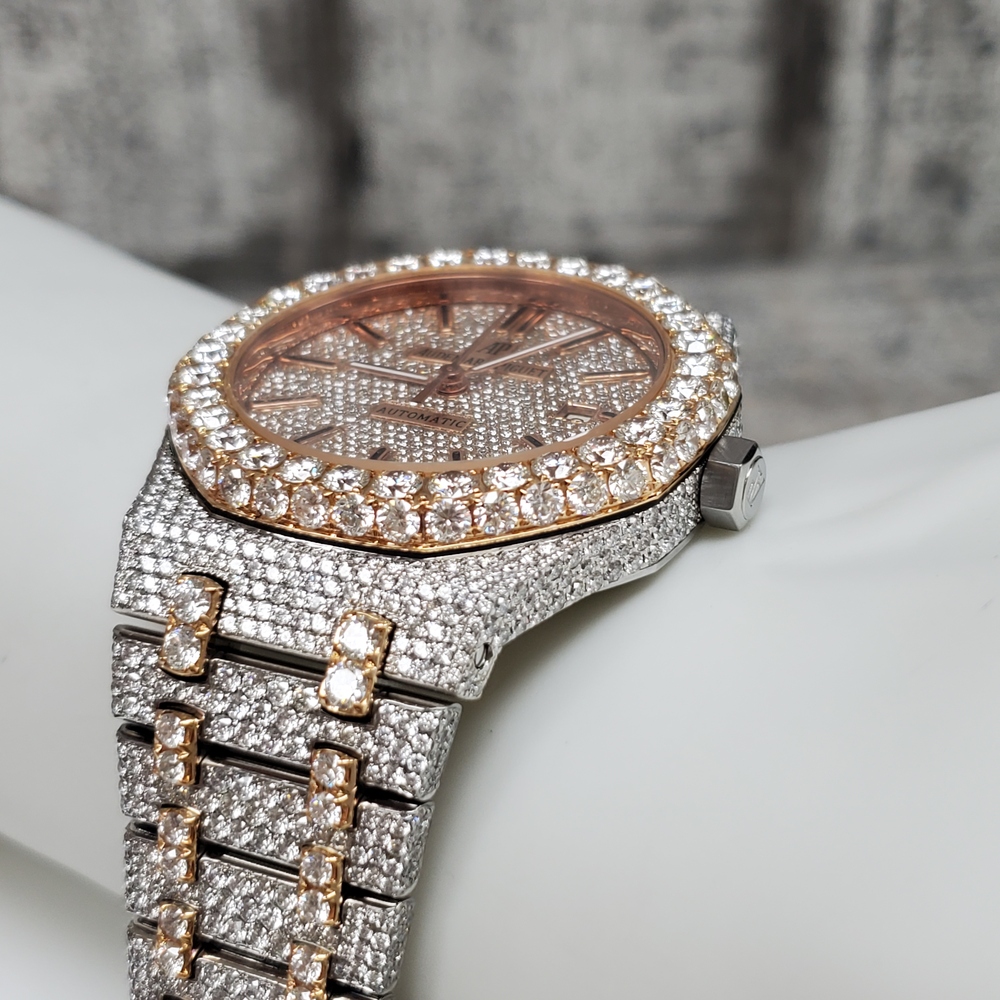 The Audemars Piguet Royal Oak is a luxurious, two-tone timepiece adorned with approximately 27ctw round brilliant and single cut diamonds all aftermarket. Its unique features include a diamond dial, and meticulous craftsmanship, making it a distinguished masterpiece. Few lab-created diamonds. ALL AFTERMARKET DIAMOND WORK