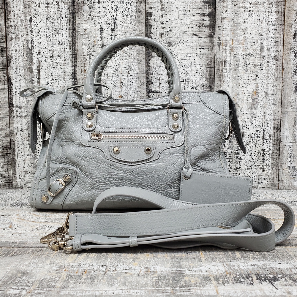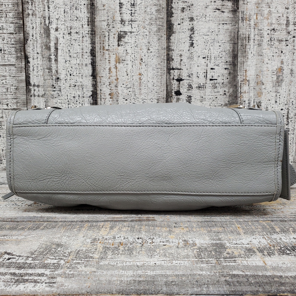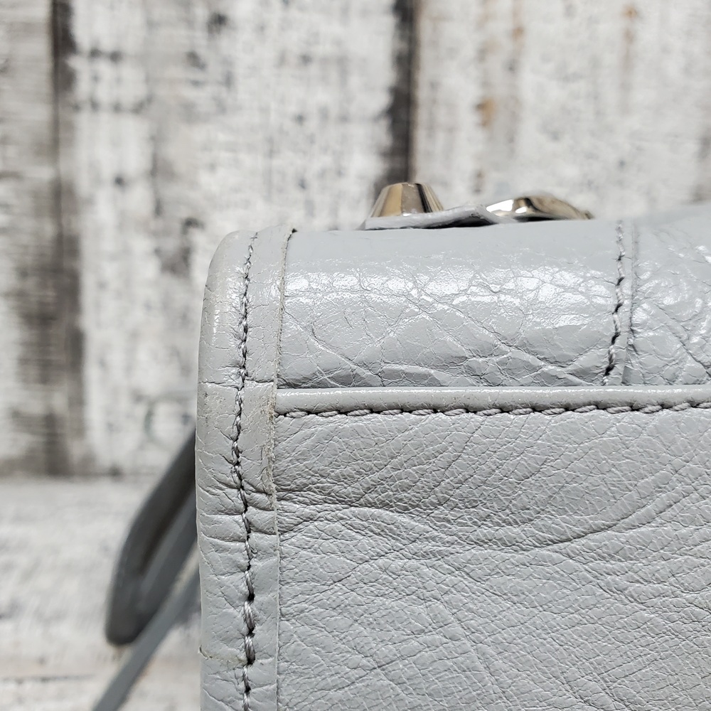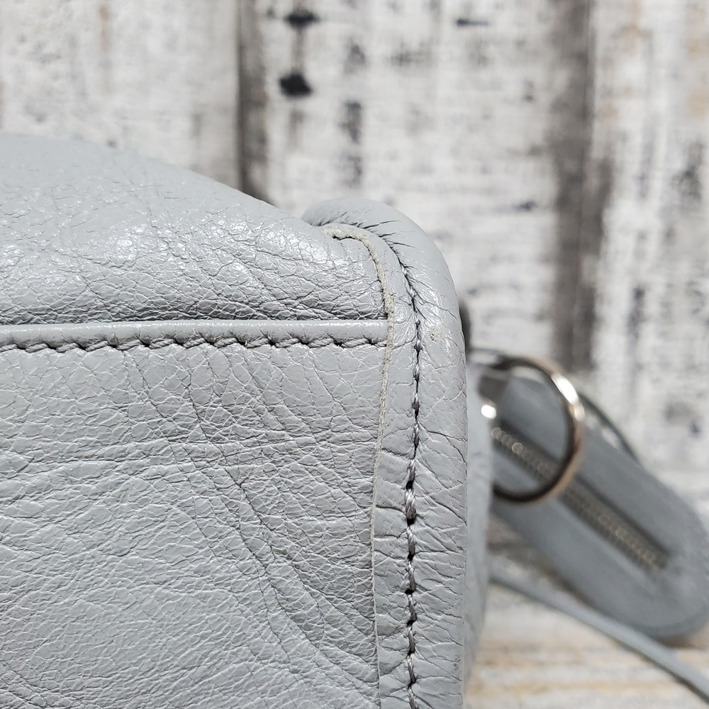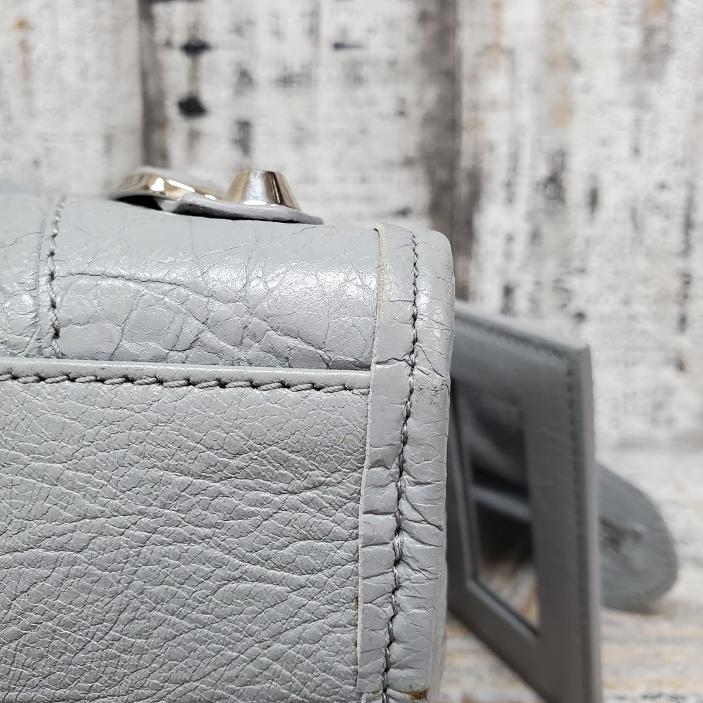 Used gray leather Balenciaga crossbody handbag with classic graffiti design, features dust bag and mirror. Showing signs of wear but remains in good condition.