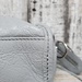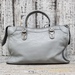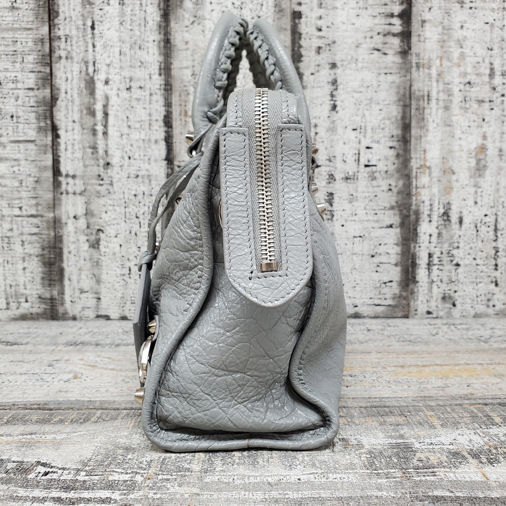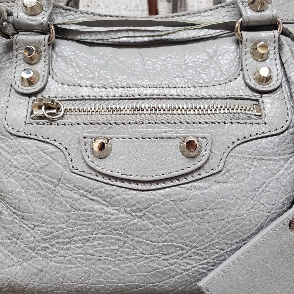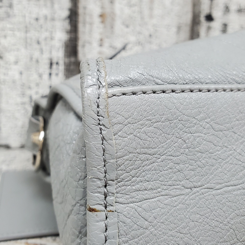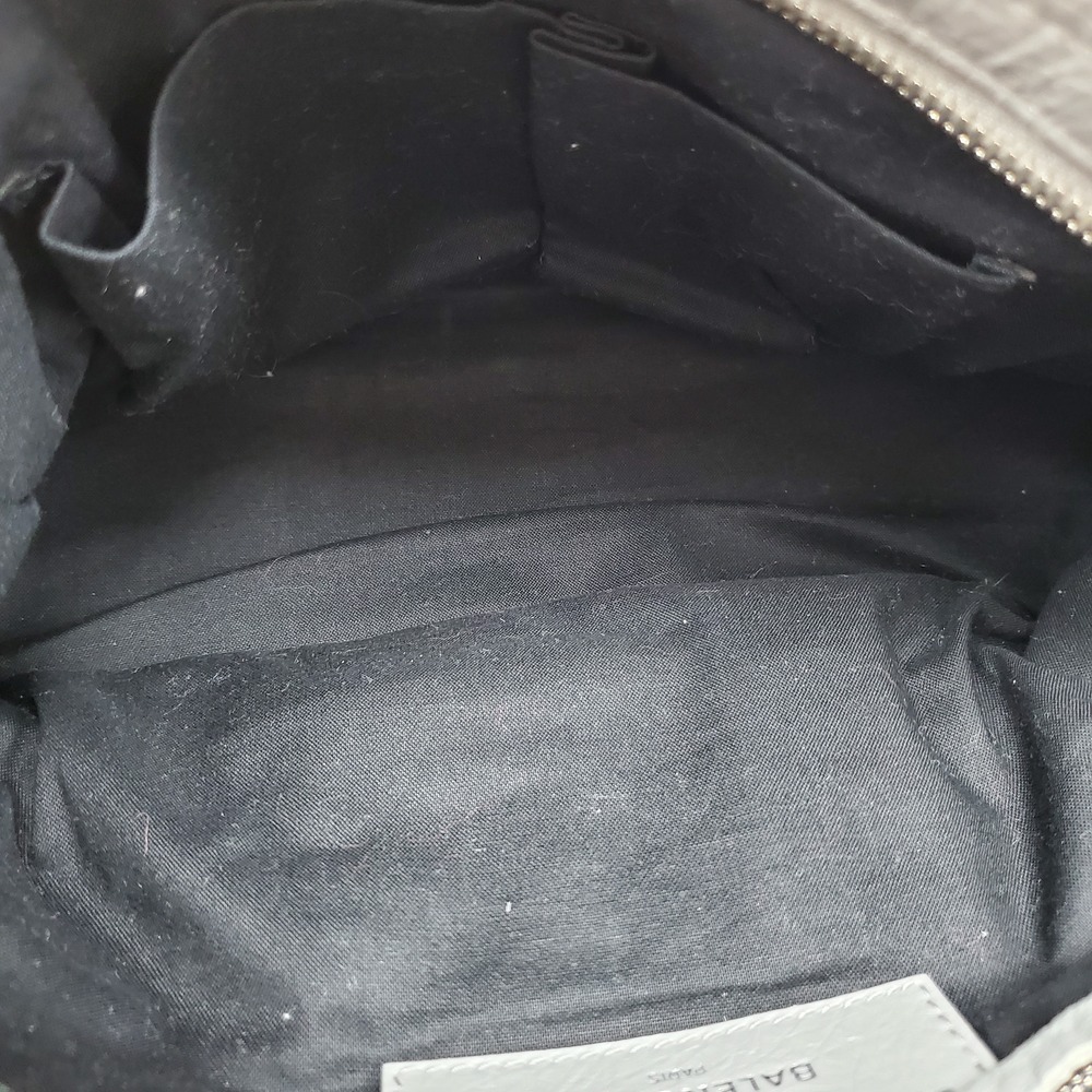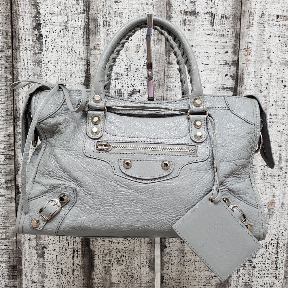 Used gray leather Balenciaga crossbody handbag with classic graffiti design, features dust bag and mirror. Showing signs of wear but remains in good condition.