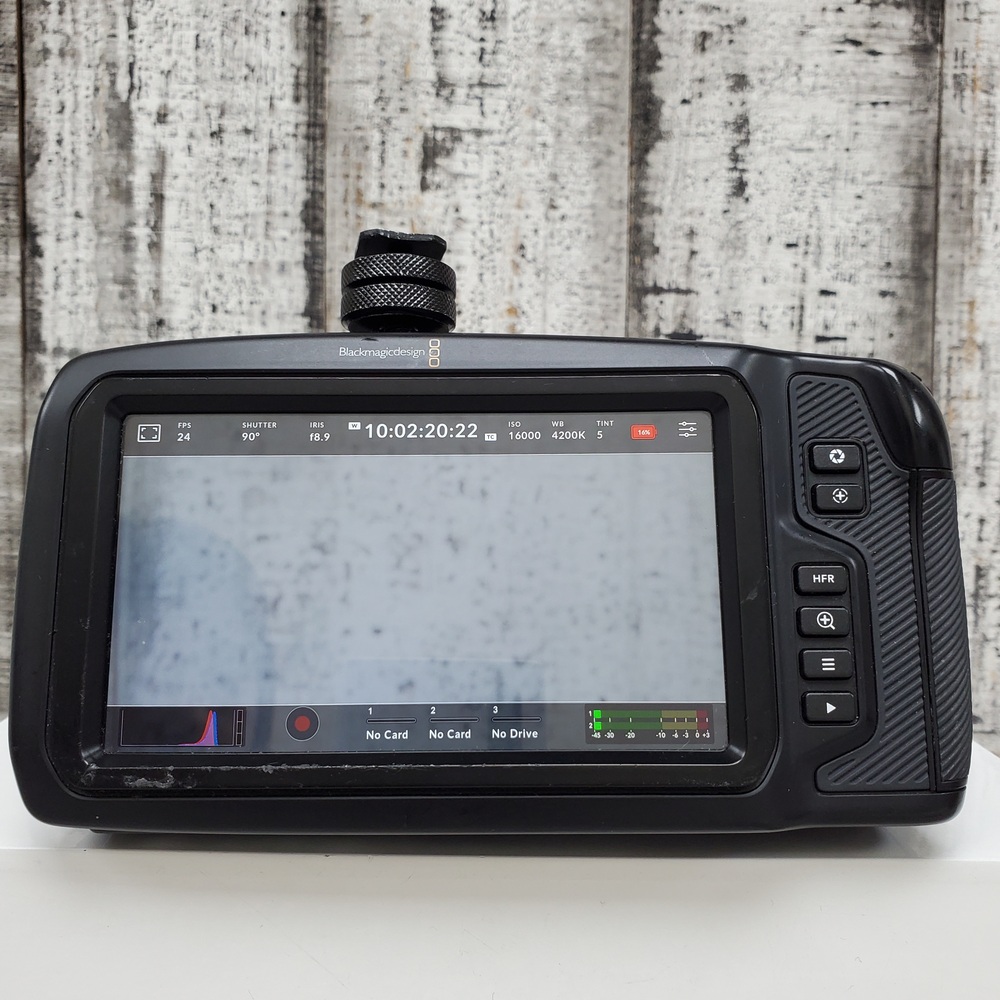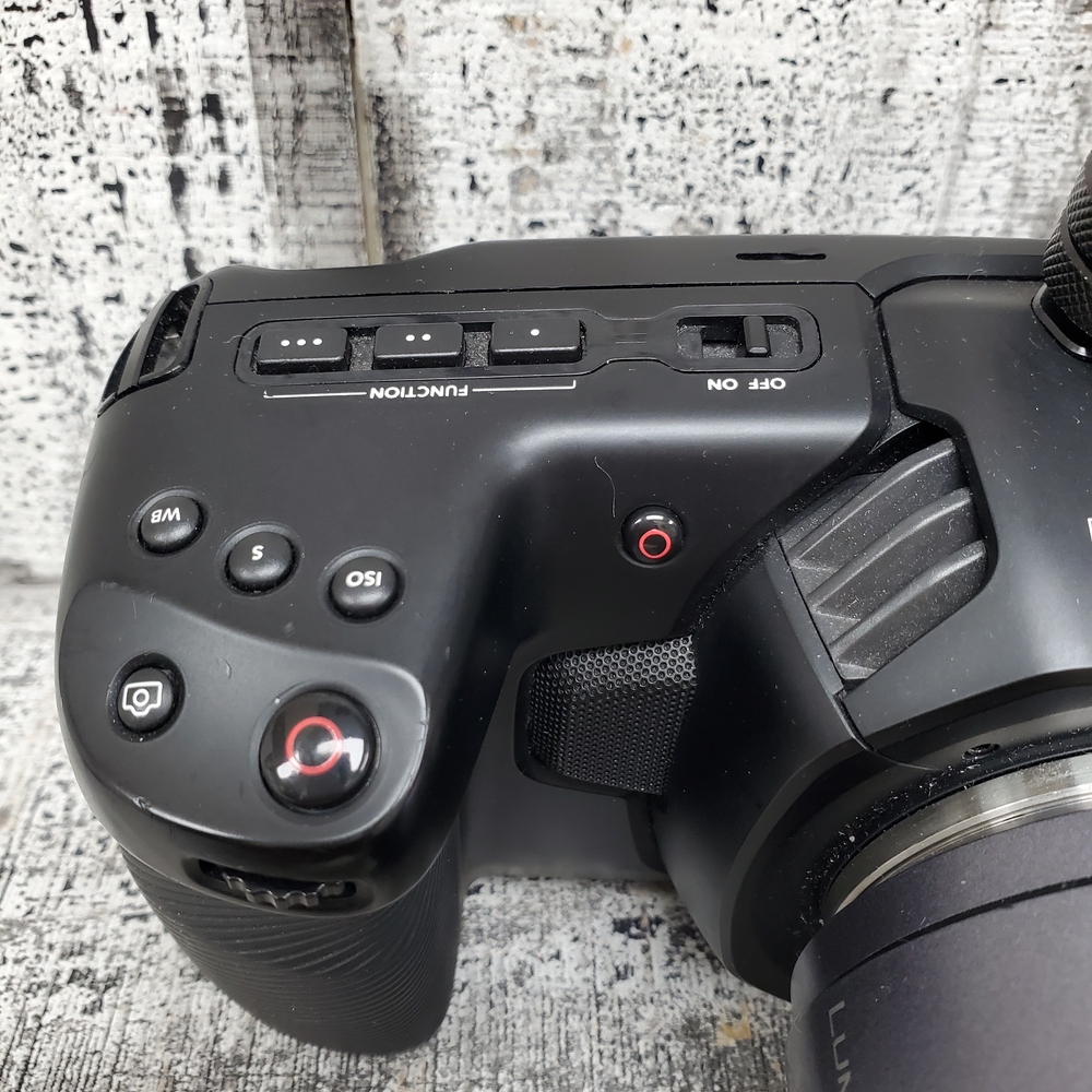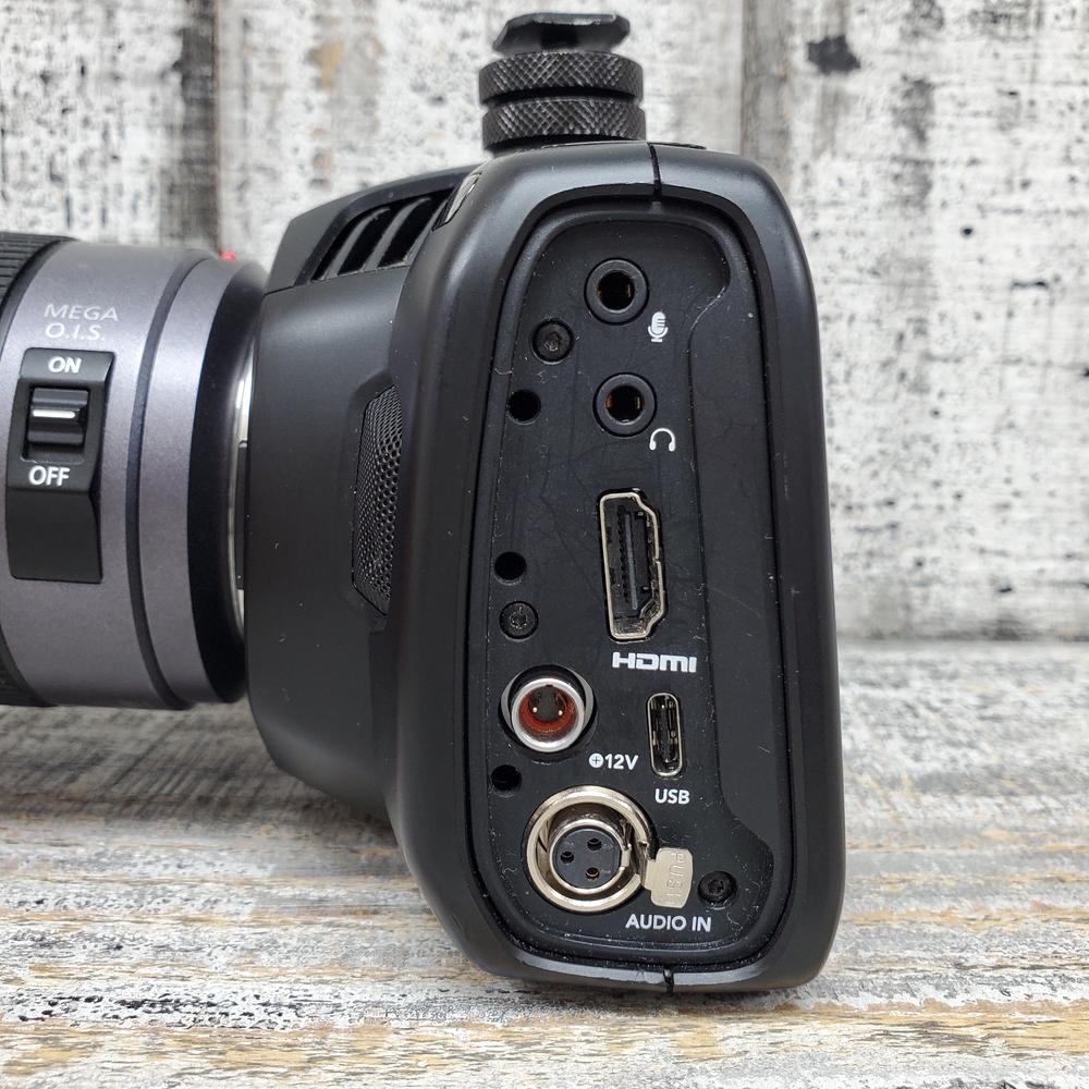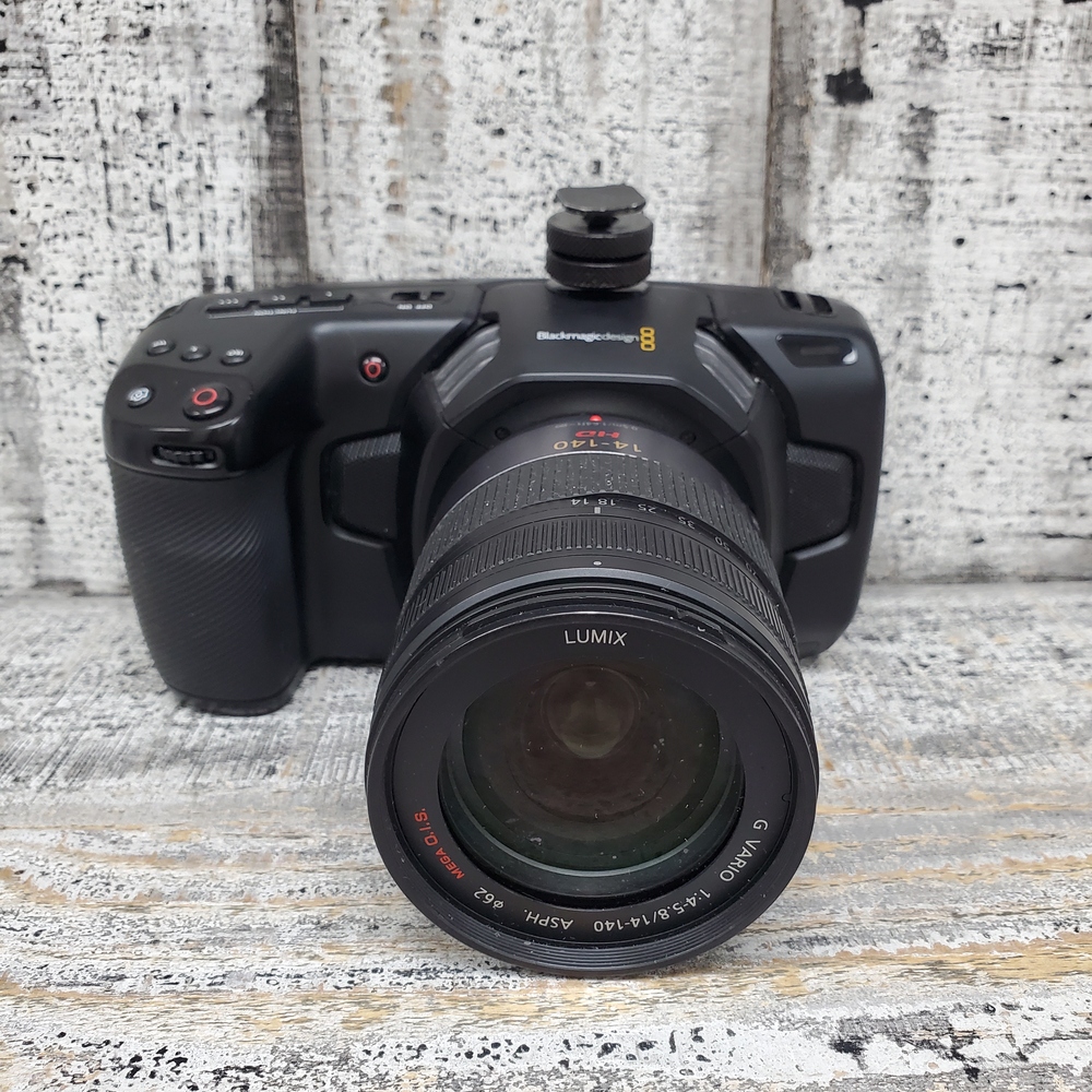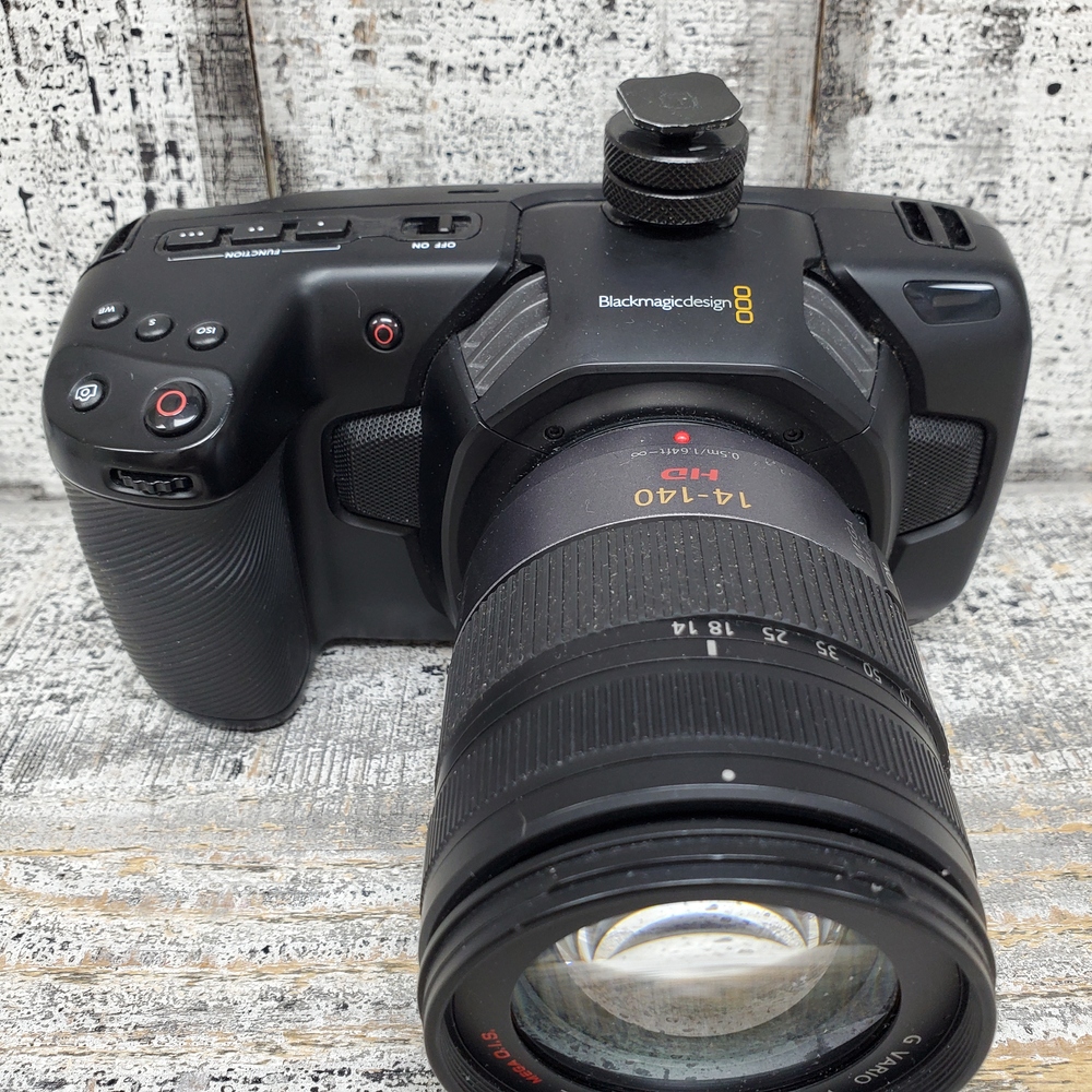 A compact, high-quality Blackmagic 4K Pocket Cinema Camera in box with charger, equipped with a versatile Lumix 14-140 lens for dynamic filmmaking and photography.