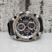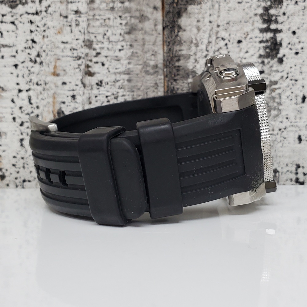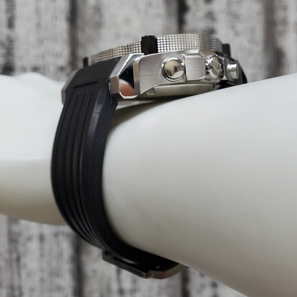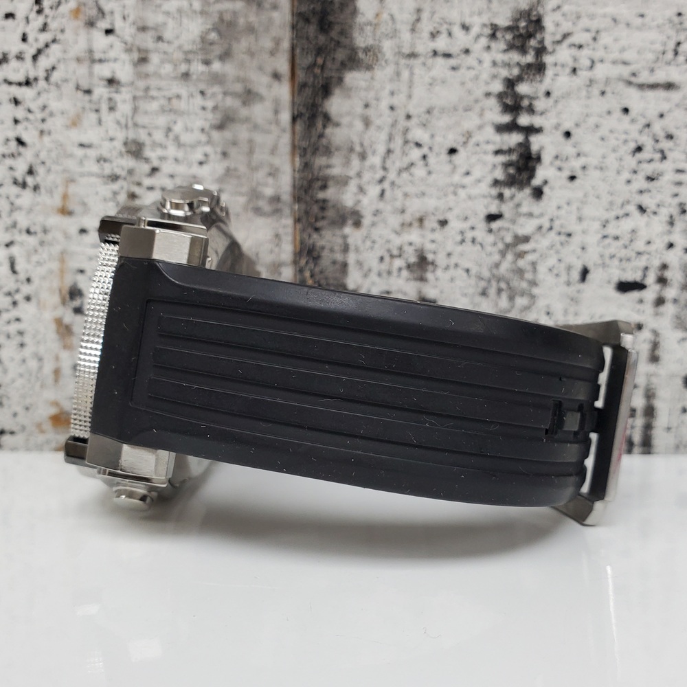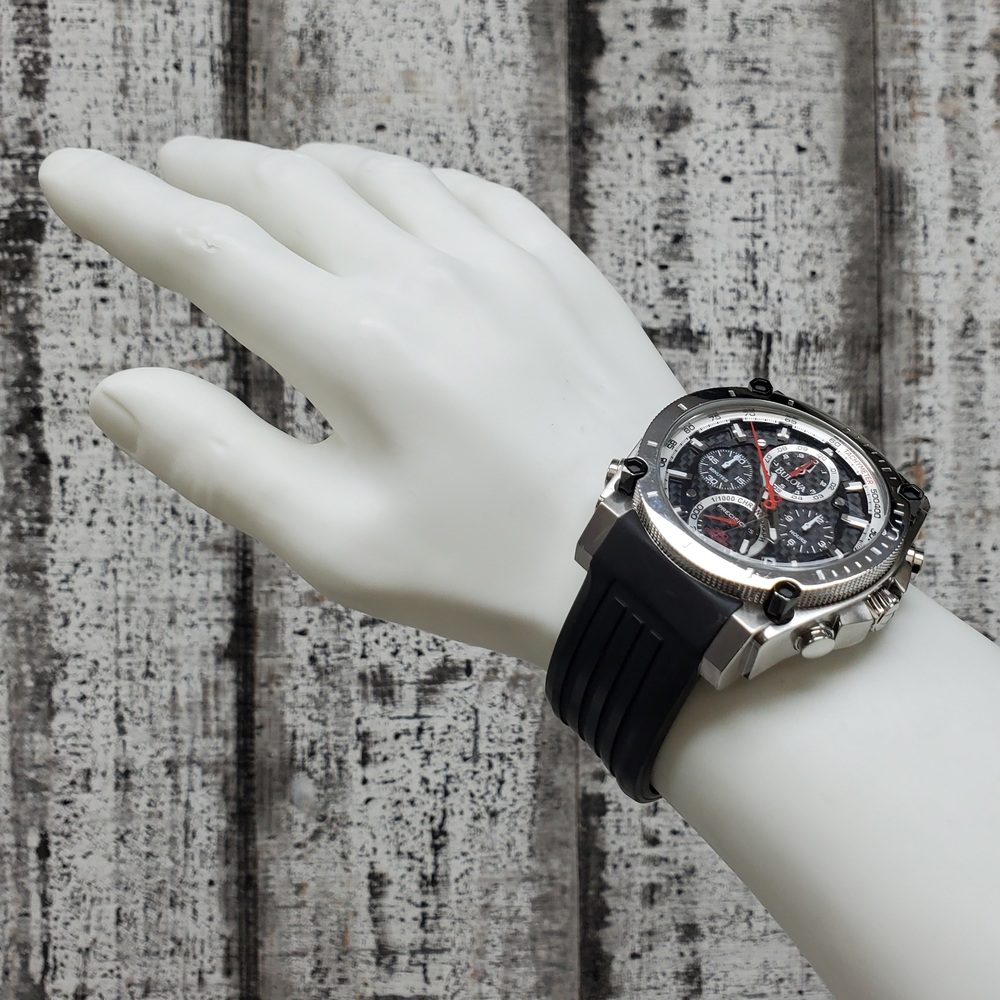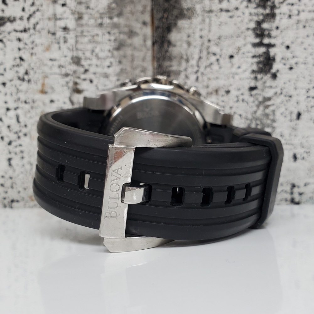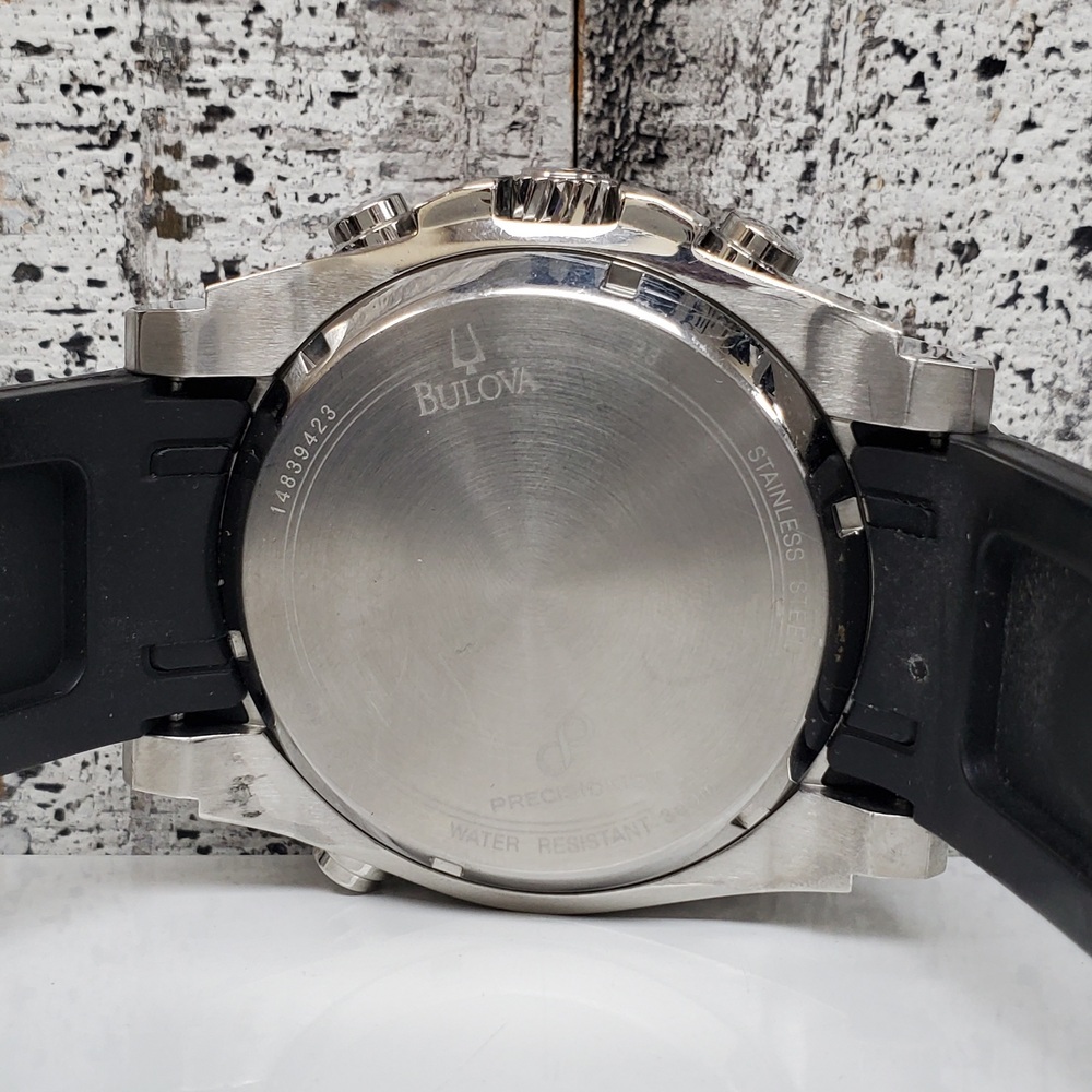 This is a Bulova Precisionist C977745 watch, featuring a robust stainless steel body, complemented by a stylish black rubber strap. The timepiece exhibits normal signs of usage and a scratch on its crystal surface.