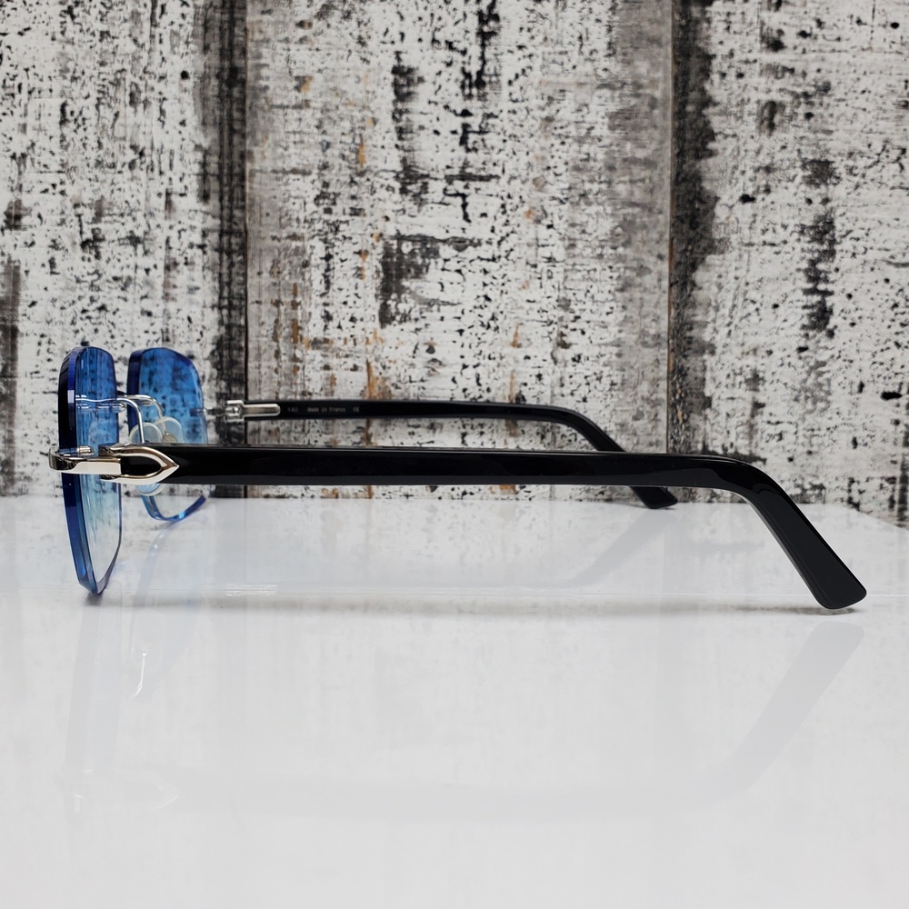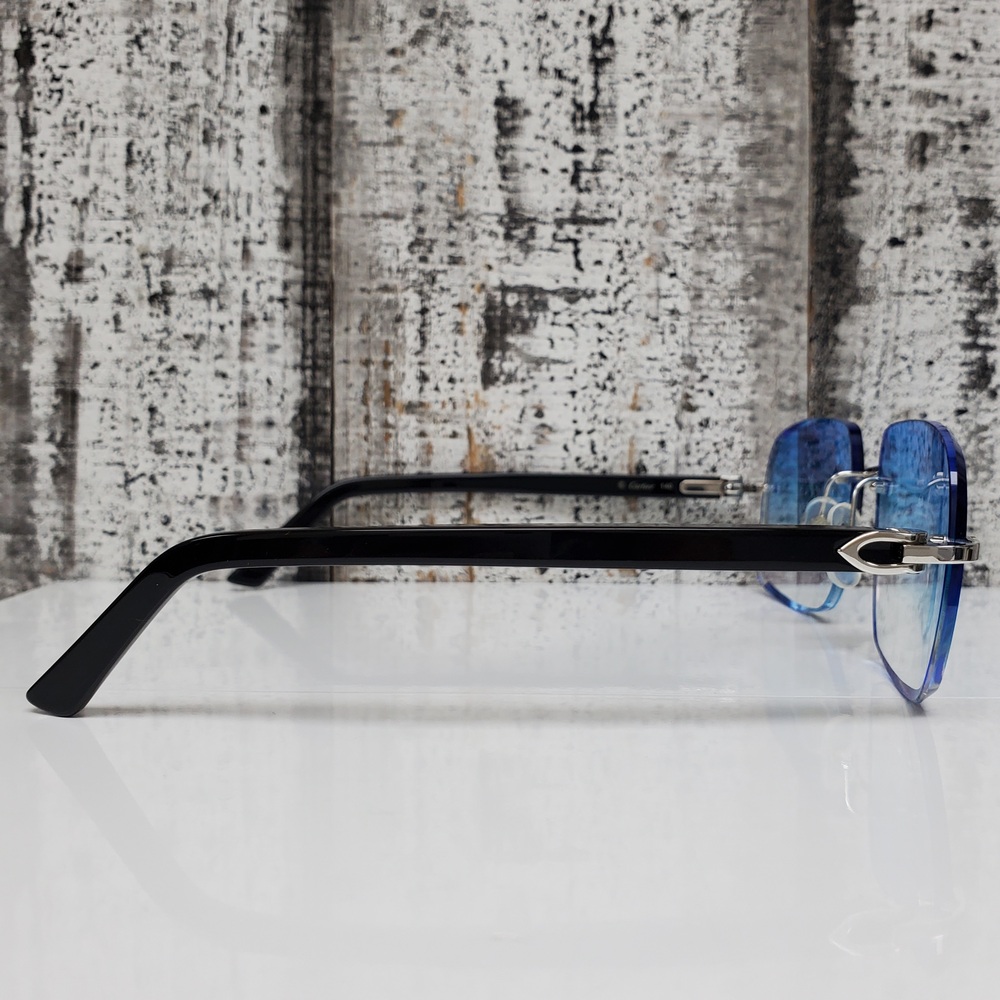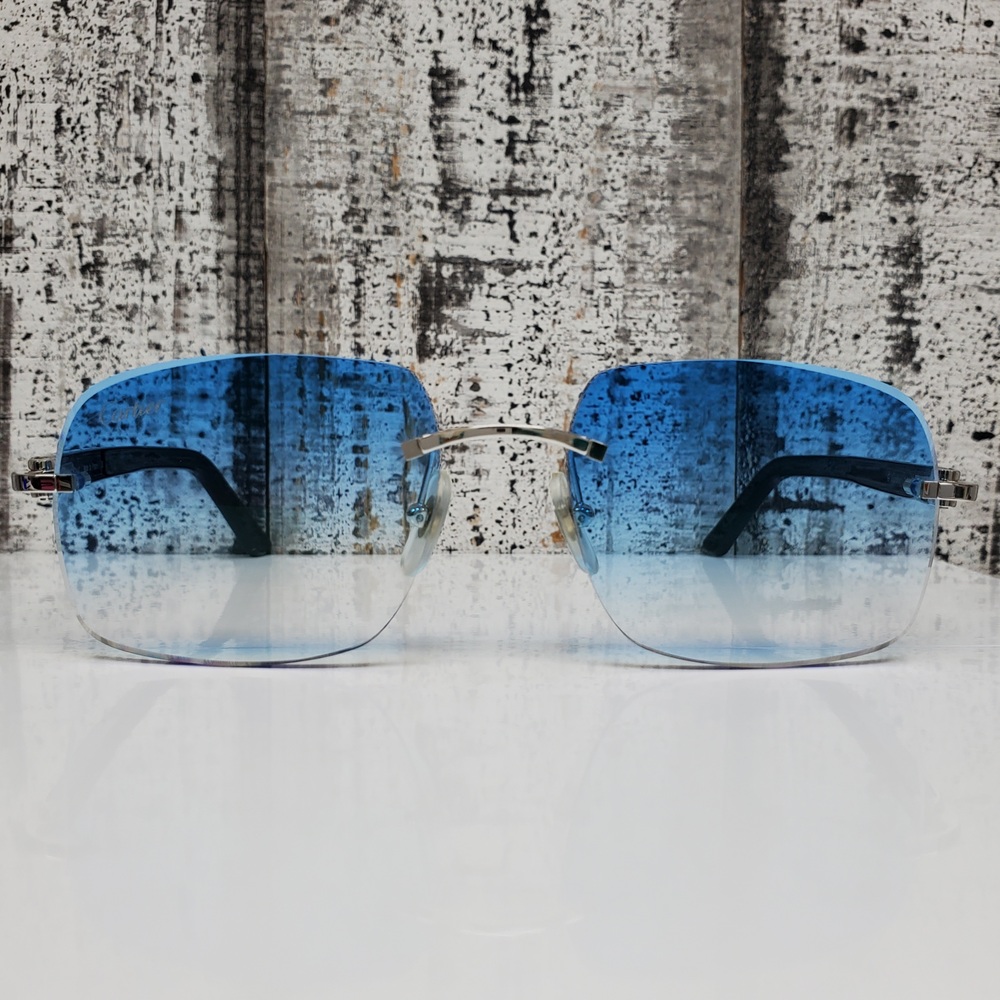 Elegant Cartier glasses featuring durable frames, adorned with stylishly incorporated brand accents, and enhanced with soothing, blue-tinted lenses for a unique, sophisticated aesthetic.