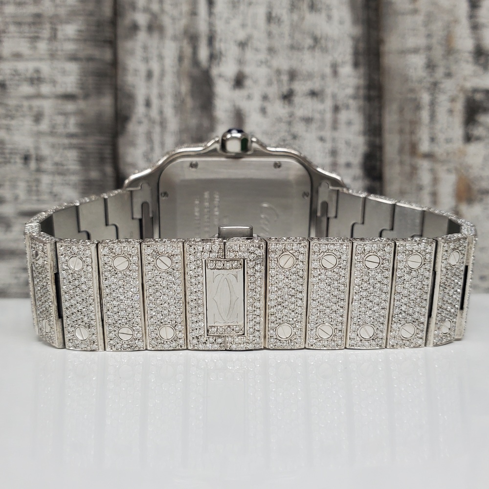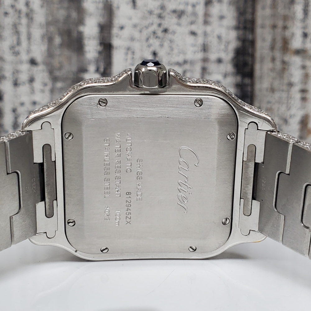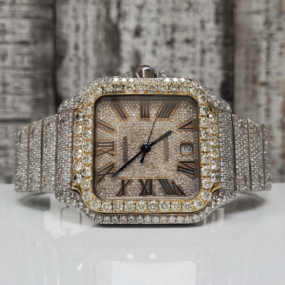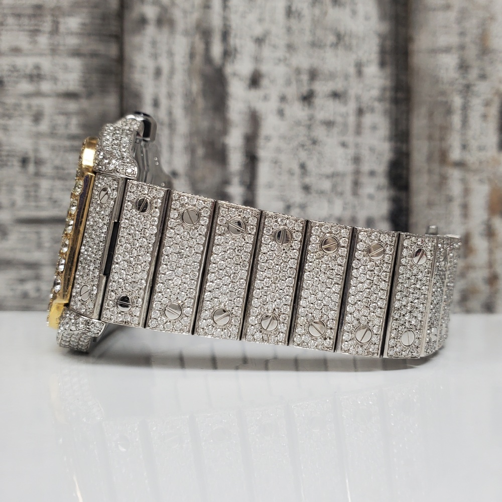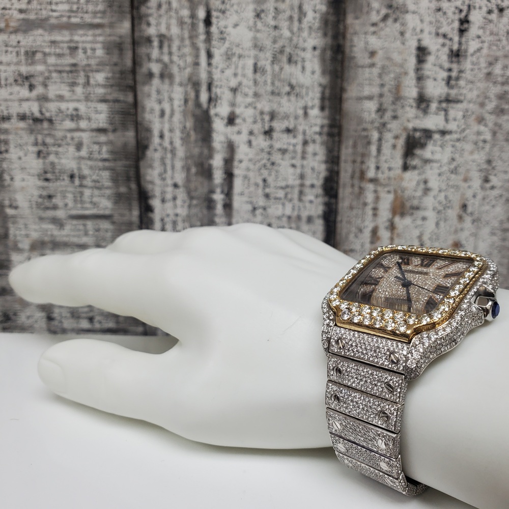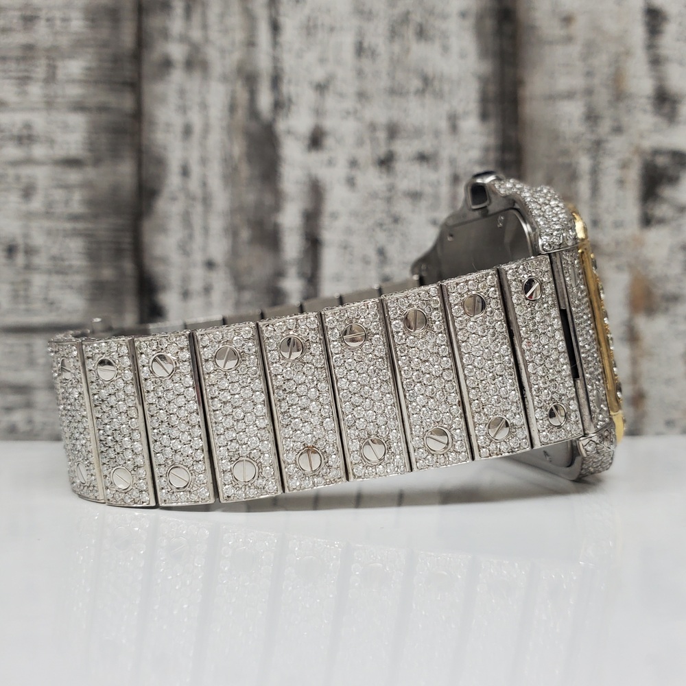 This stunning Cartier Santos 4072 watch boasts an estimated 17.25ctw diamond embellishments throughout the band, bezel, case and dial. Its luxurious design includes aftermarket parts with 87.1 dwt stainless steel and 18K yellow gold finishes. Please note, due to the aftermarket modifications, the watch's water resistance cannot be guaranteed. This glamorous timepiece is a must-have for premium jewelry collectors.