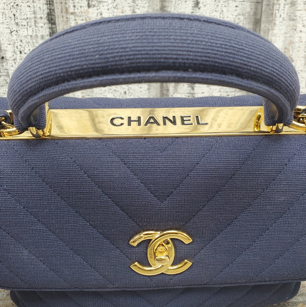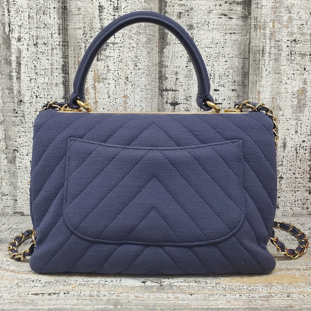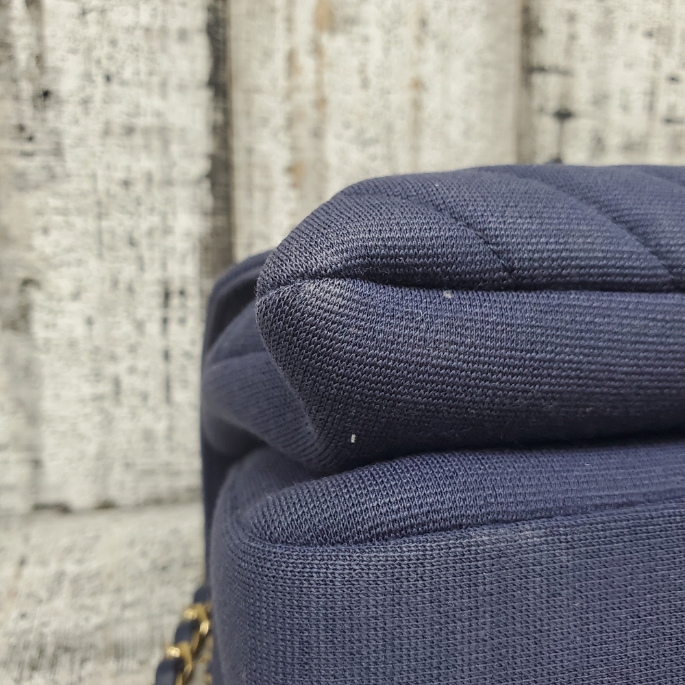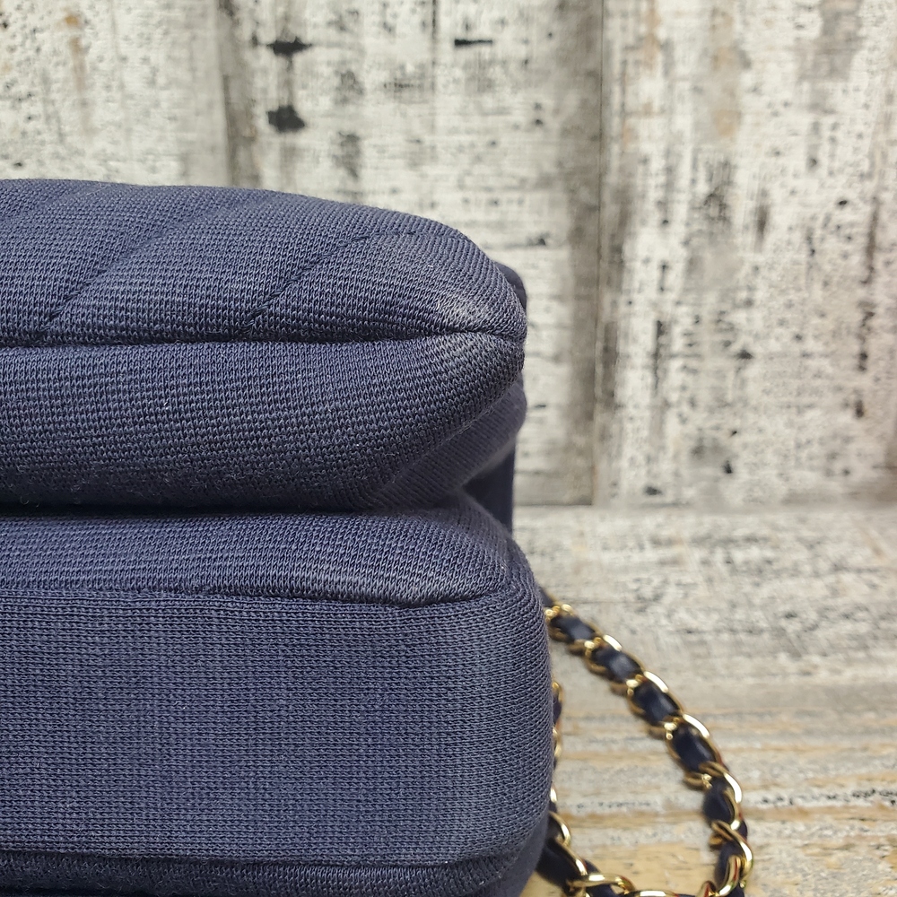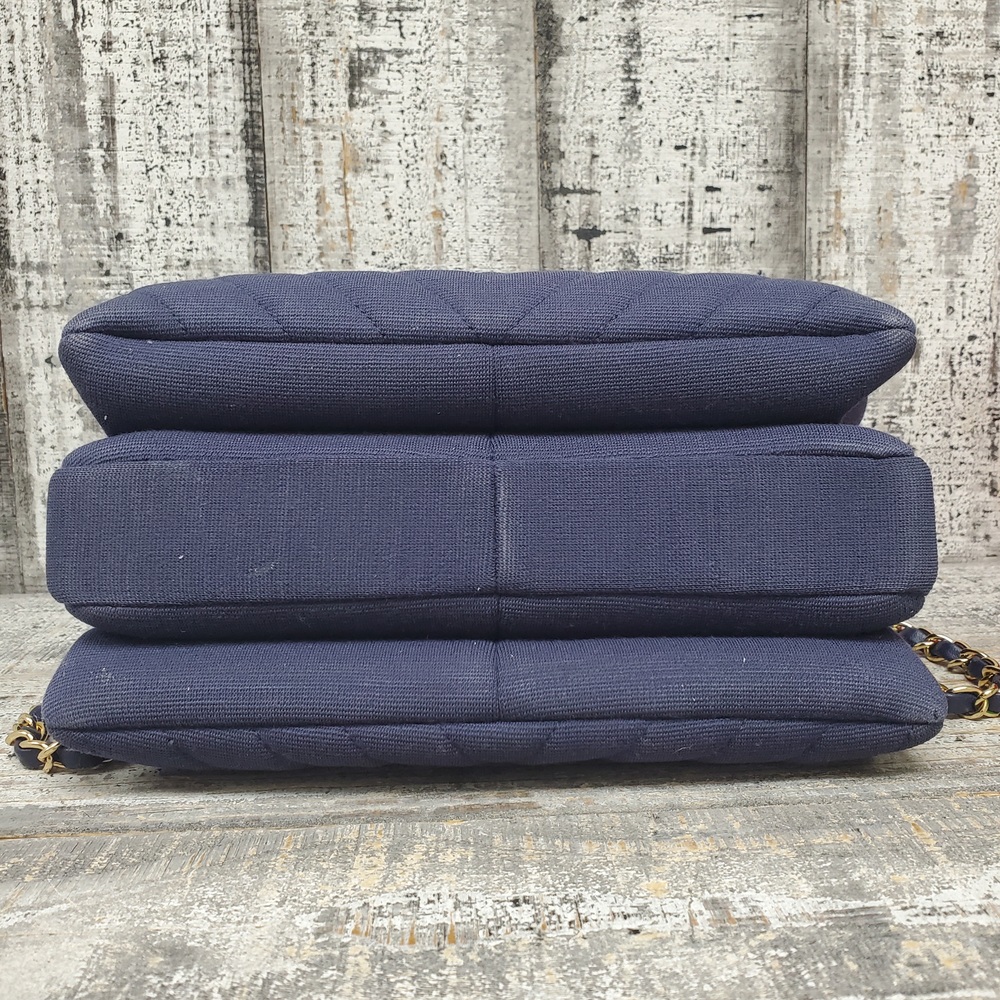 Used Chanel Chevron Jersey Flap Satchel Bag in small trendy CC design, navy blue color with quilted detailing, showcasing its timeless elegance and luxury.