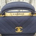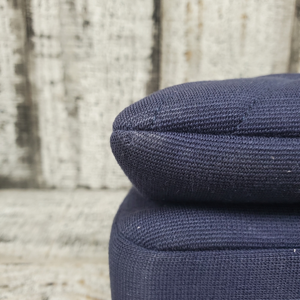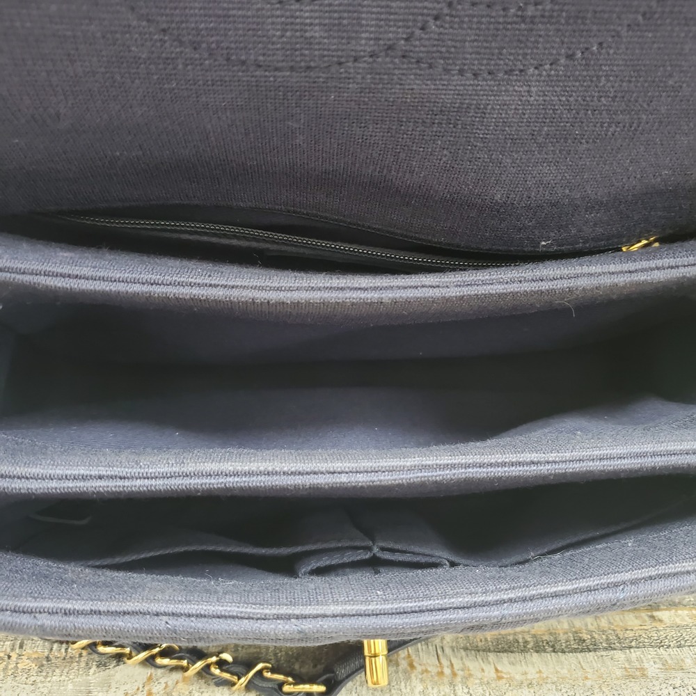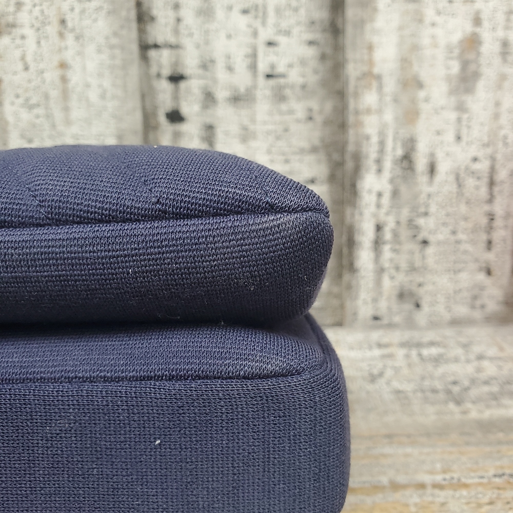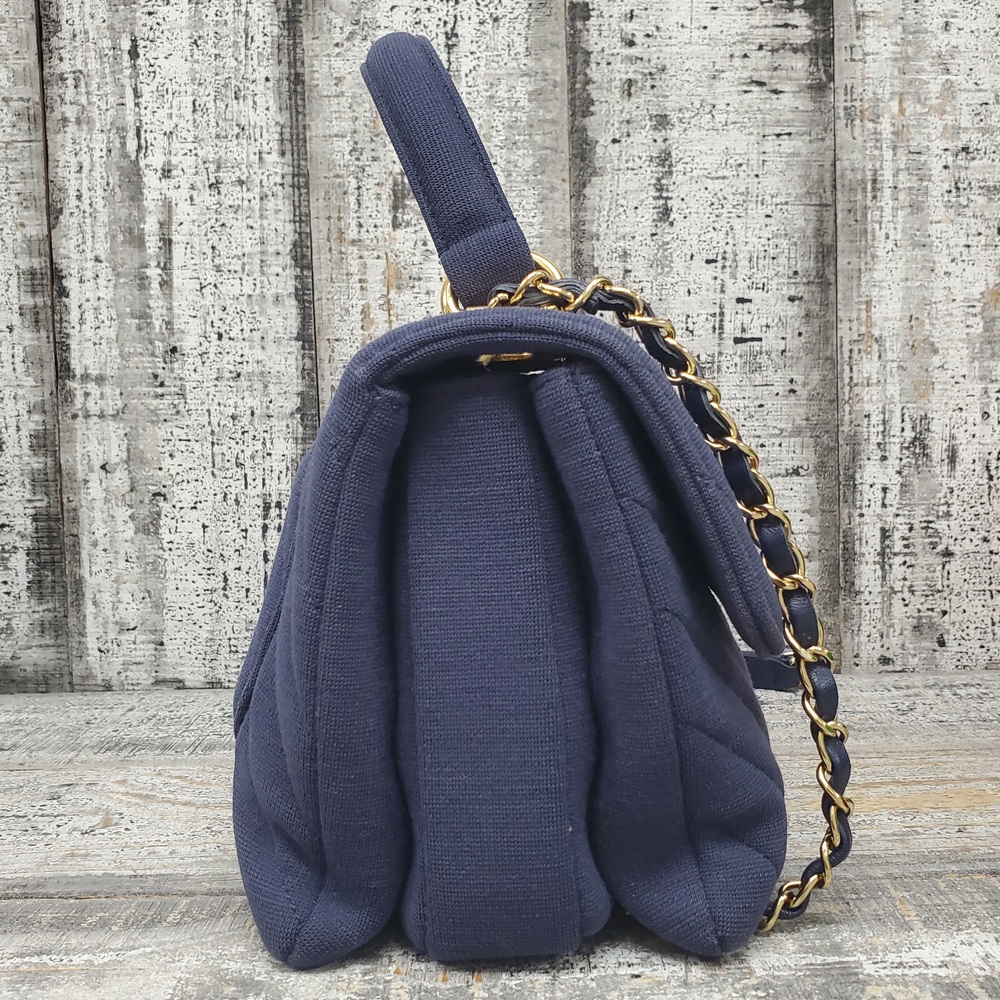 Used Chanel Chevron Jersey Flap Satchel Bag in small trendy CC design, navy blue color with quilted detailing, showcasing its timeless elegance and luxury.