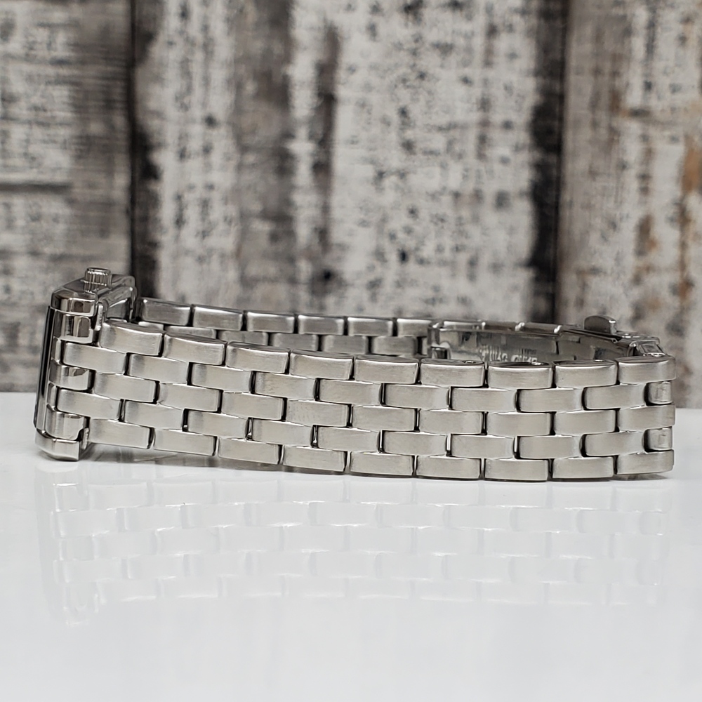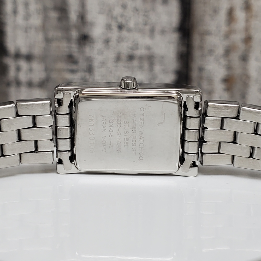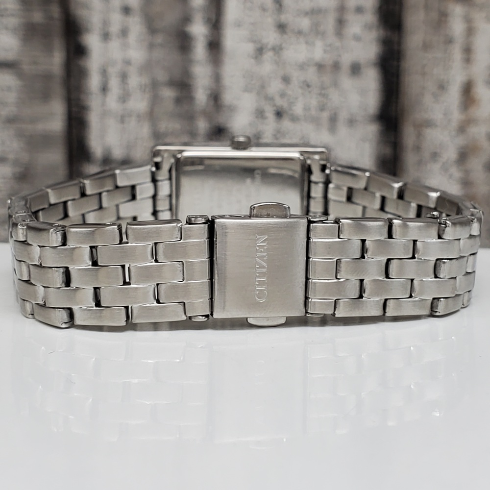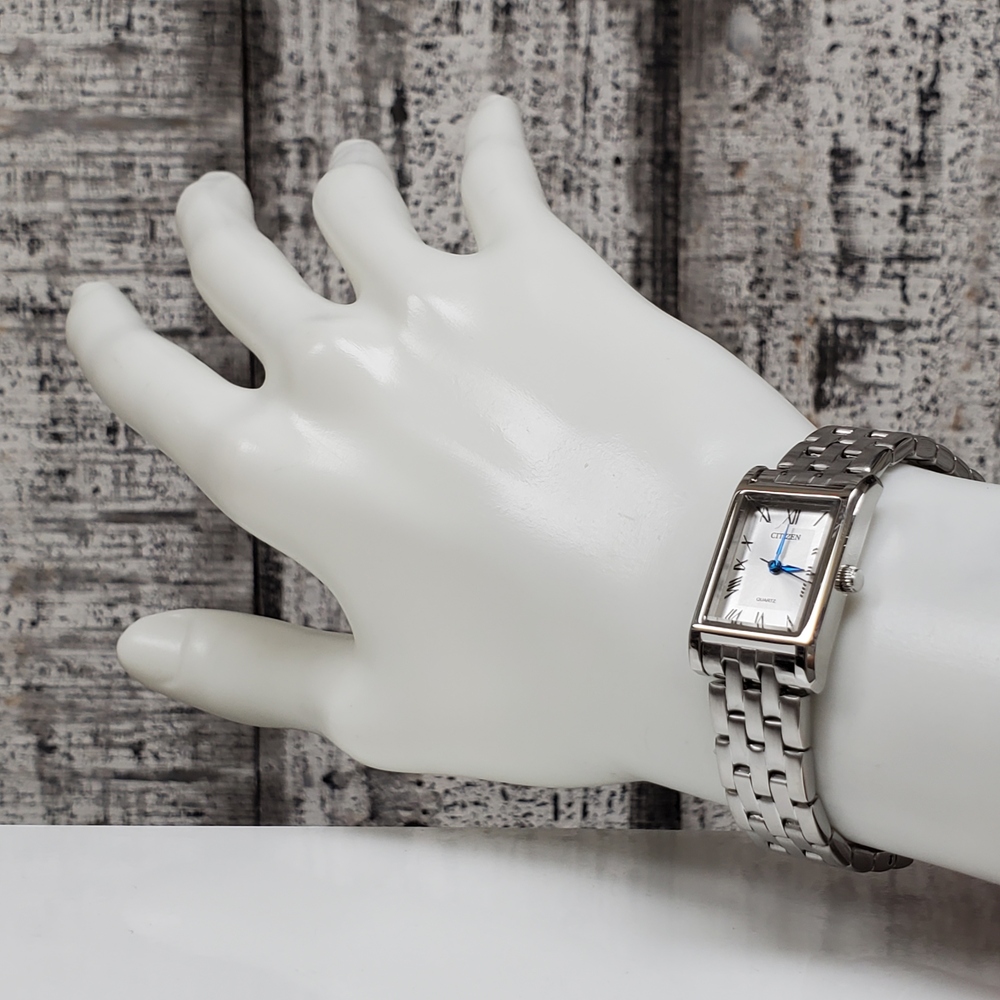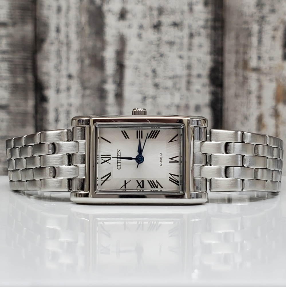 A stylish, stainless steel ladies watch by Citizen, featuring a rectangular dial, sleek design, precision timekeeping, and durable construction.