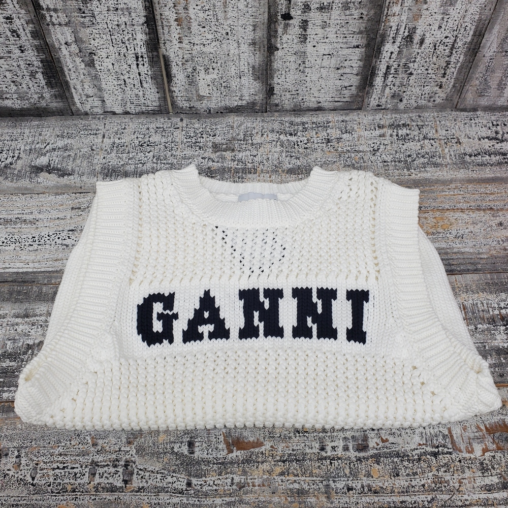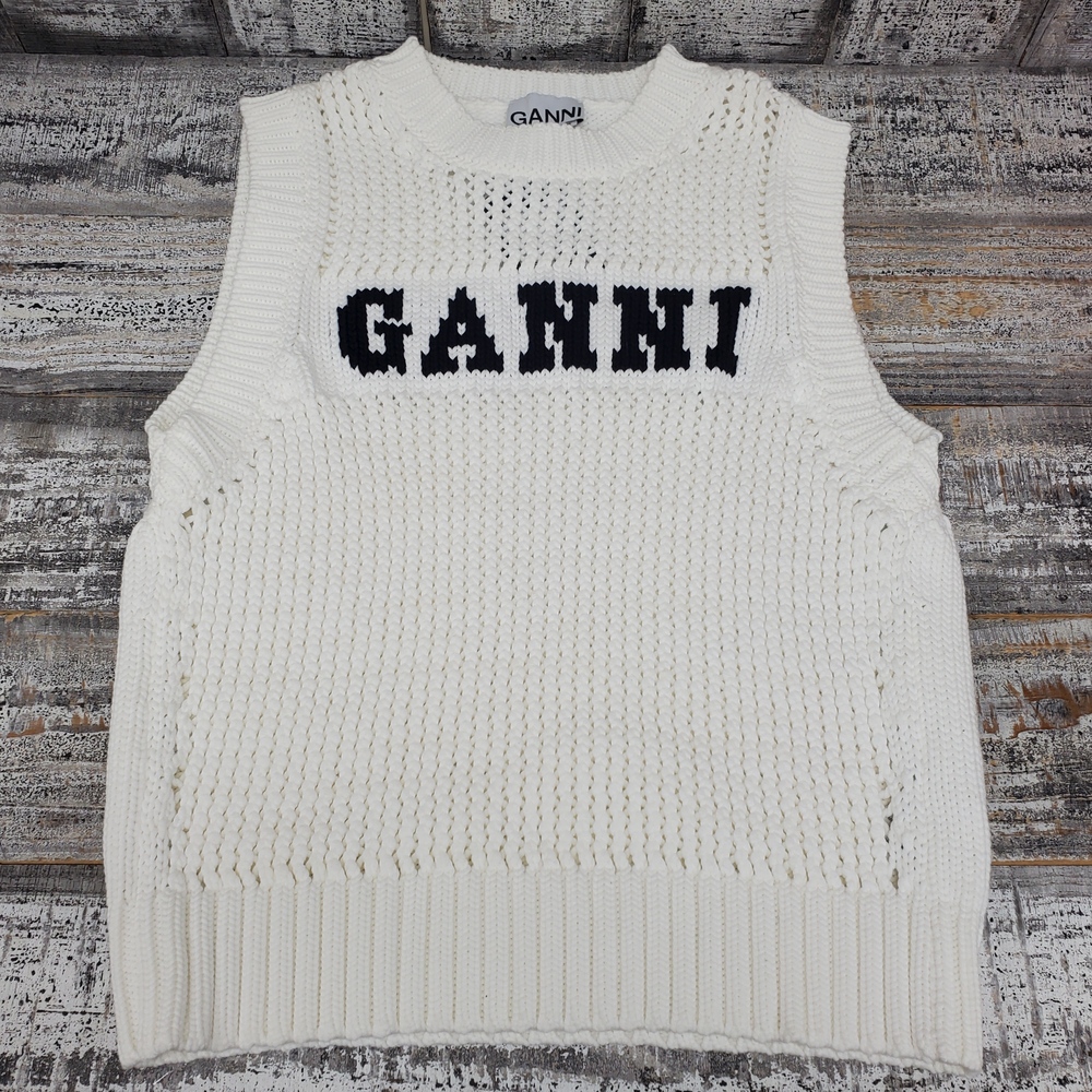 A stylish Ganni sweater vest in size L, featuring high-quality material, trendy design, comfortable fit, versatile for various occasions, and in excellent condition.