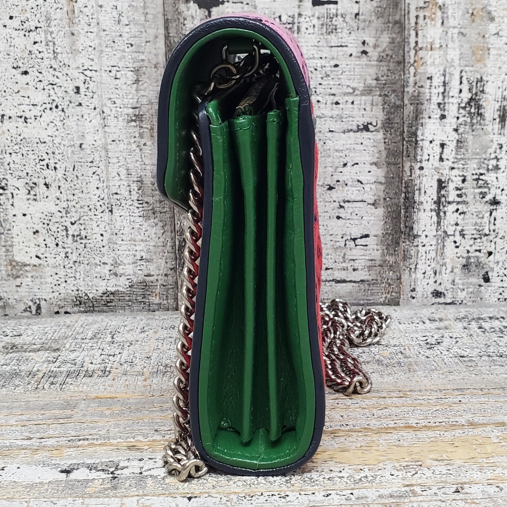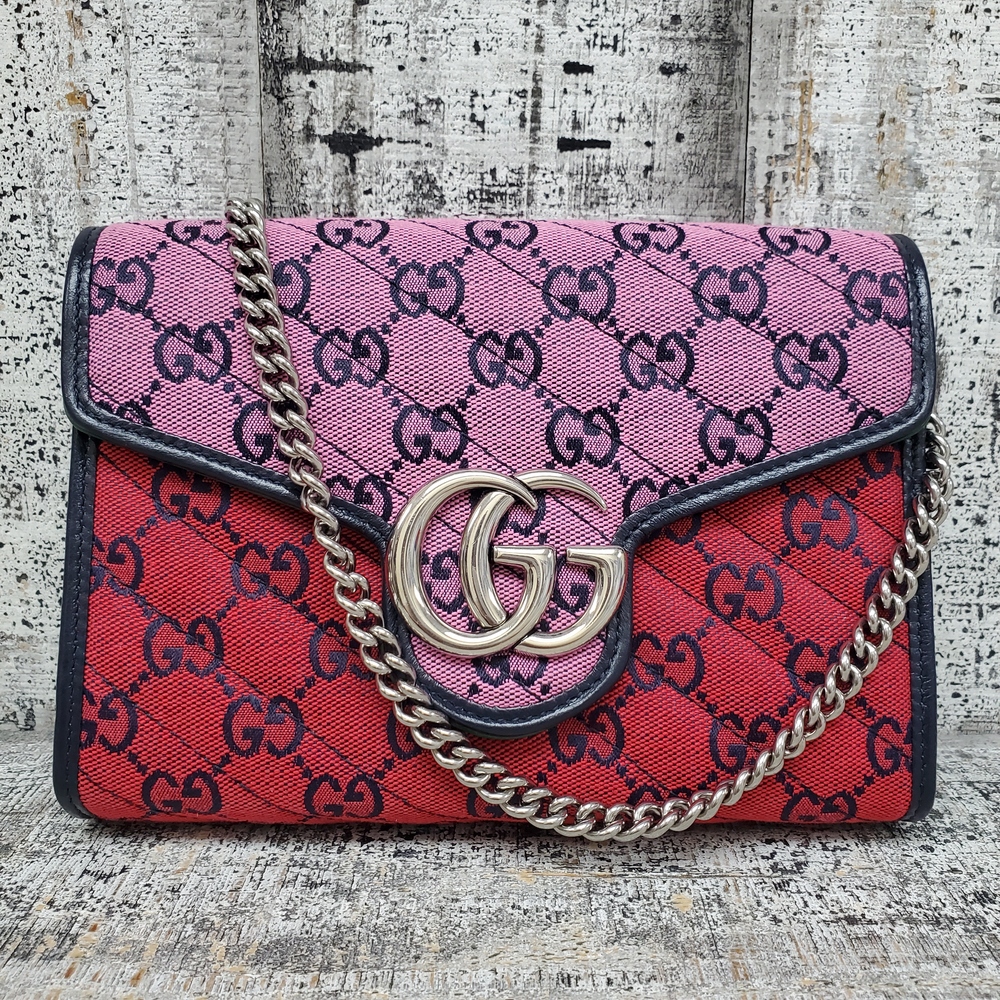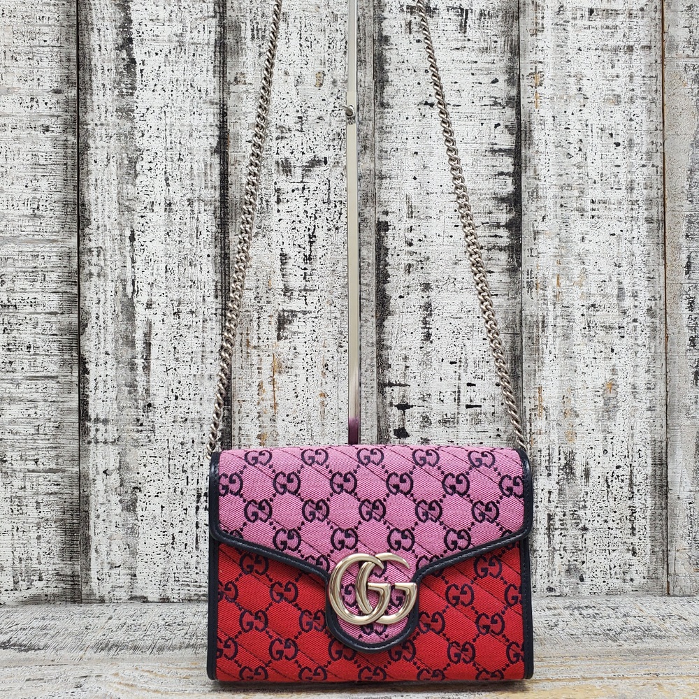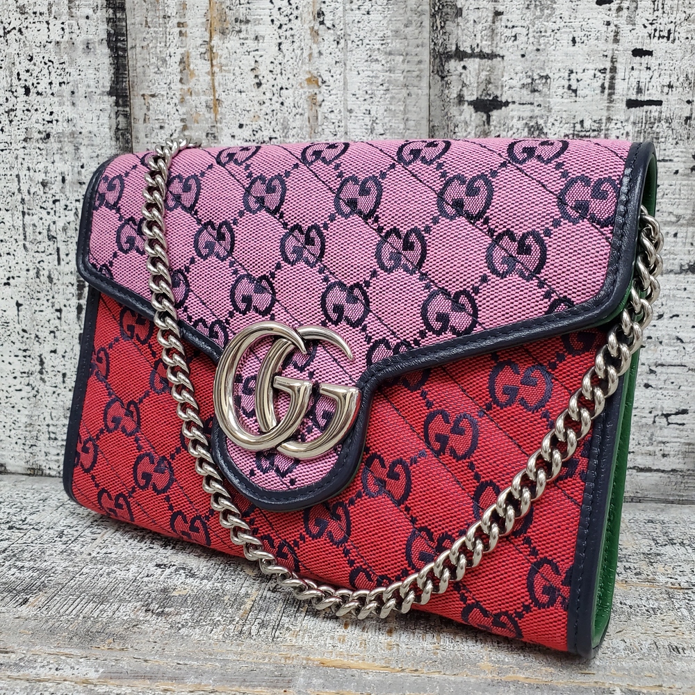 A pristine 2021 Gucci Marmont Bag, showcasing a vibrant multicolor palette, luxurious hardware details, classic quilted design, an epitome of fashion-forward elegance and functionality.
