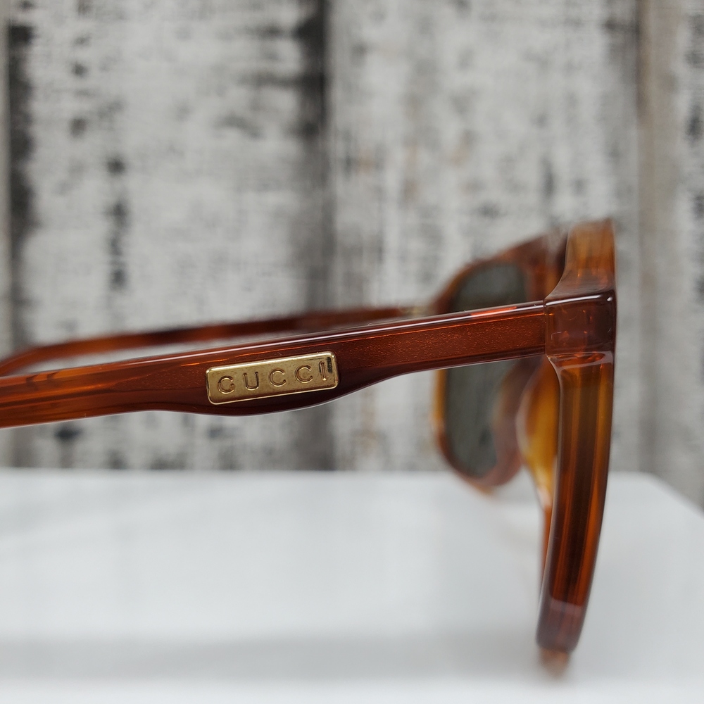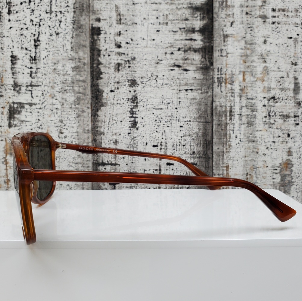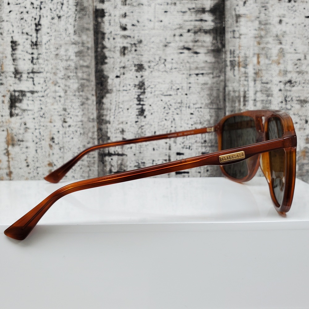 Stylish Gucci brown sunglasses, featuring a sleek double bridge design, in excellent, like-new condition. Perfect addition to any sophisticated, fashion-forward wardrobe.