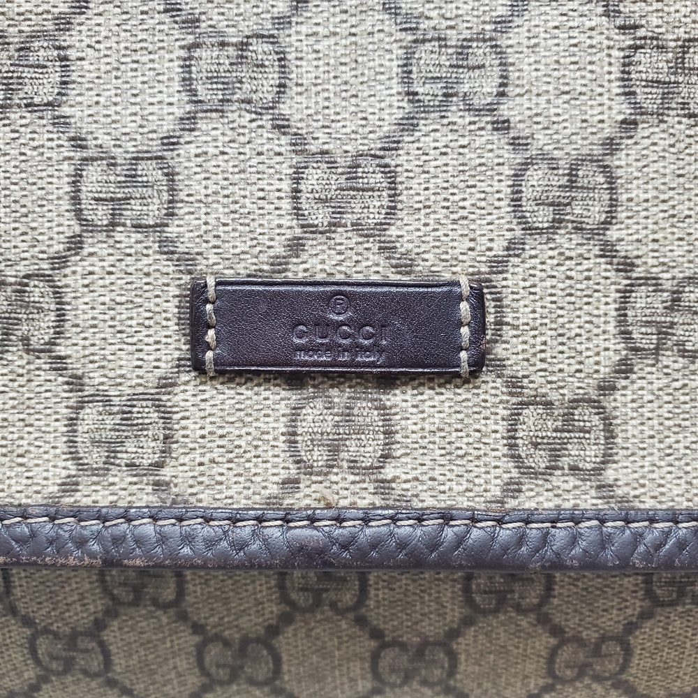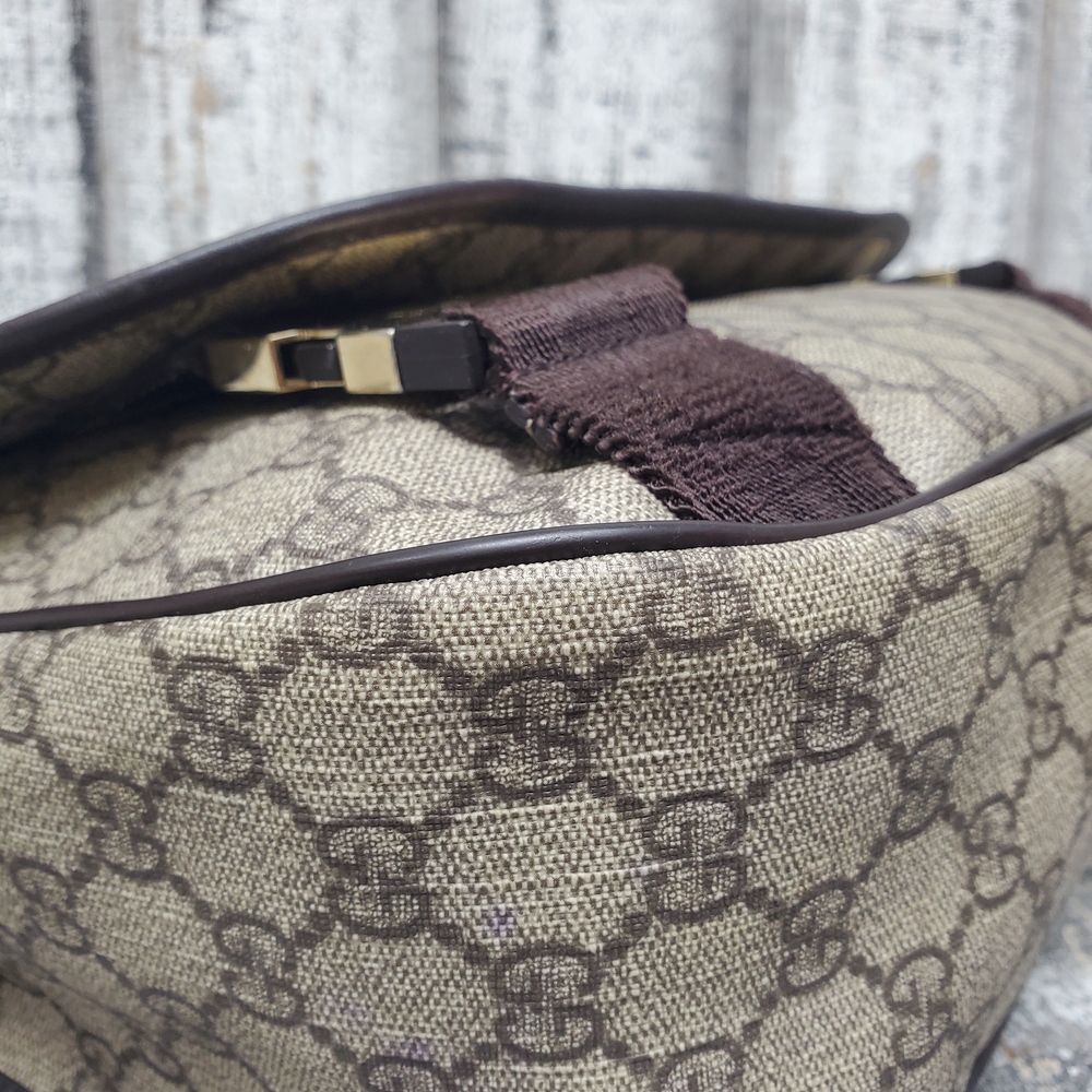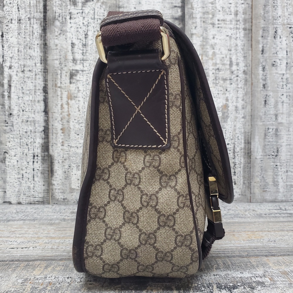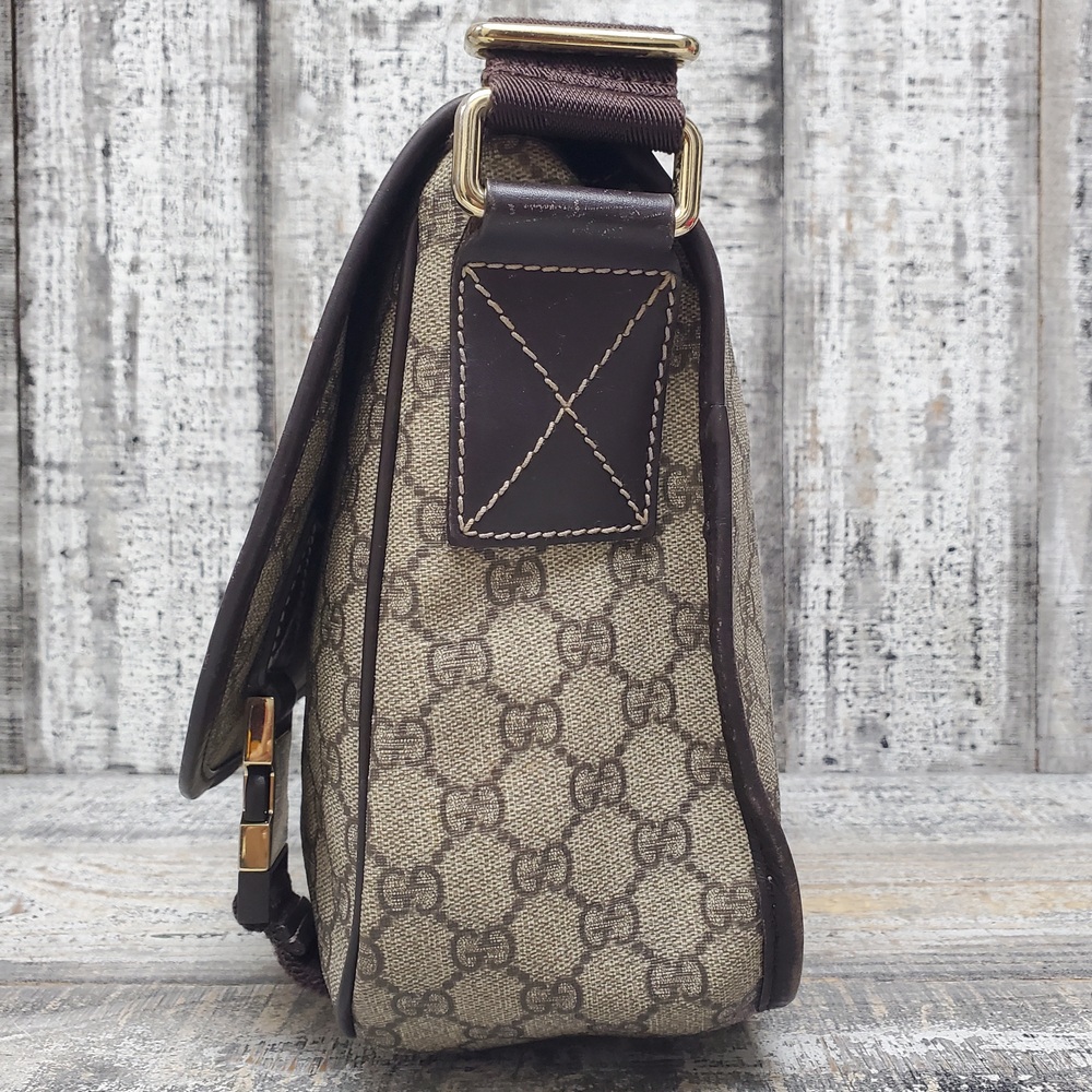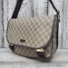 A pre-loved Gucci crossbody messenger bag, featuring iconic GG logo pattern, adjustable strap, secure zip closure, perfect for daily use with a chic, classy appeal.