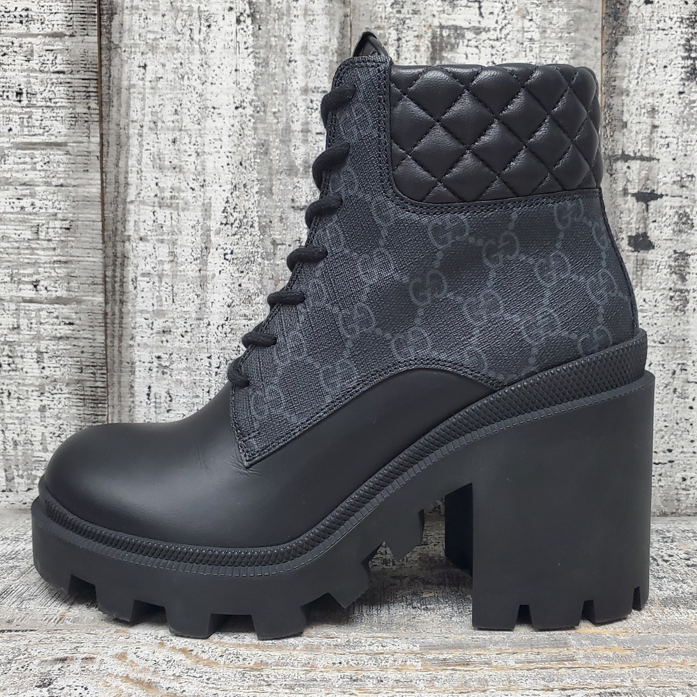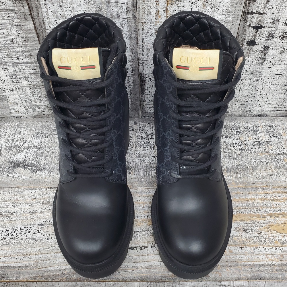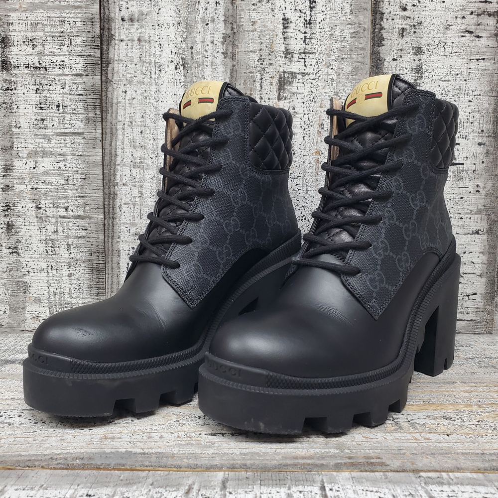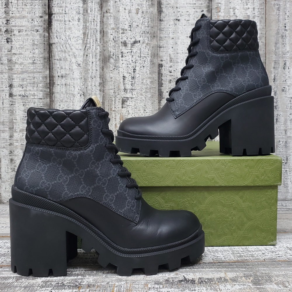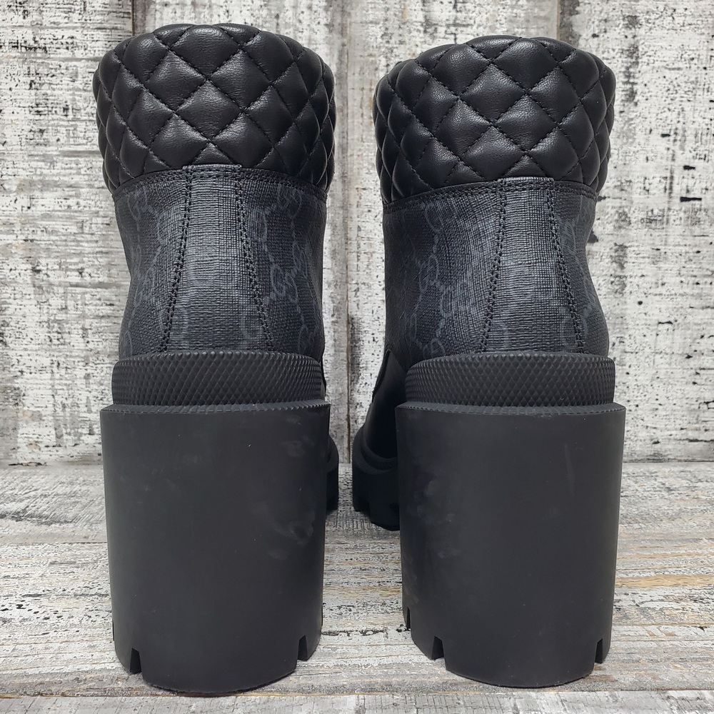 Stylish black Gucci GG ankle boots for women, size 38, featuring premium materials and iconic branding, delivered in original packaging. Elegant and versatile footwear.