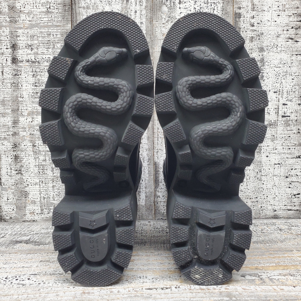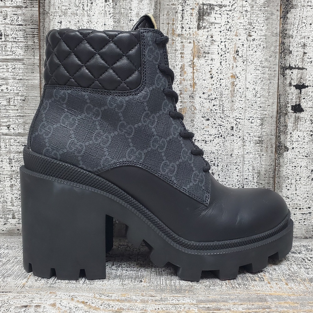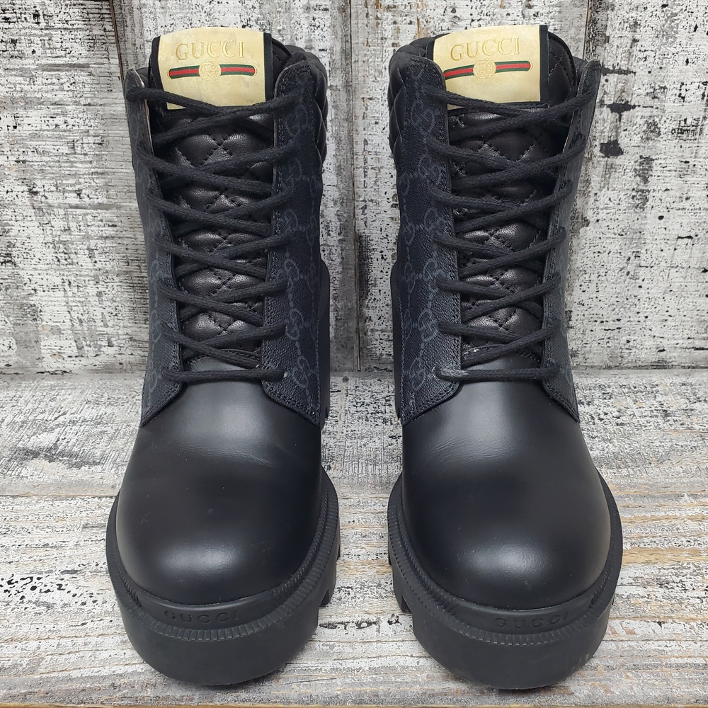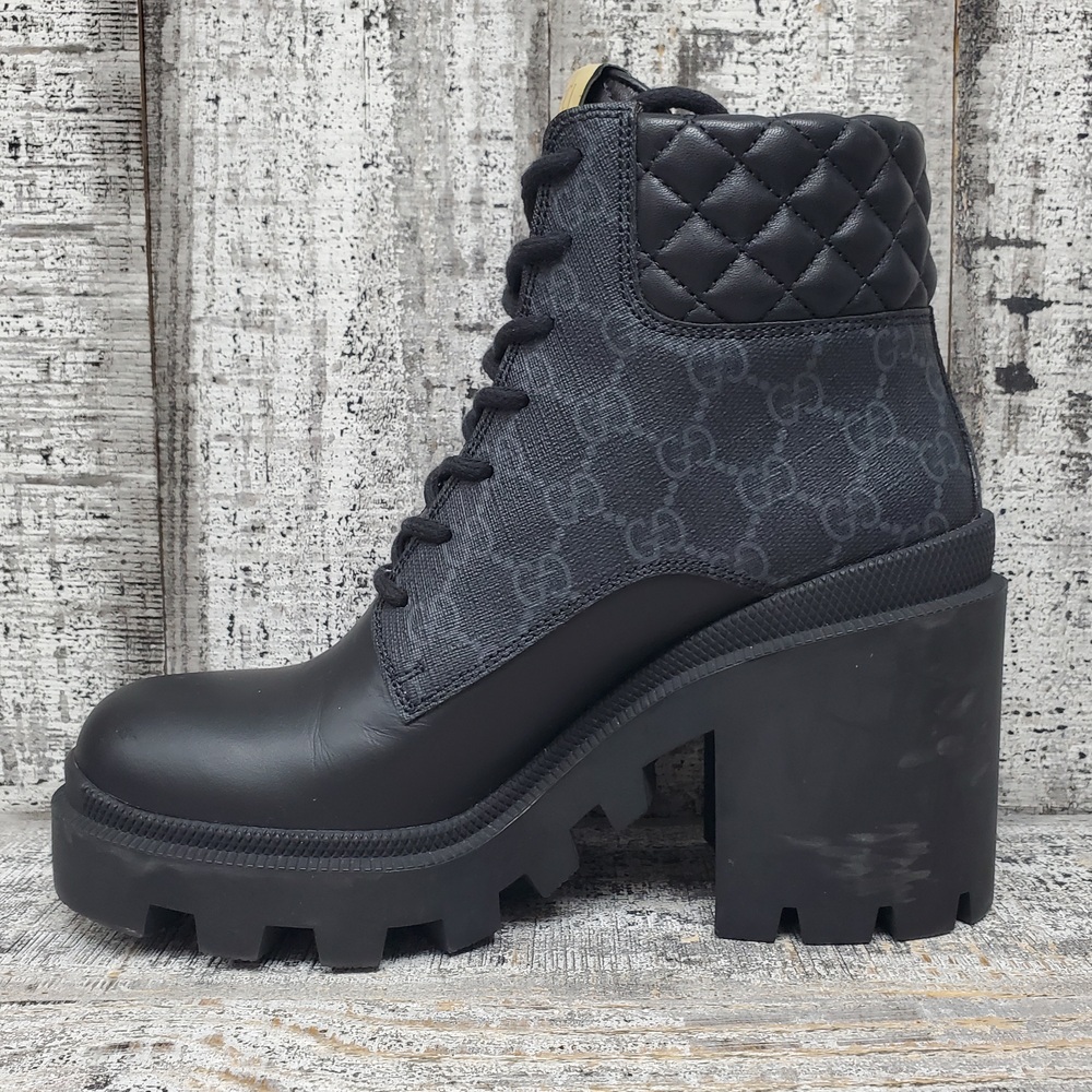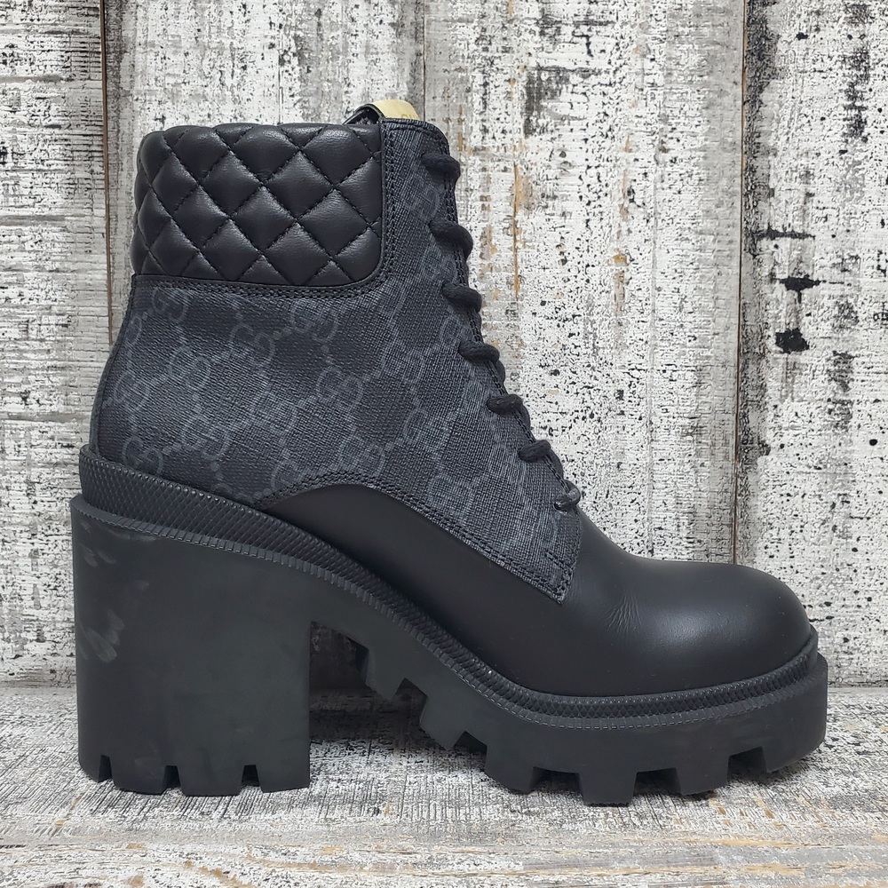 Stylish black Gucci GG ankle boots for women, size 38, featuring premium materials and iconic branding, delivered in original packaging. Elegant and versatile footwear.