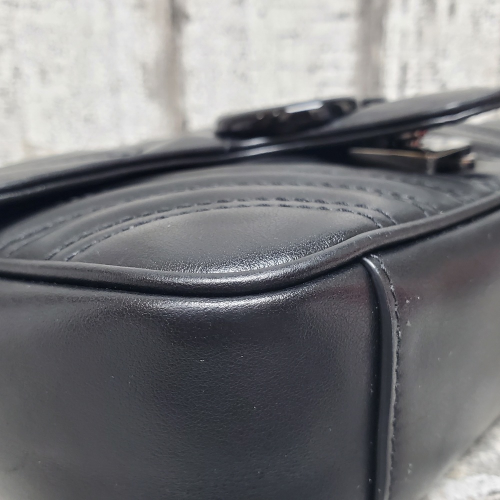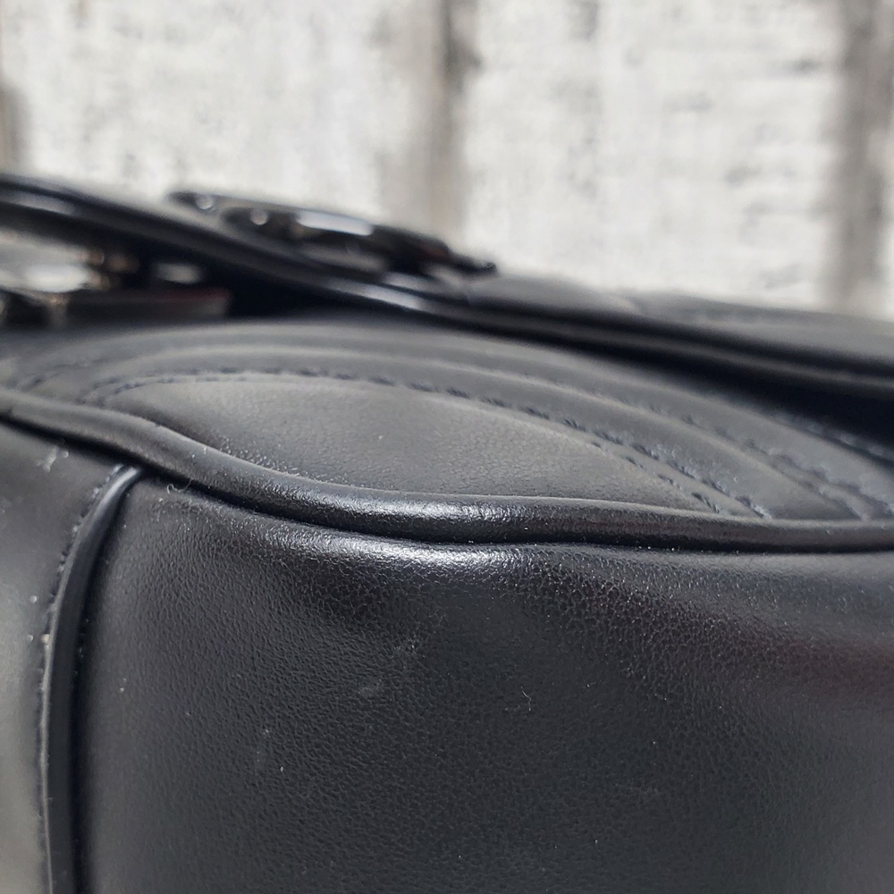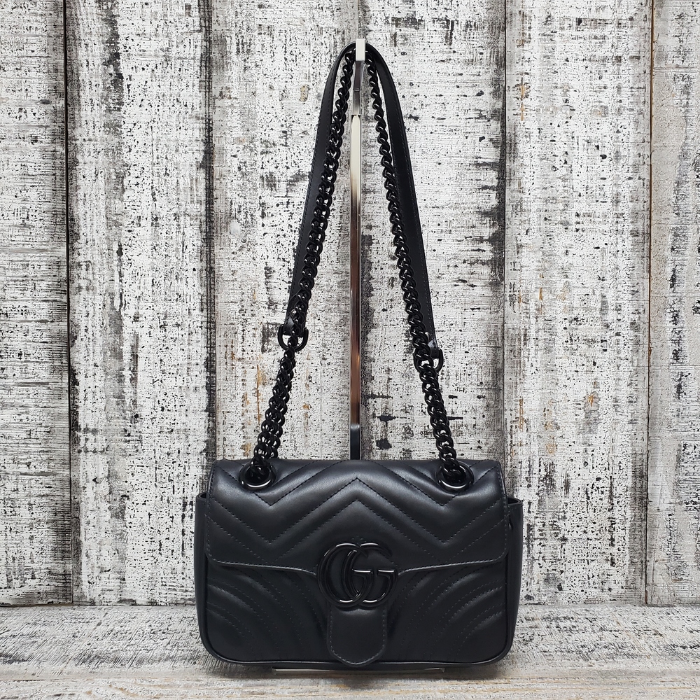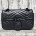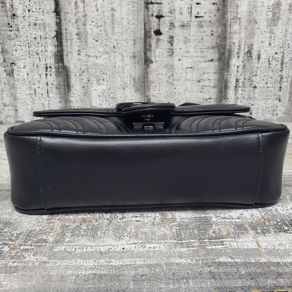 A stylish, compact Gucci Marmont small shoulder bag, featuring black leather, gold-tone hardware, a GG logo, and a chain strap. Perfect for everyday elegance.