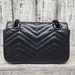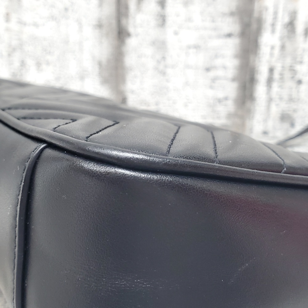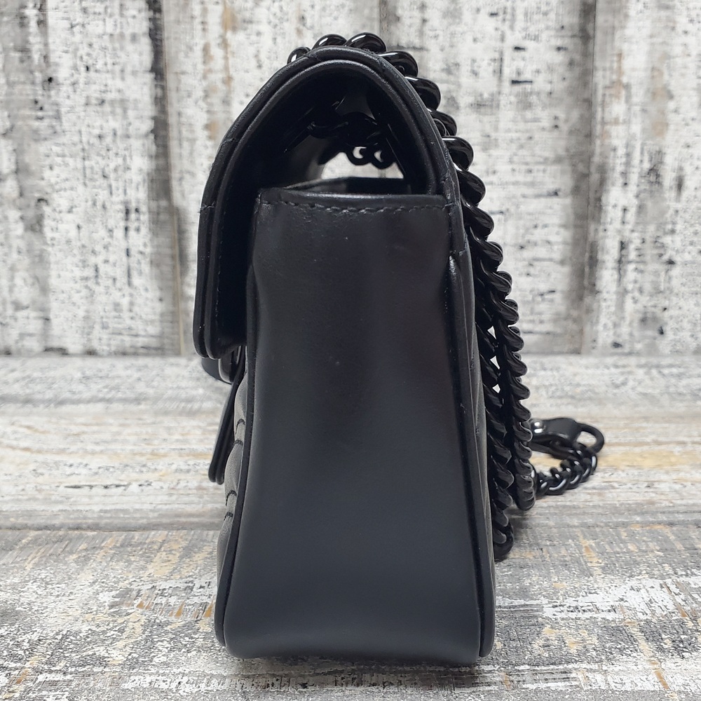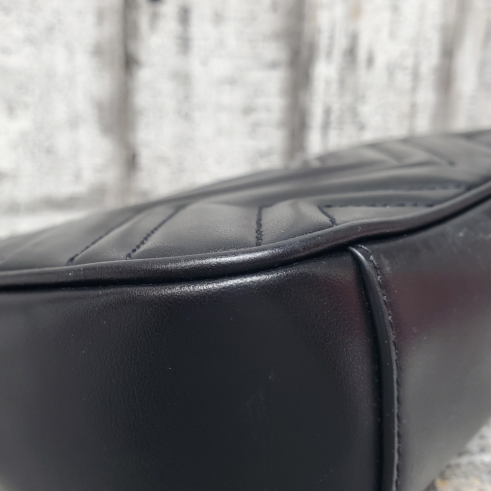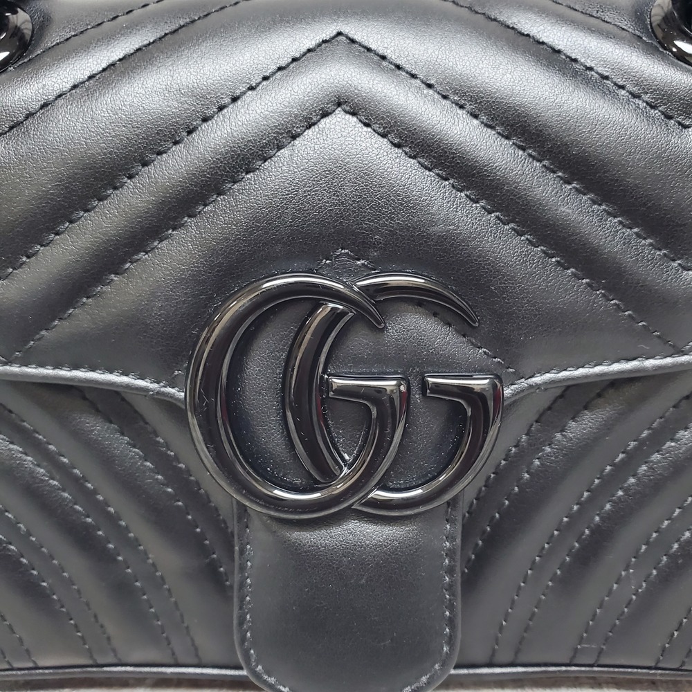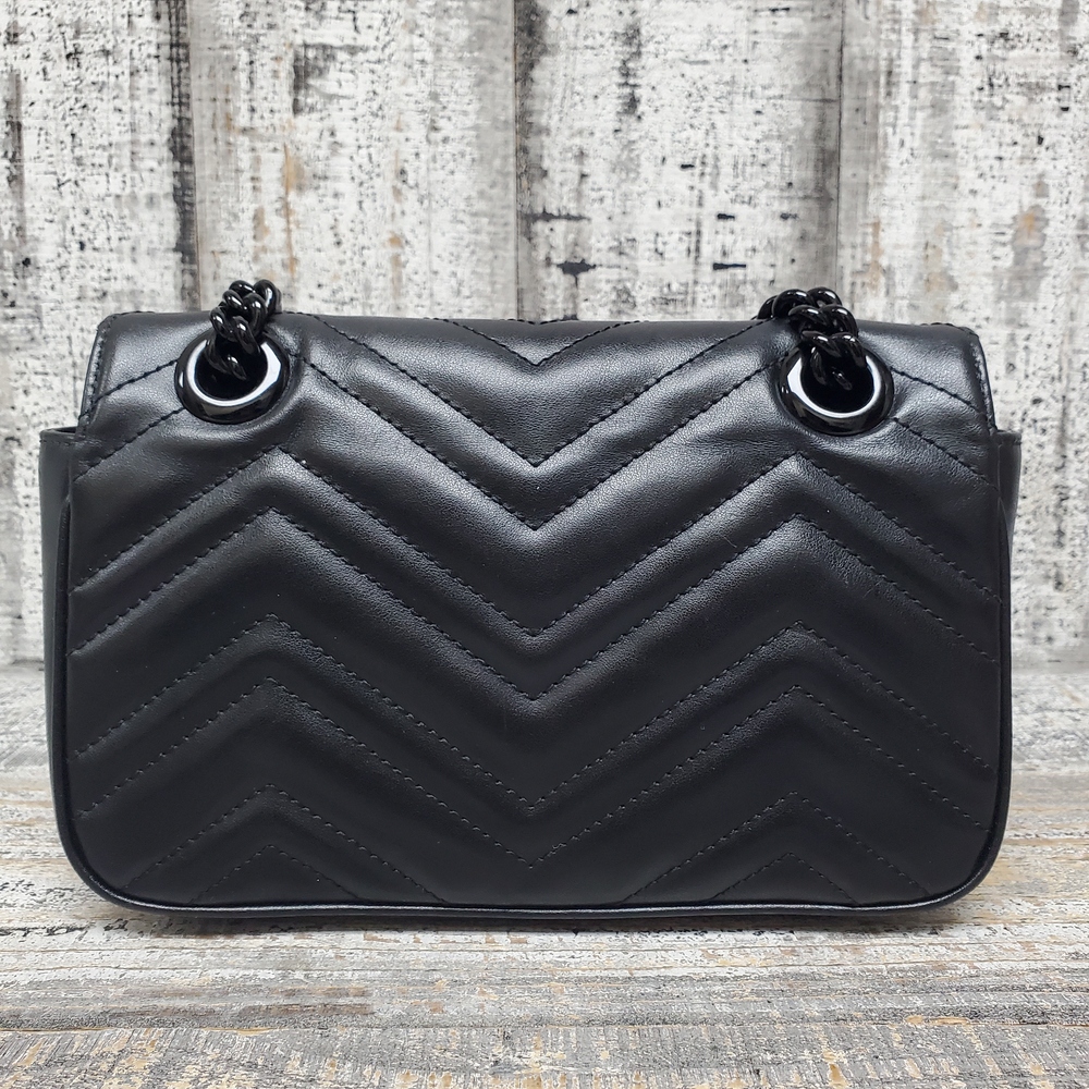 A stylish, compact Gucci Marmont small shoulder bag, featuring black leather, gold-tone hardware, a GG logo, and a chain strap. Perfect for everyday elegance.