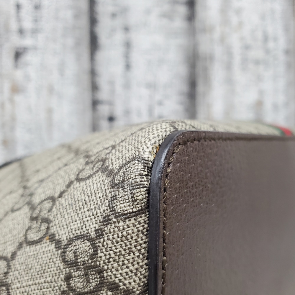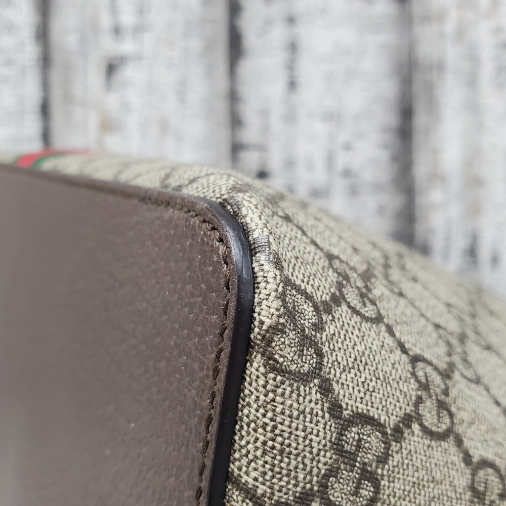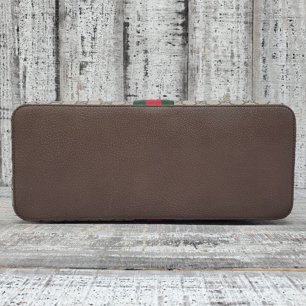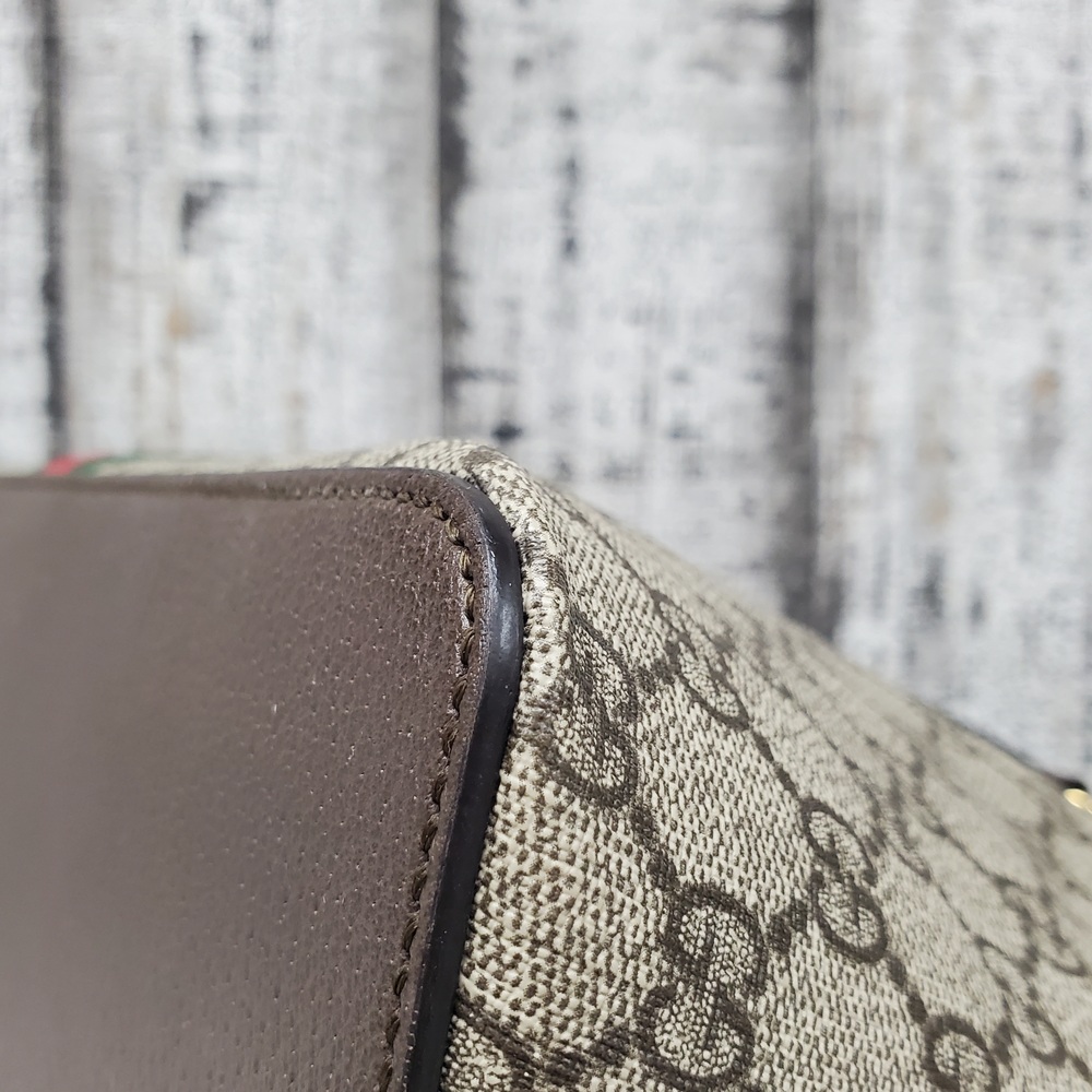 The Gucci Medium GG Supreme Canvas Ophidia Tote and Shoulder Bag is a versatile and stylish accessory. It's crafted from signature GG Supreme canvas with leather trim for a deluxe finish. Features double handles, a detachable shoulder strap, and a spacious interior. In good condition, exemplifying Gucci's timeless elegance!