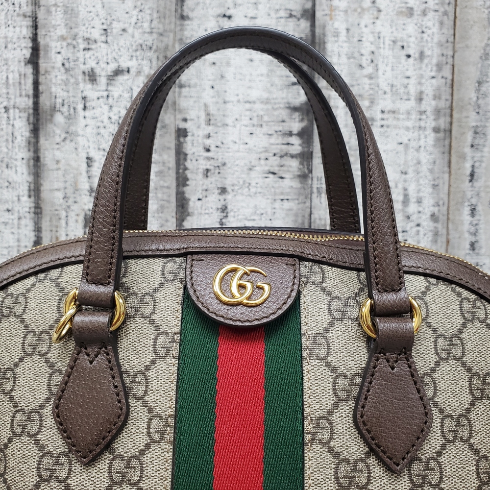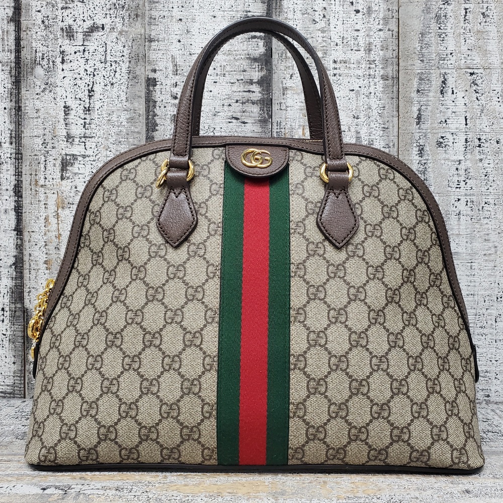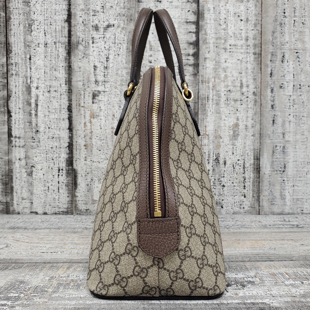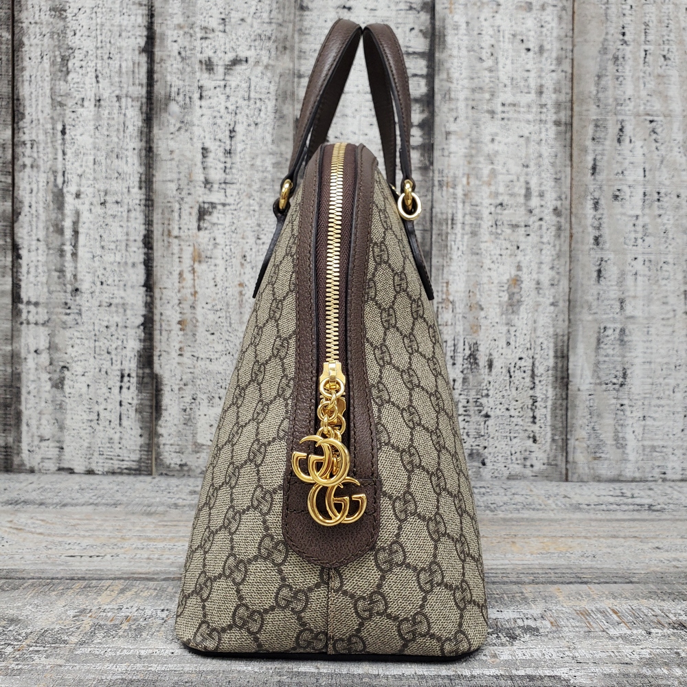 The Gucci Medium GG Supreme Canvas Ophidia Tote and Shoulder Bag is a versatile and stylish accessory. It's crafted from signature GG Supreme canvas with leather trim for a deluxe finish. Features double handles, a detachable shoulder strap, and a spacious interior. In good condition, exemplifying Gucci's timeless elegance!