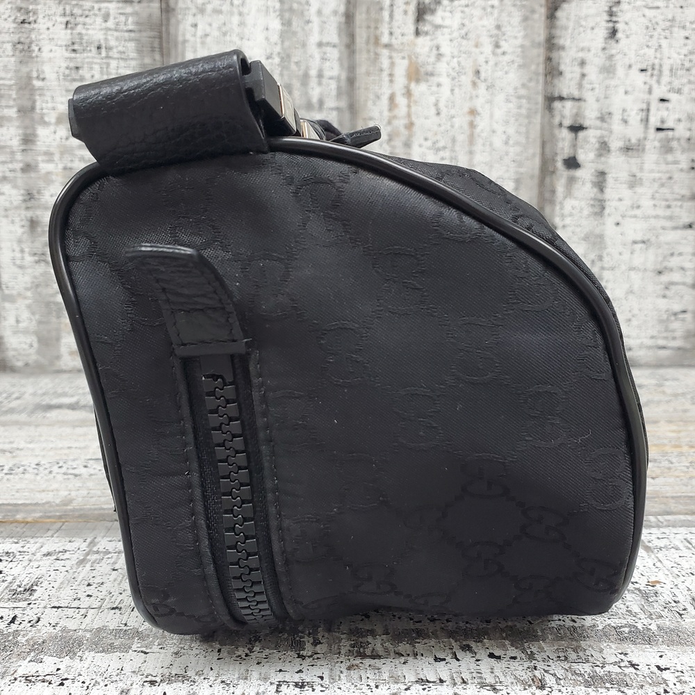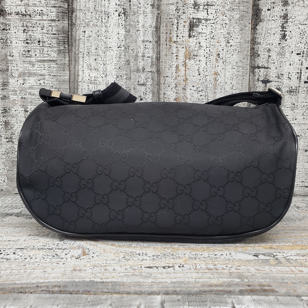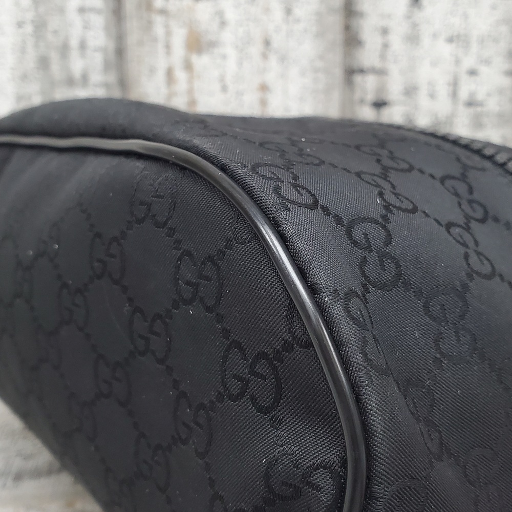 Pre-owned Gucci Nylon GG bag with visible signs of wear, slight discoloration, minor scuffs, and overall used condition reflecting authentic character and charm.