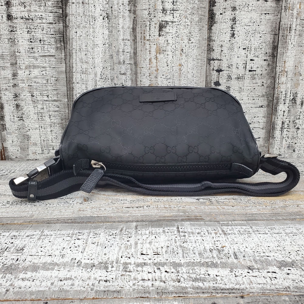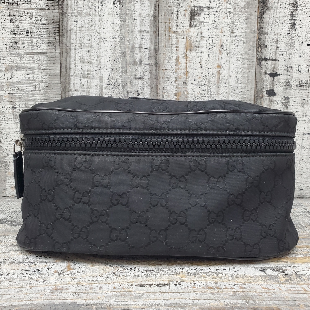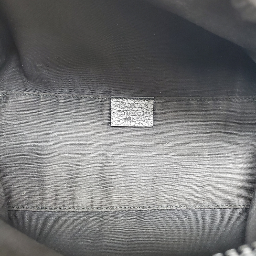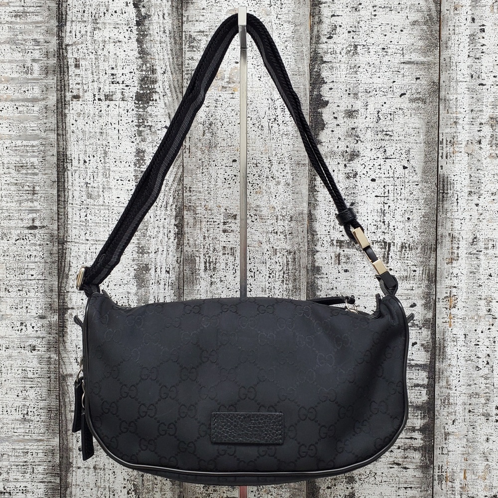 Pre-owned Gucci Nylon GG bag with visible signs of wear, slight discoloration, minor scuffs, and overall used condition reflecting authentic character and charm.