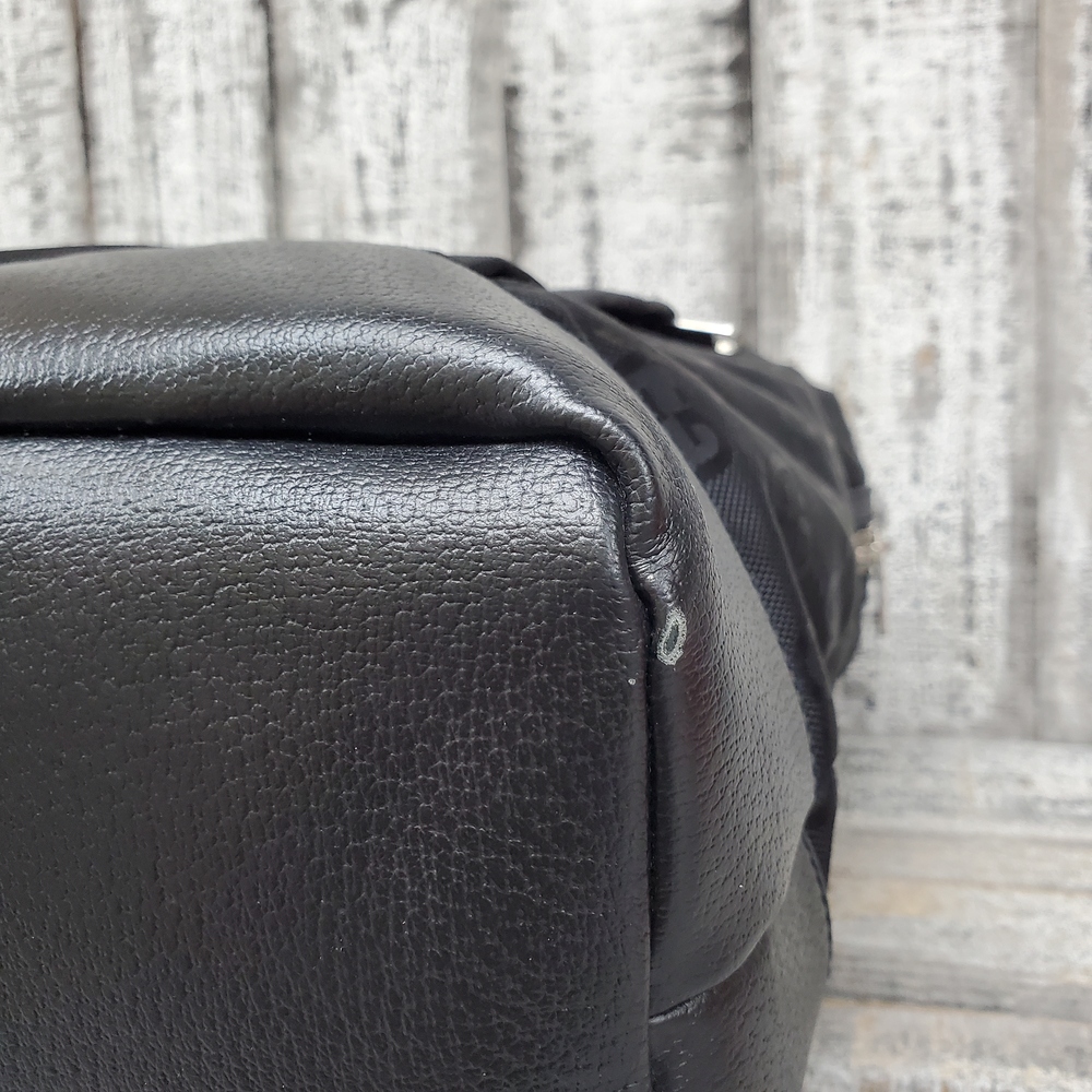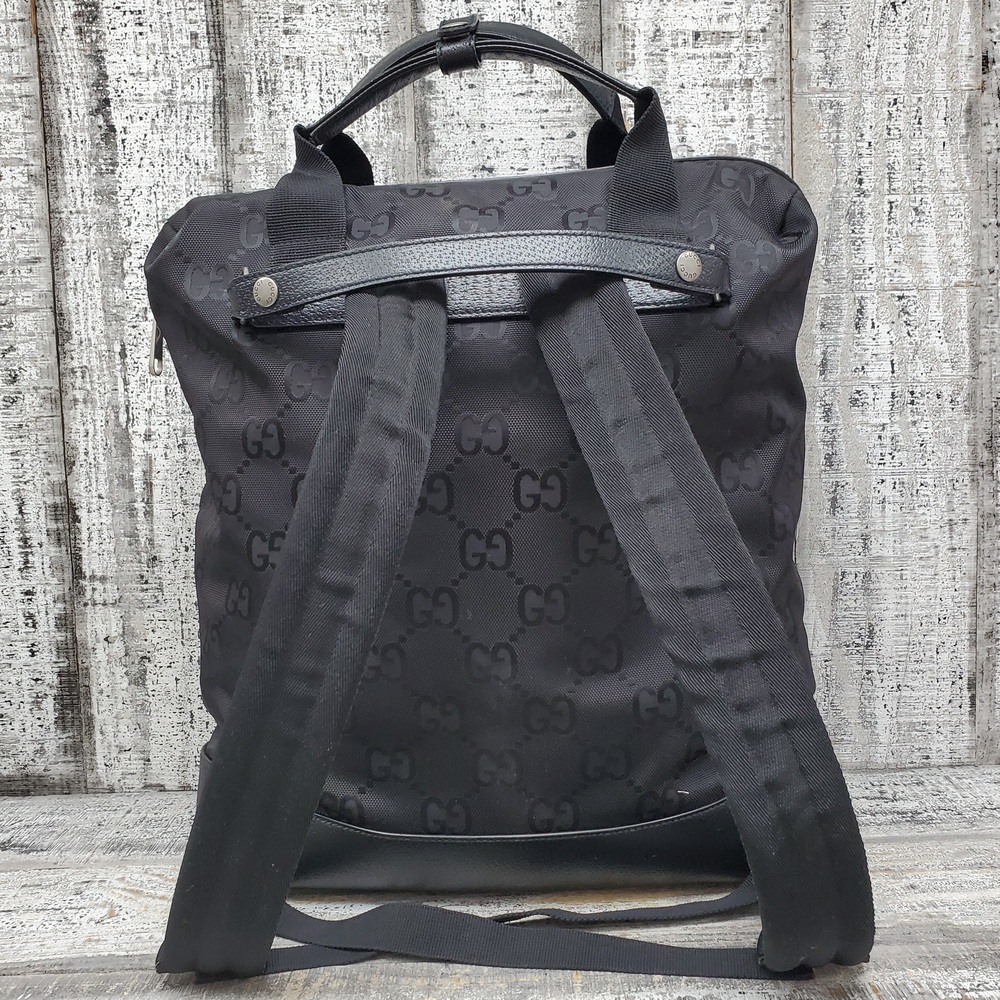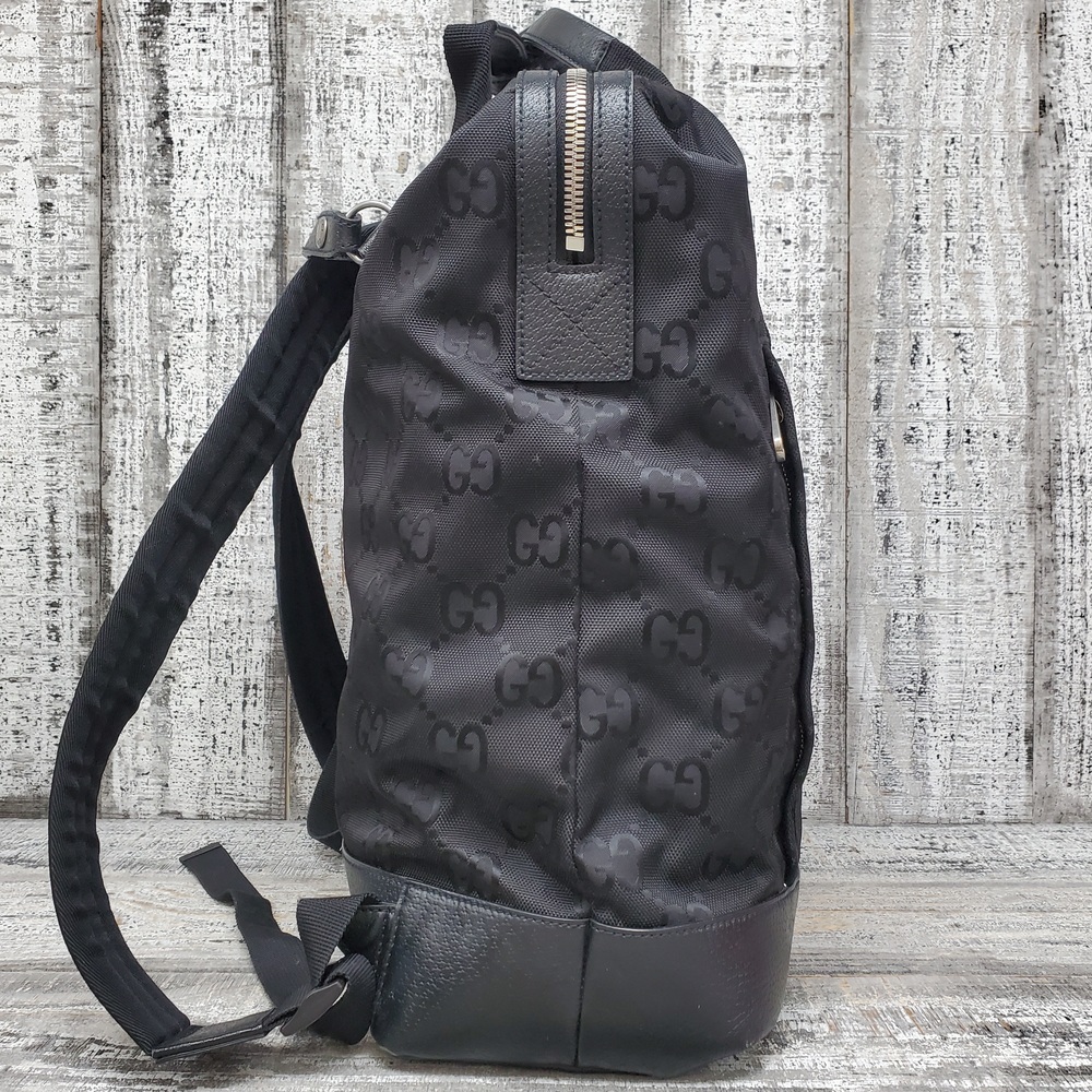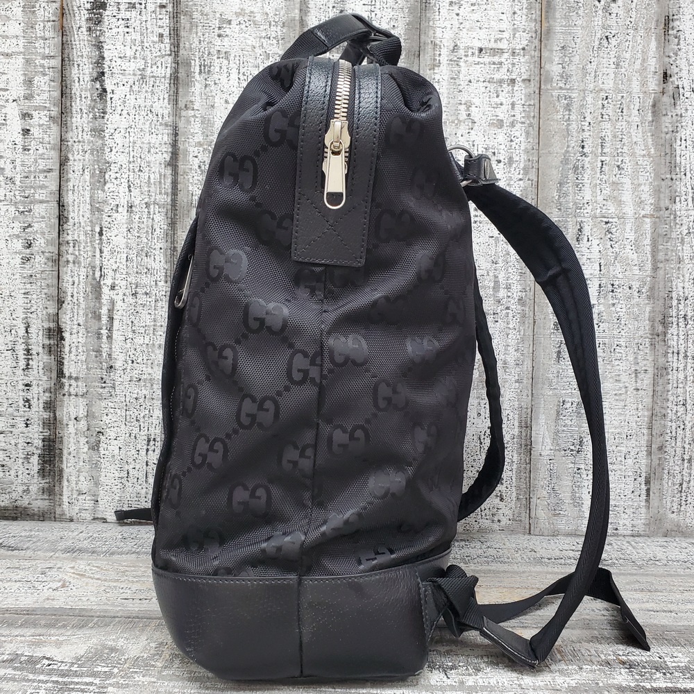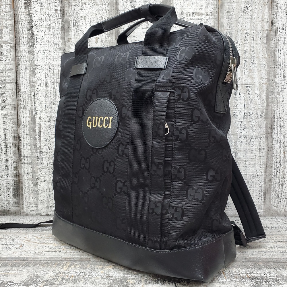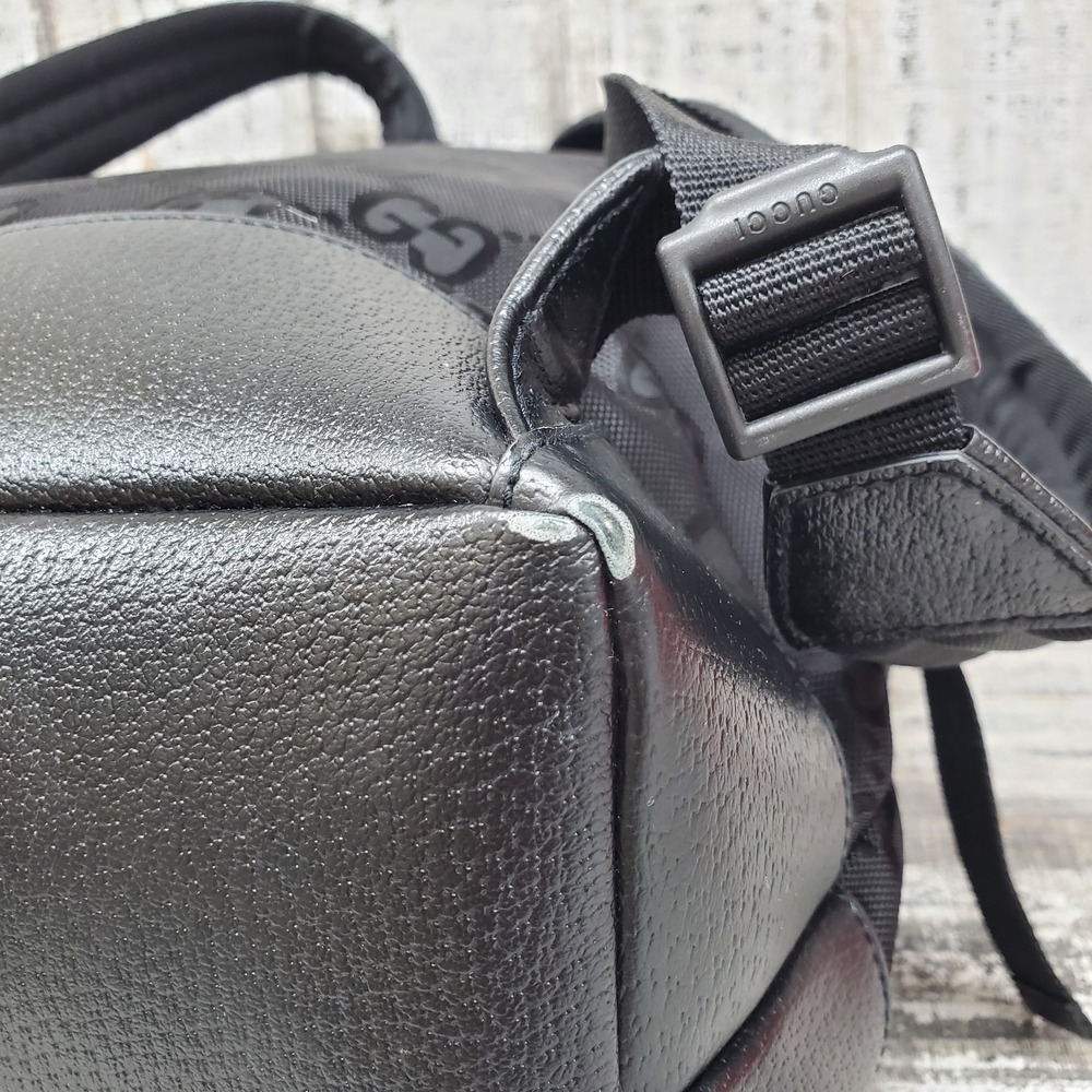 A gently used Gucci Off The Grid nylon bookbag, features minor wear, blending luxury and sustainability with stylish design in iconic Gucci patterns.