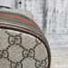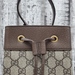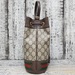 A compact, beige and ebony Gucci Ophidia bucket bag with GG Supreme pattern, complete with adjustable strap for versatile style and everyday luxury.